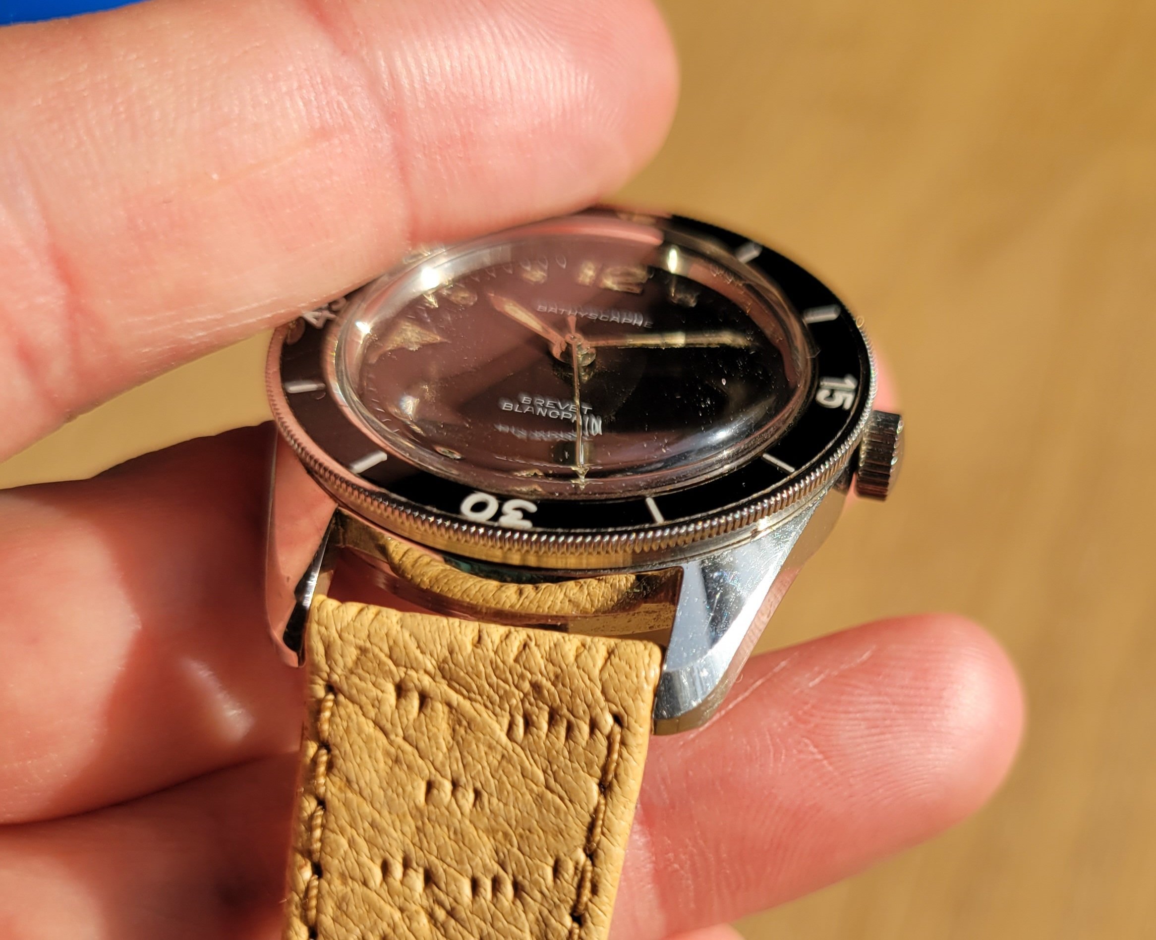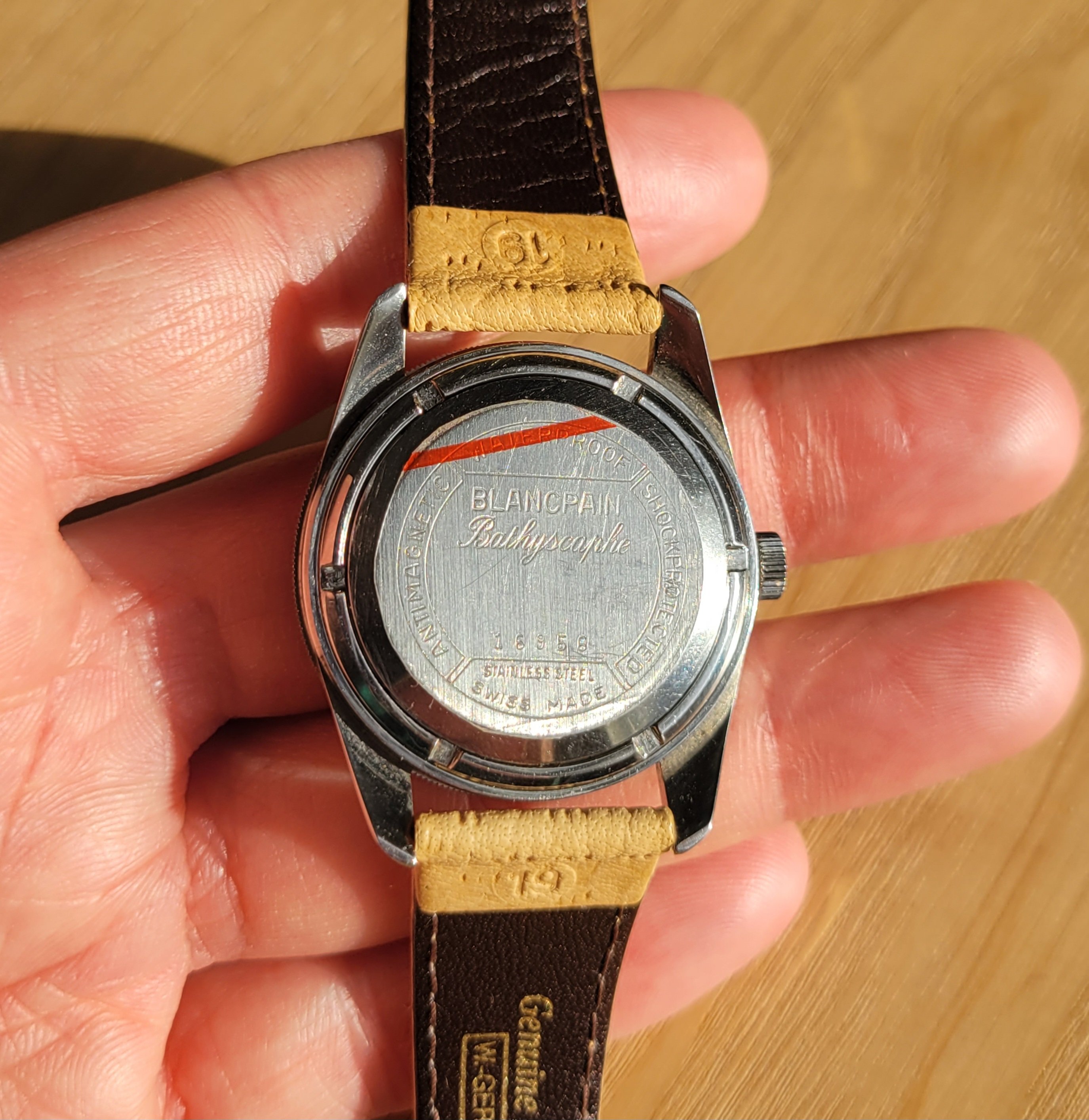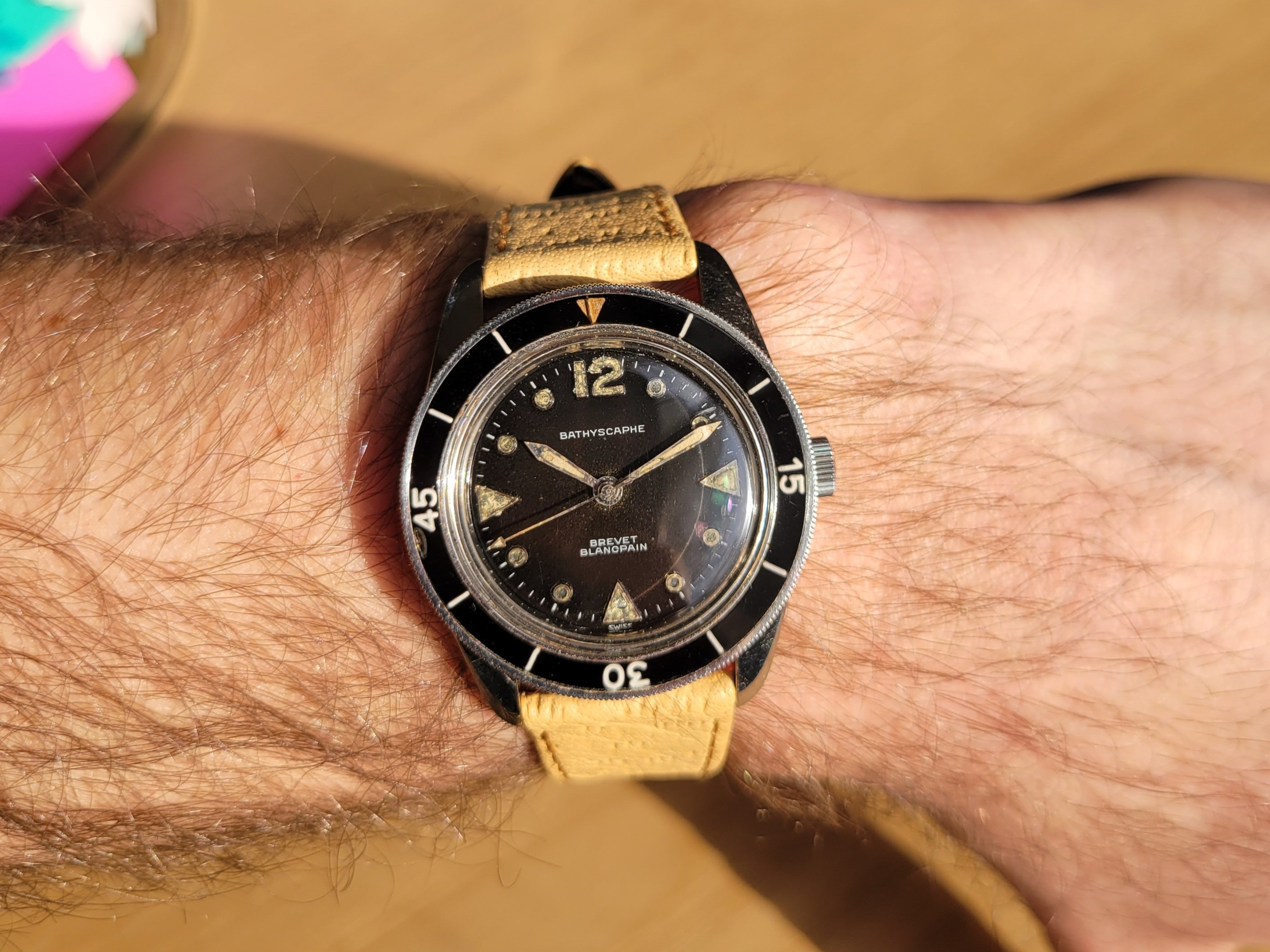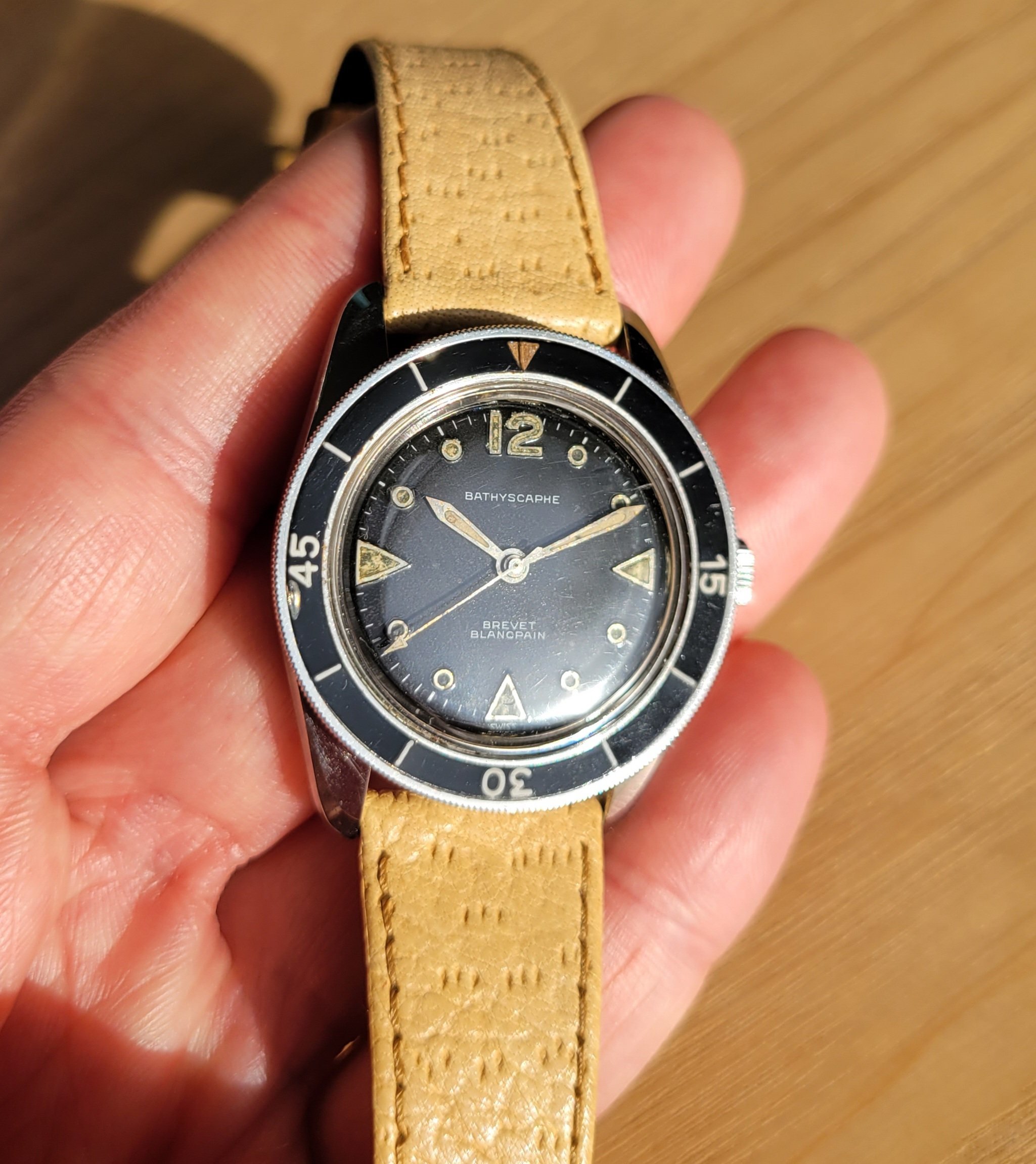 For sale is an original vintage Blancpain Bathyscaphe from the late 1950s. These watches are quite uncommon and not many examples survived over the years. I did an extensive write-up and registry here: https://omegaforums.net/threads/blancpain-bathyscaphe-mc4-arrival-and-registry.87992/