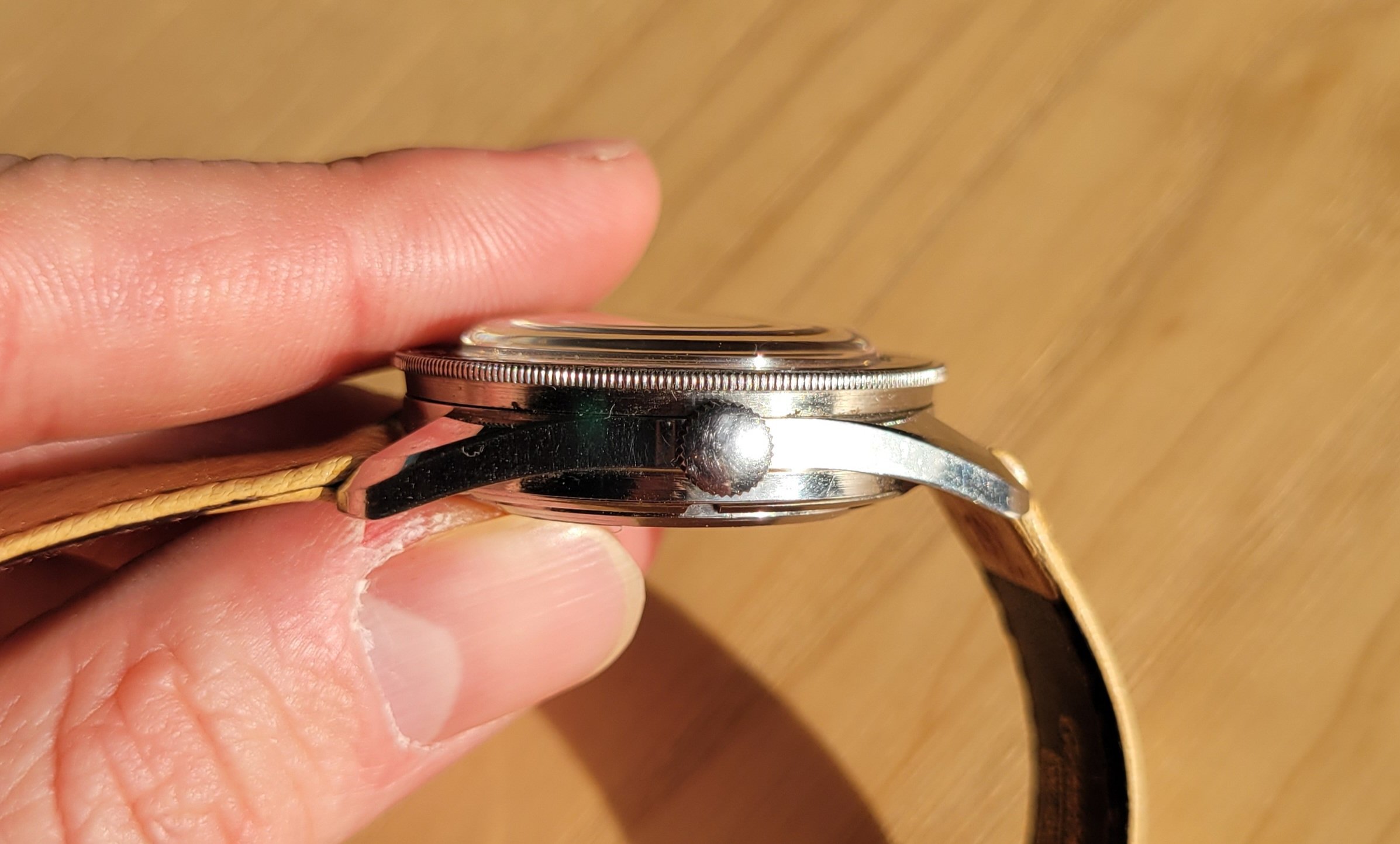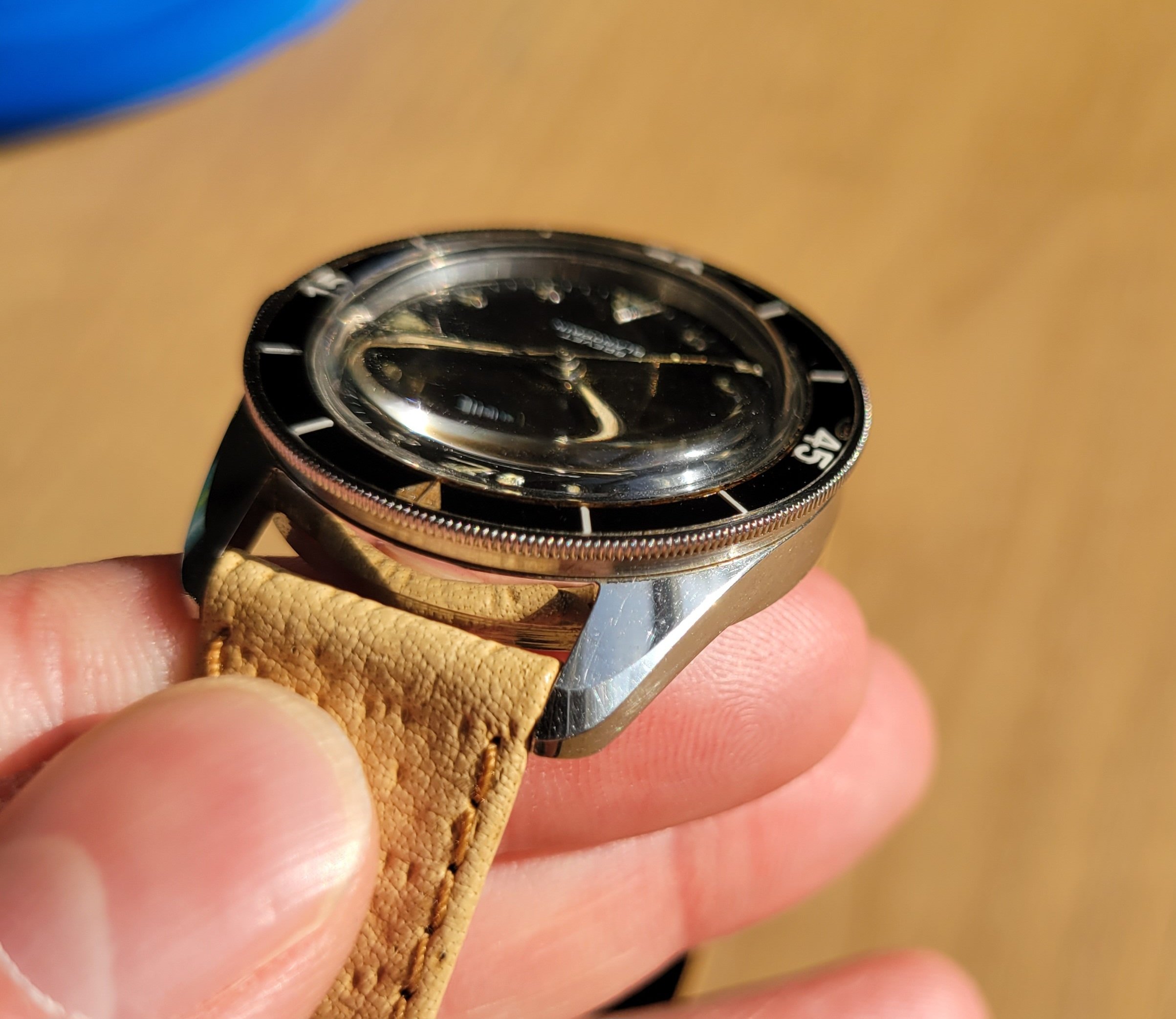 Bezel: Original bakelike bezel. Hairline crack in the triangle as 12. Small bubble near the 4 in "45." Bidirectional friction fit bezel rotates as it should.