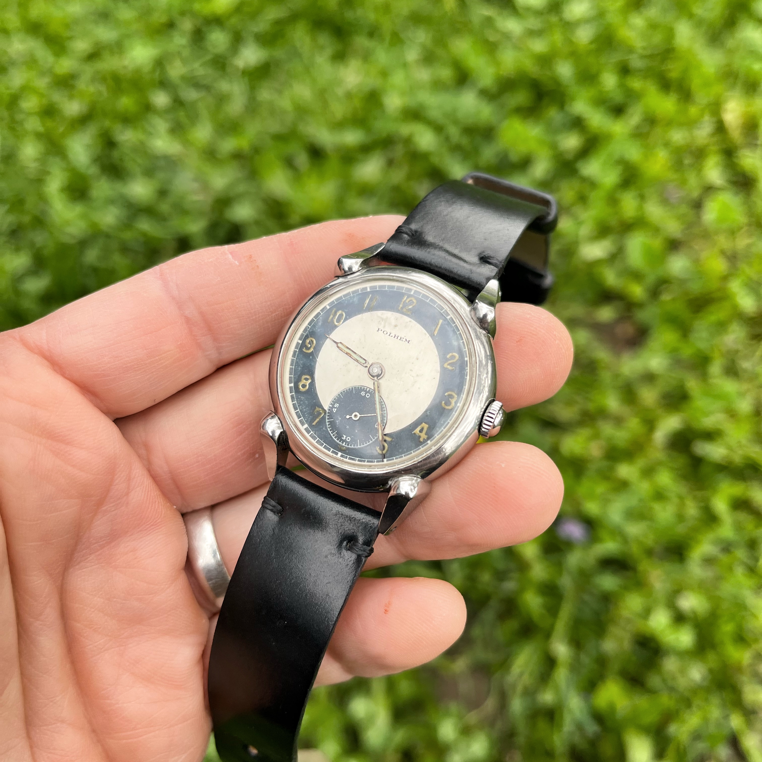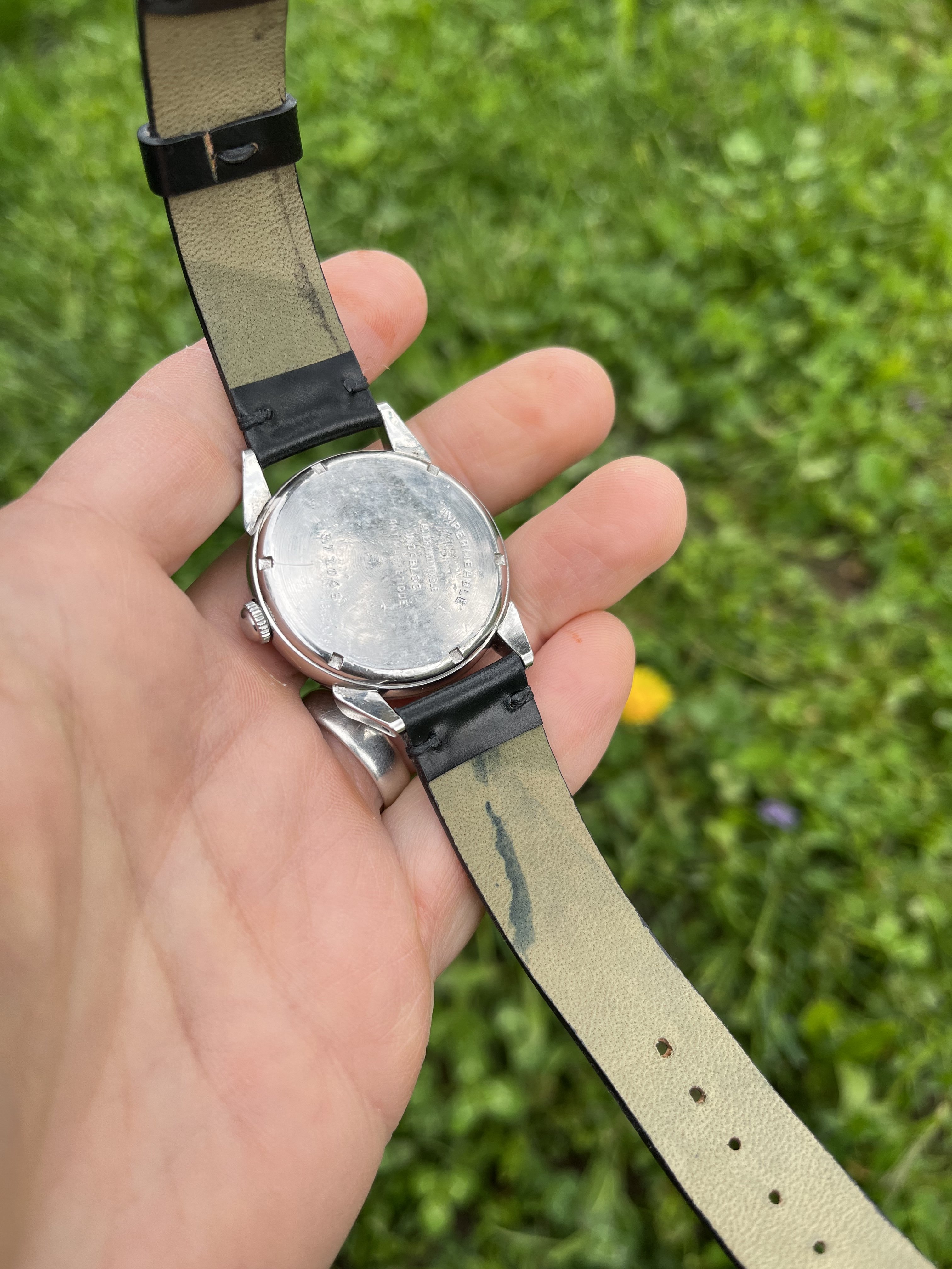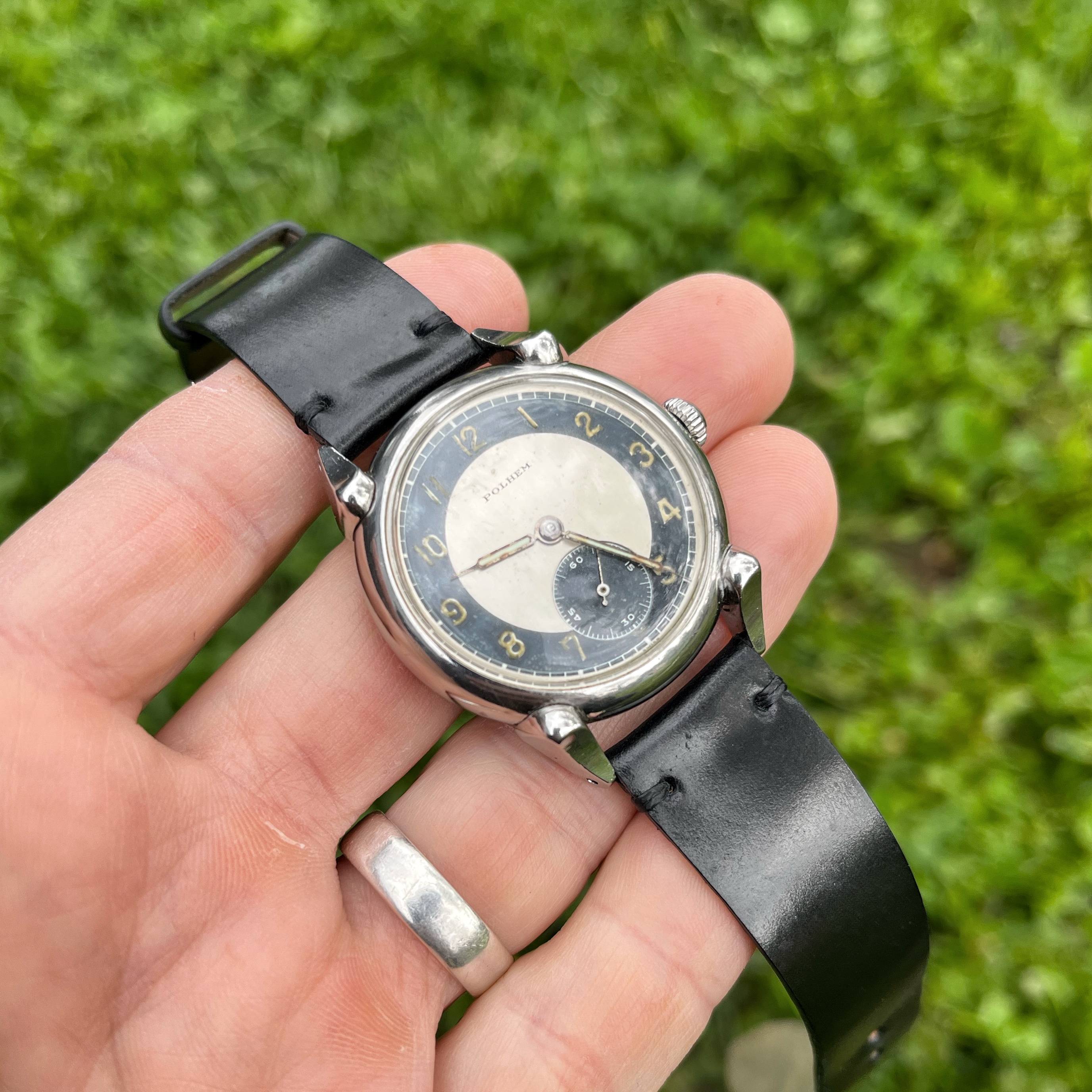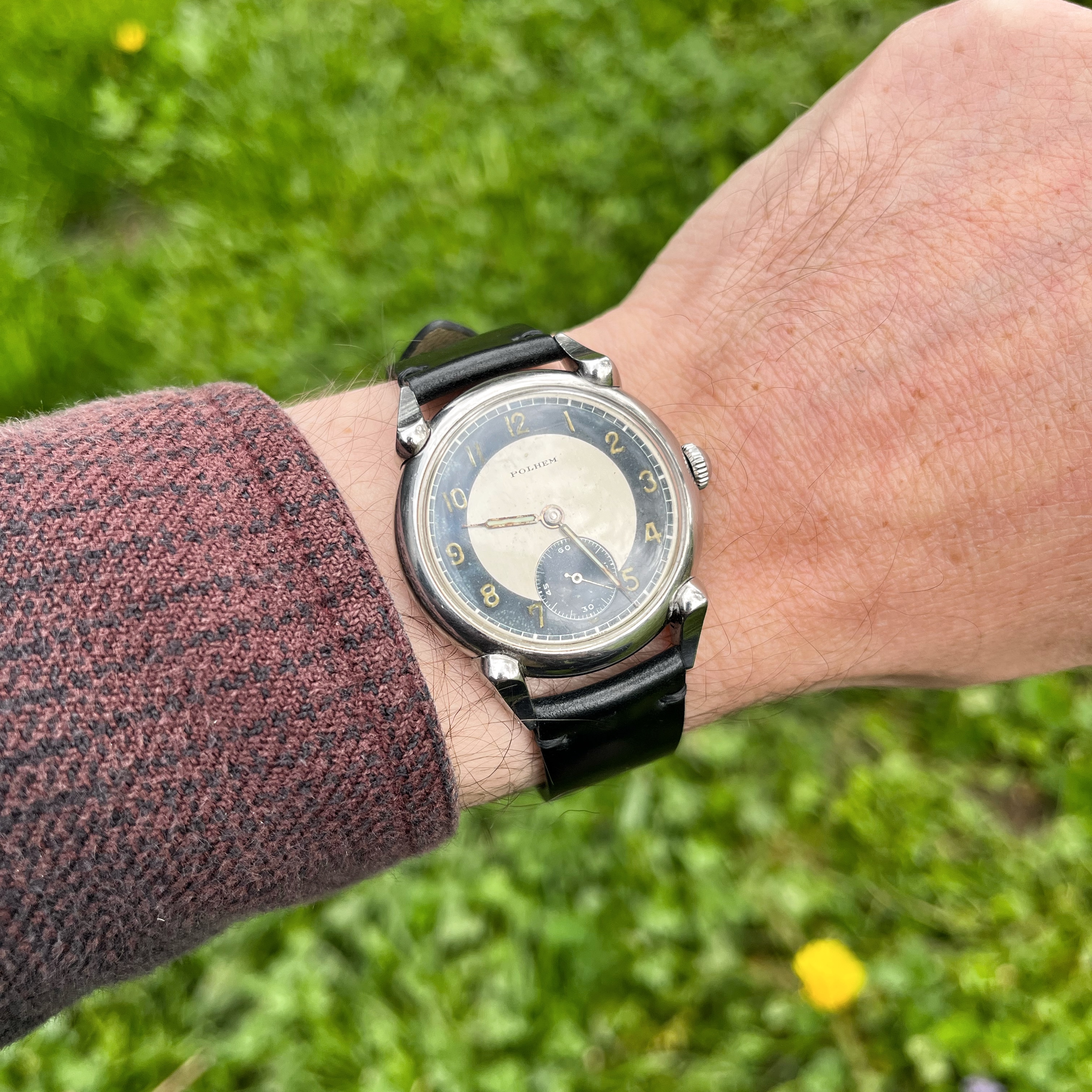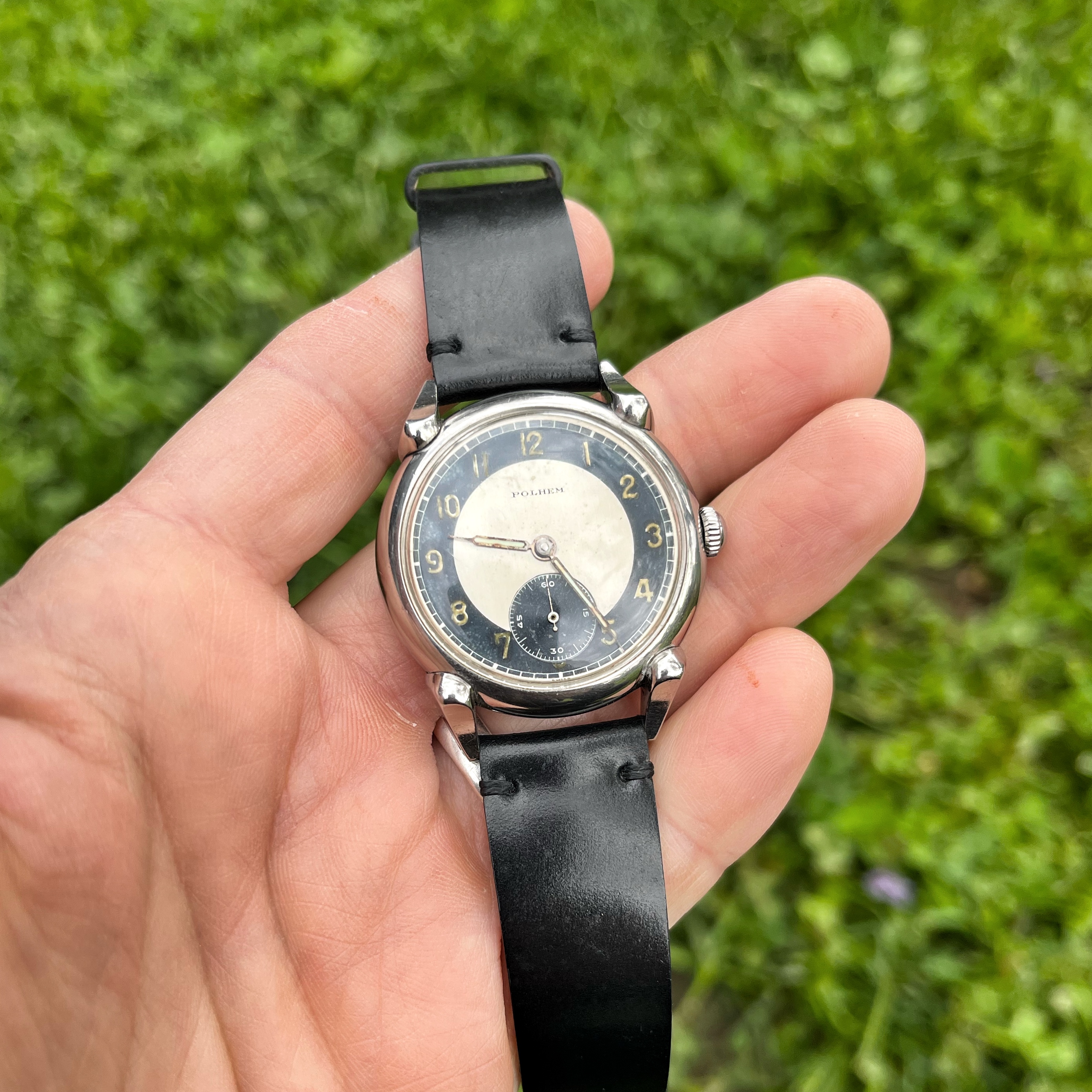 Hey guys. I have here this nice vintage Polhem. The watch is in a nice worn condition. The dog legs case has little dinks and scratches.The two tone bullseye dial looks great. Hands have corrosion. Glass has scratches. The watch is keeping excellent time but I have no idea when it was serviced last, so please keep this in mind.