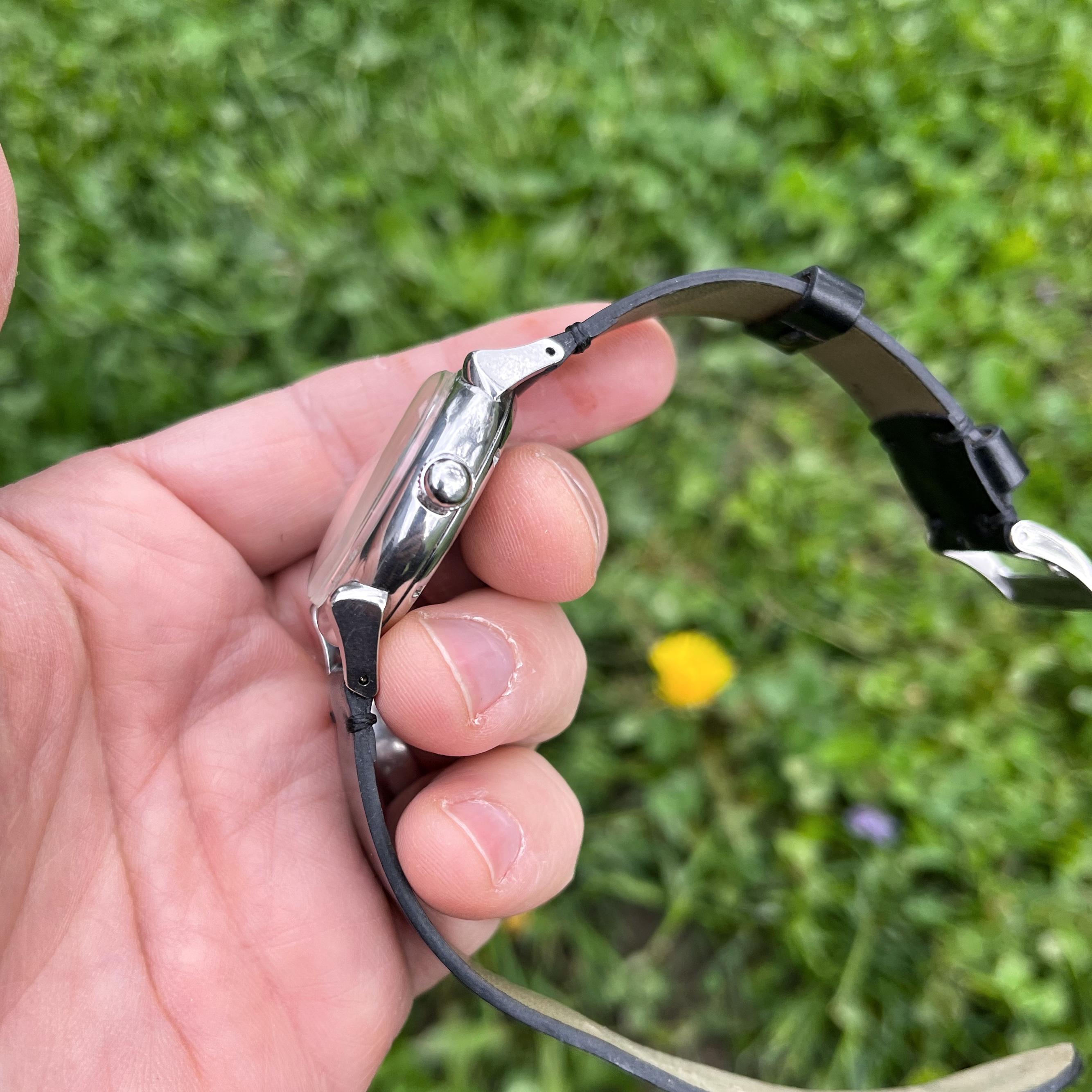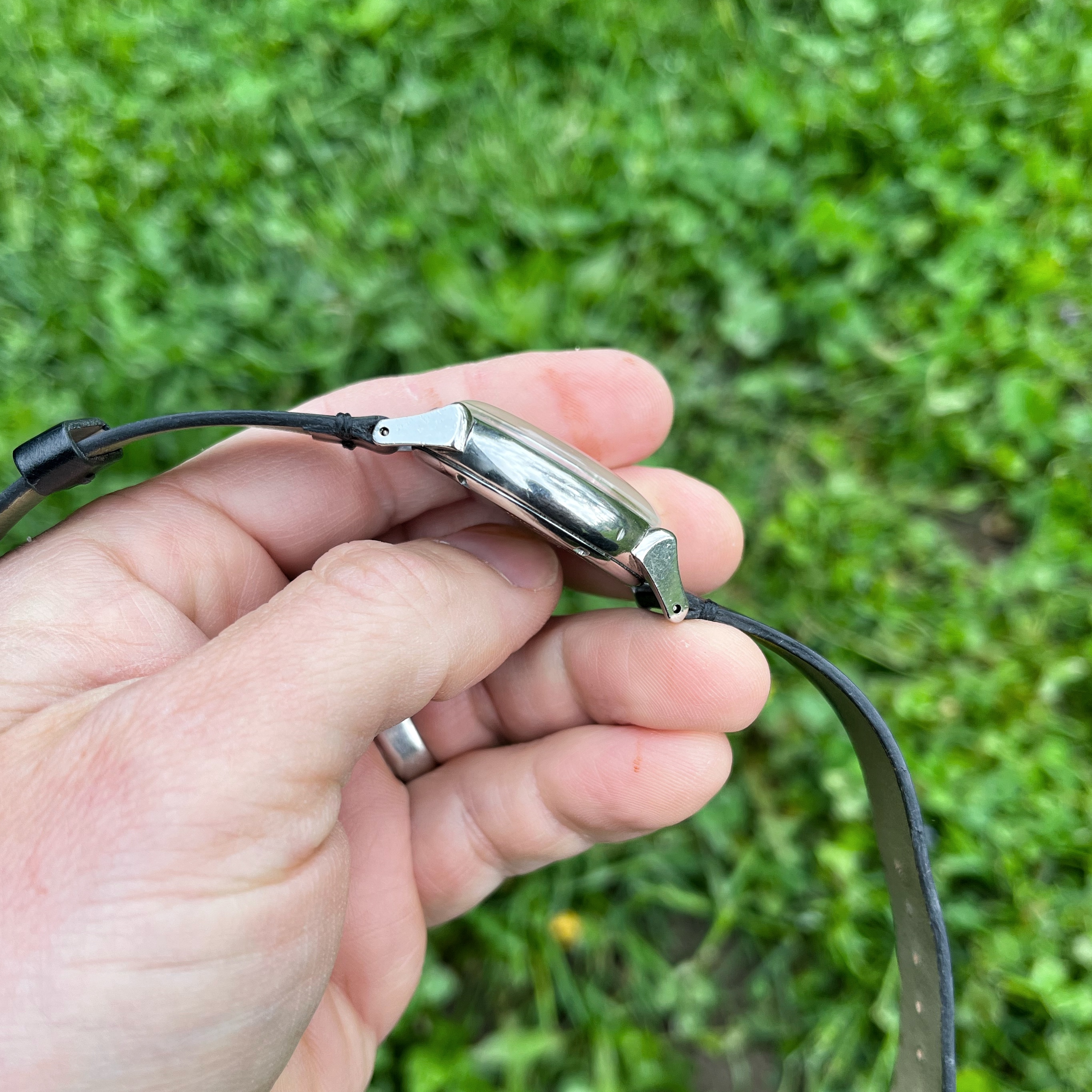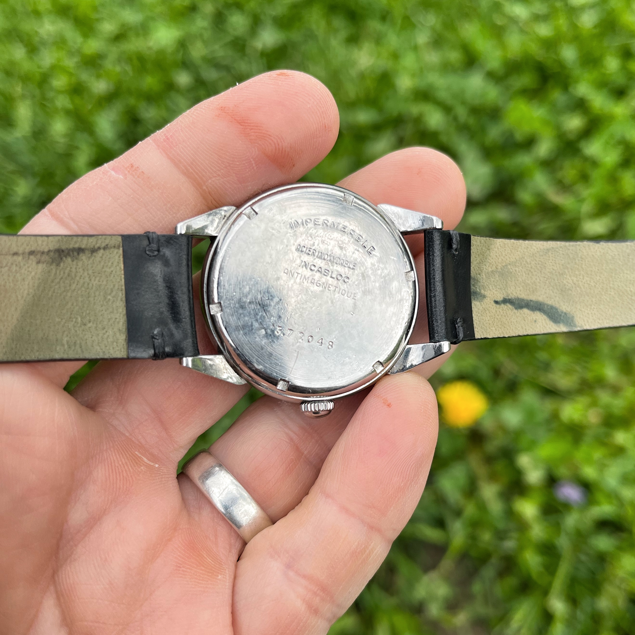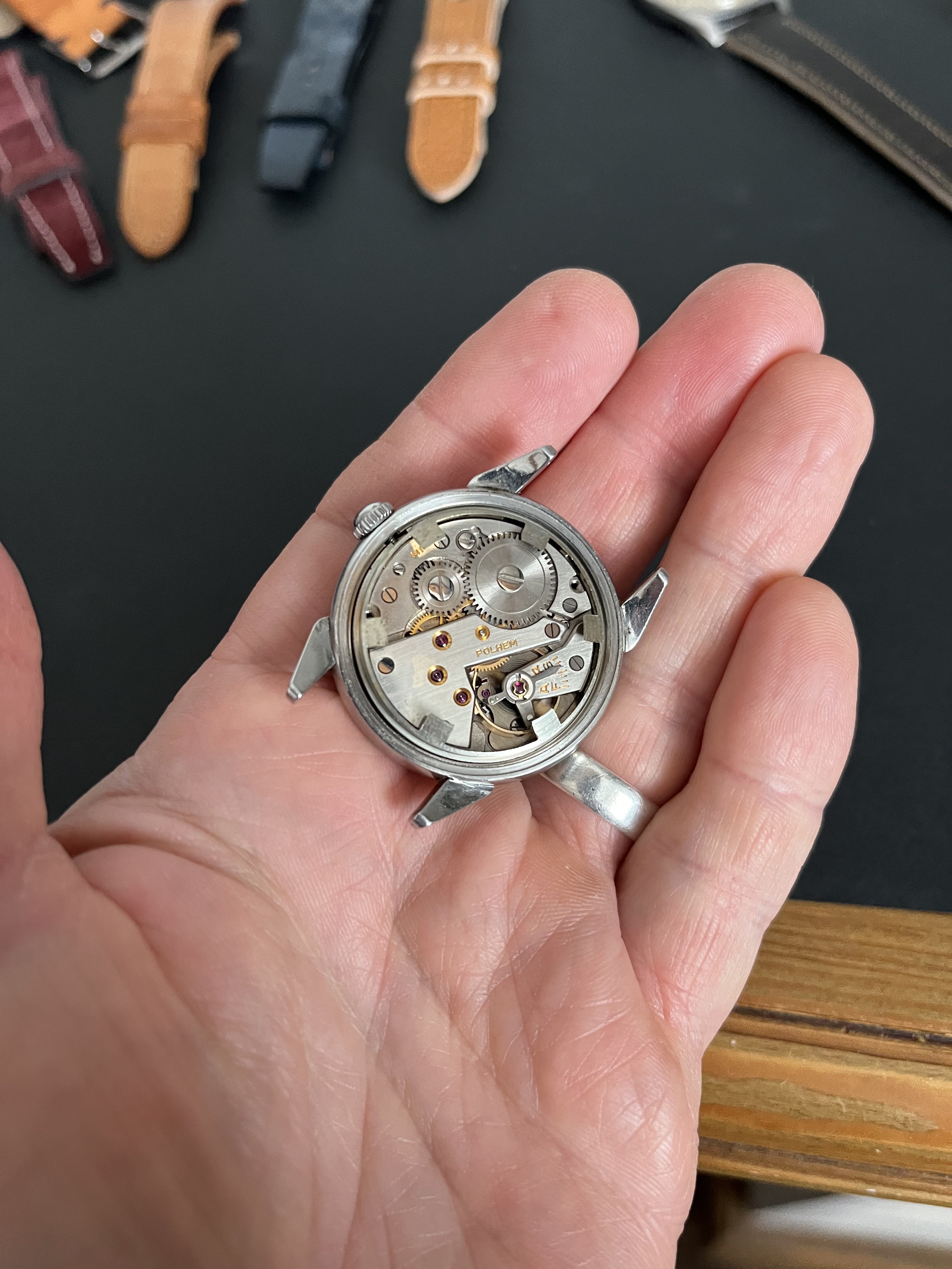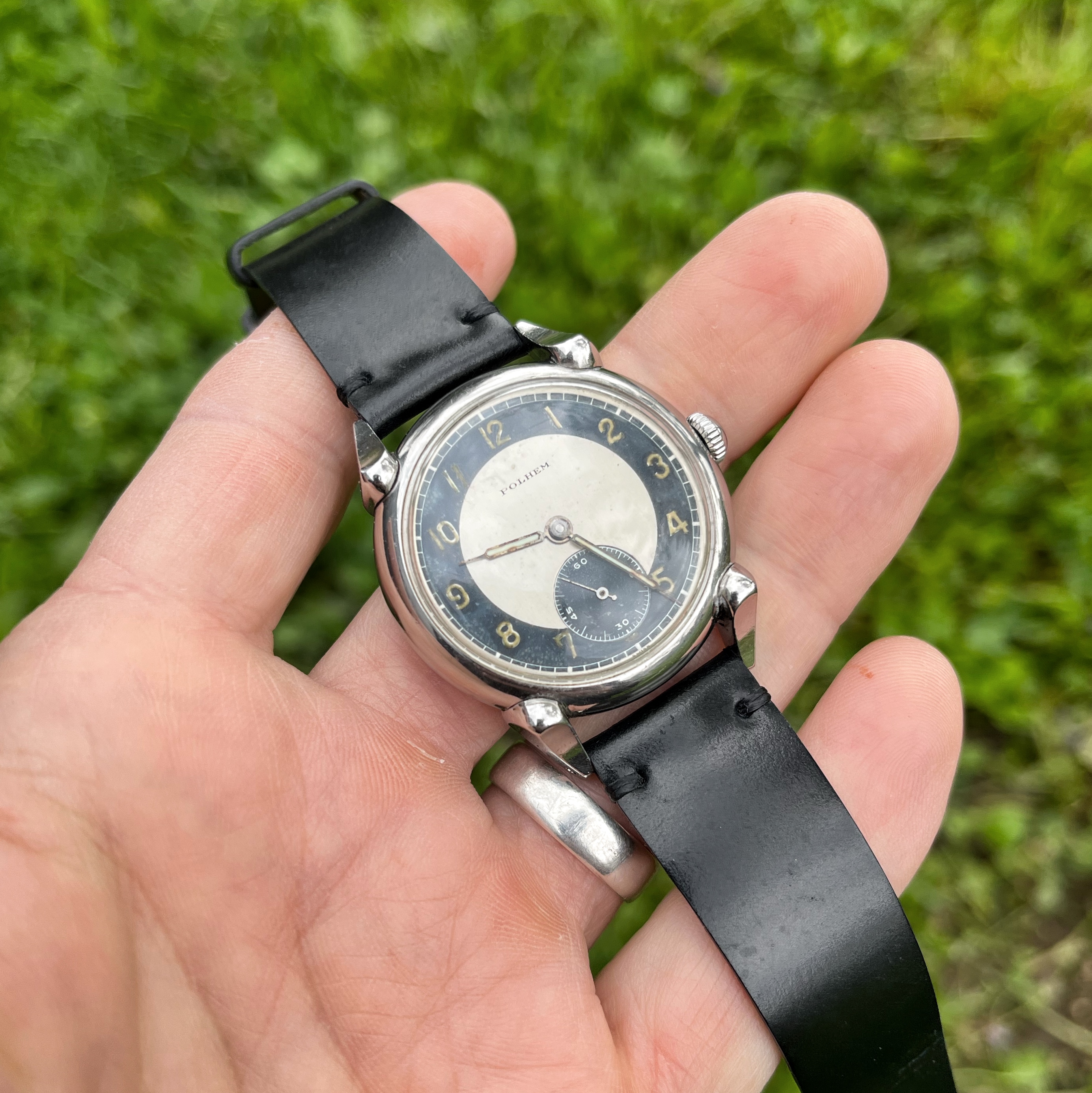 Hey guys. I have here this nice vintage Polhem. The watch is in a nice worn condition. The dog legs case has little dinks and scratches.The two tone bullseye dial looks great. Hands have corrosion. Glass has scratches. The watch is keeping excellent time but I have no idea when it was serviced last, so please keep this in mind.