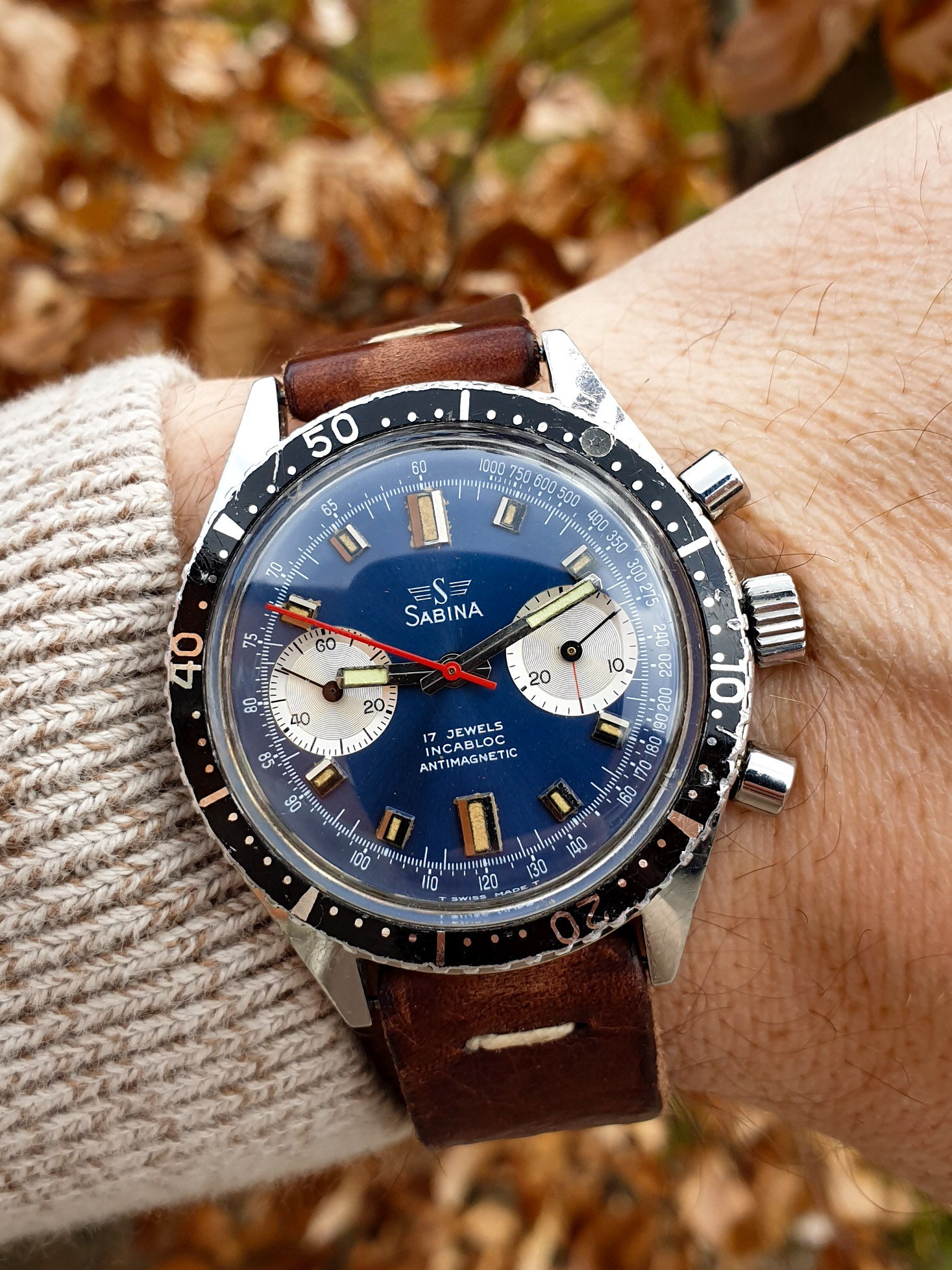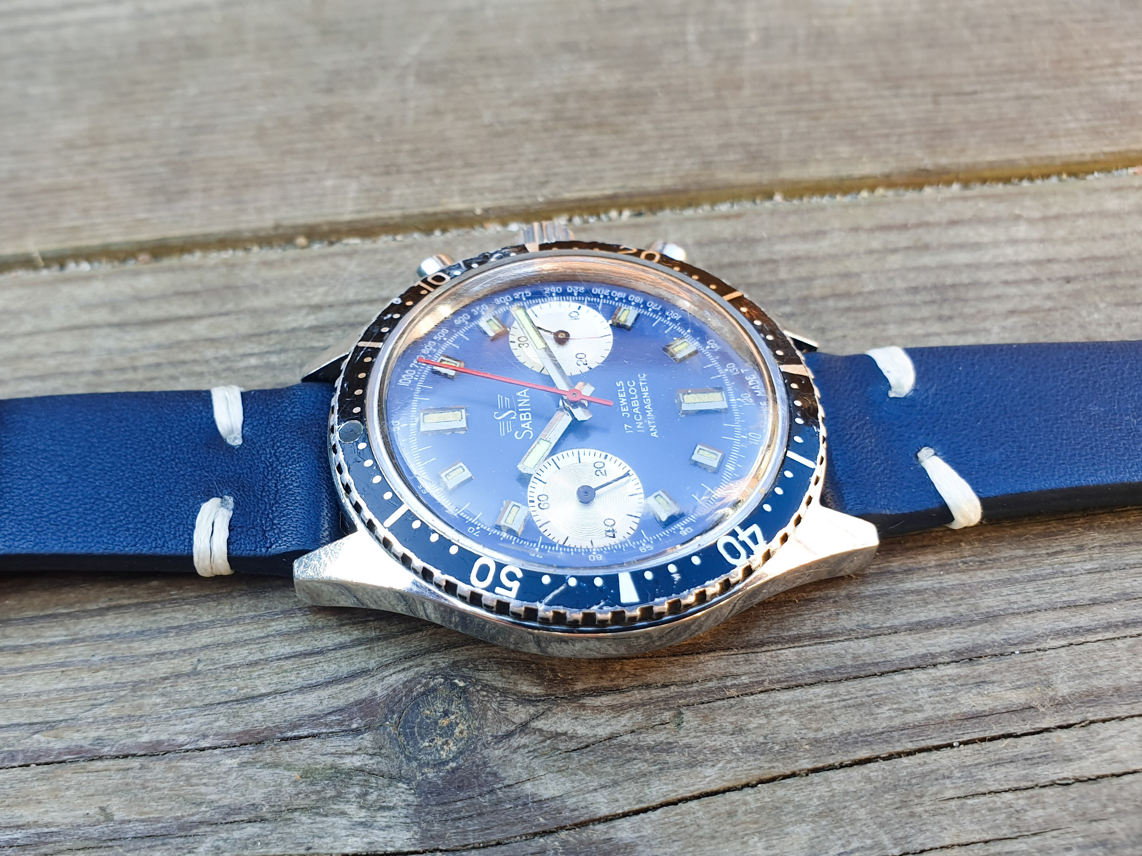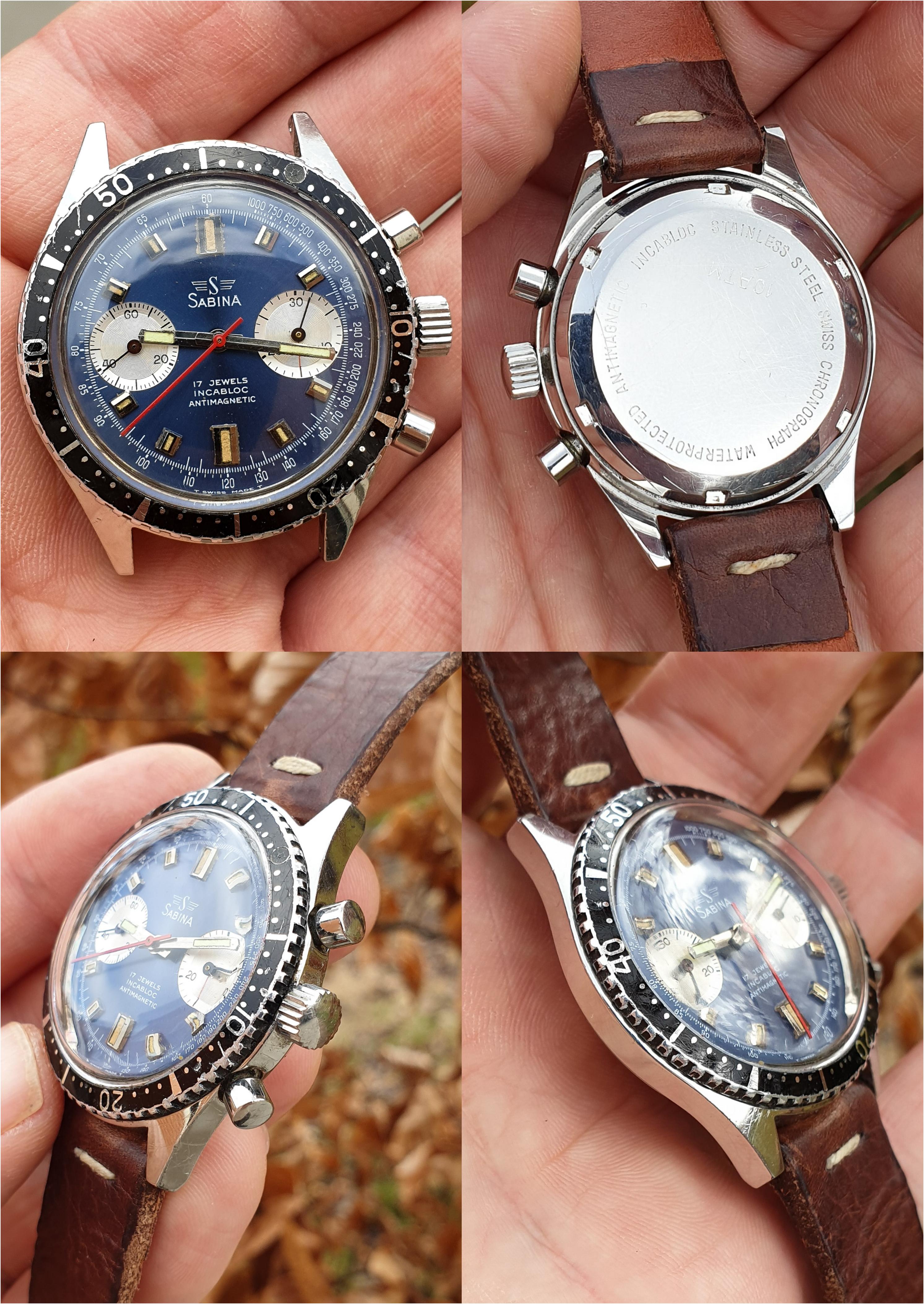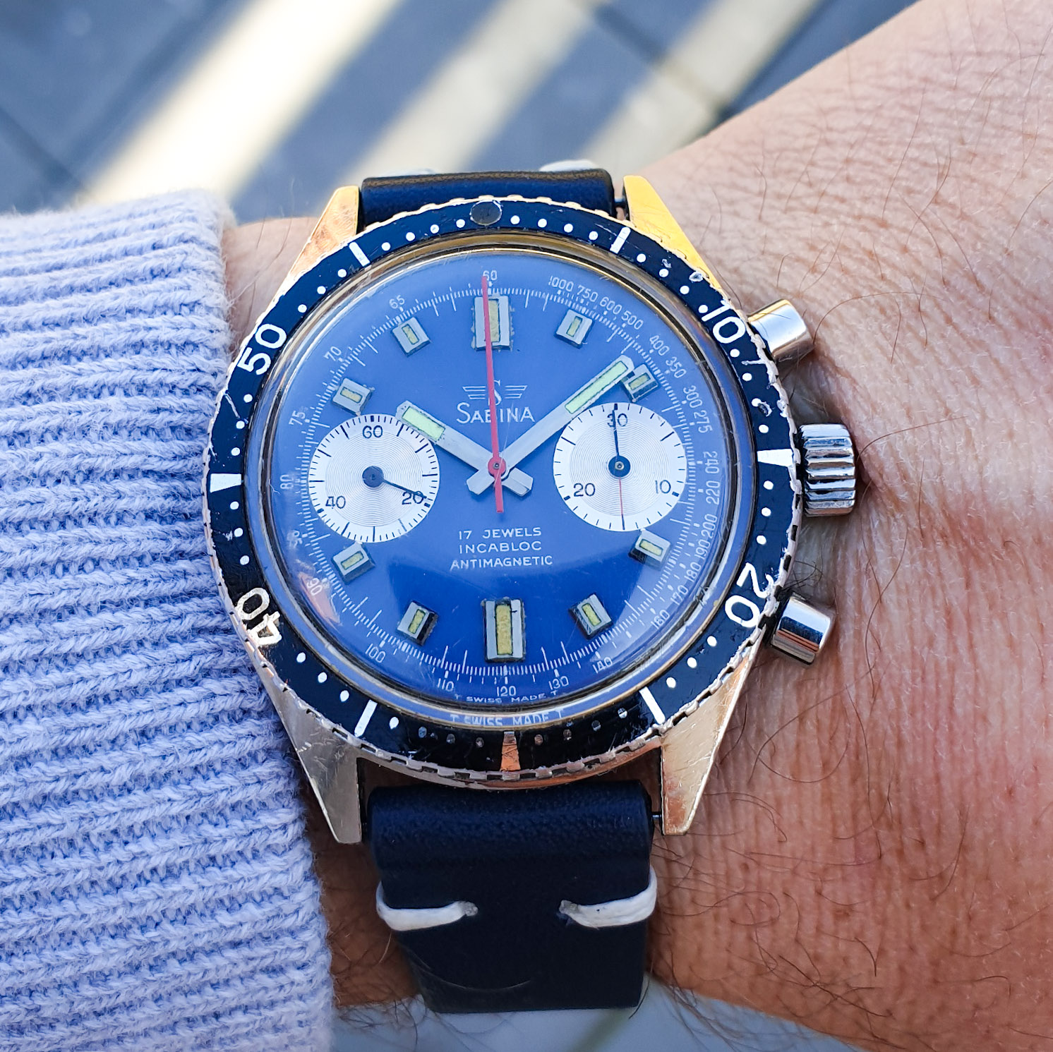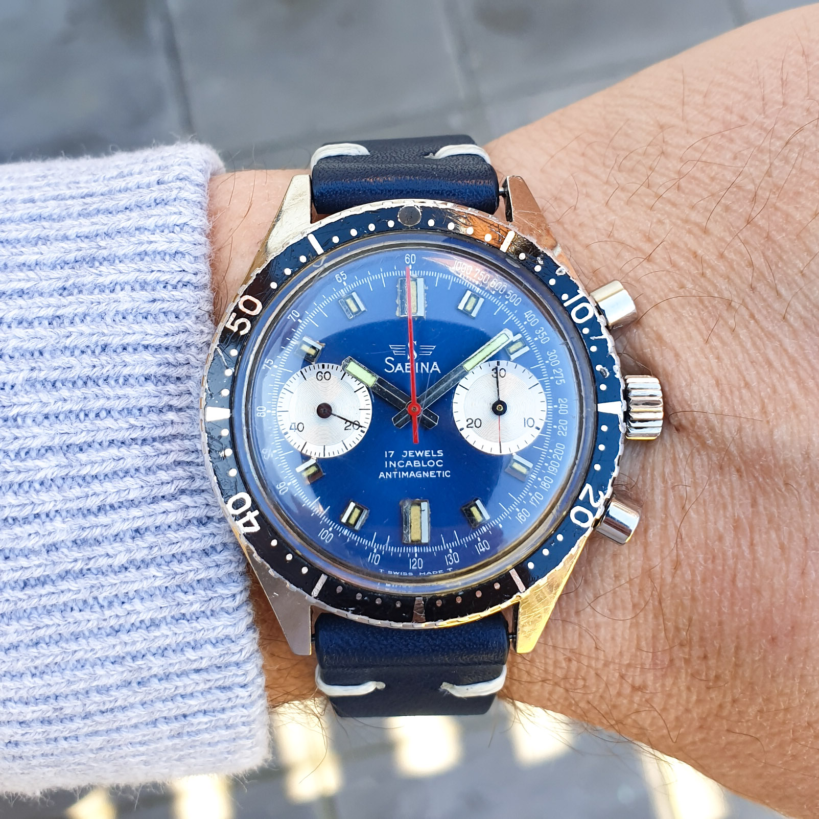 For sale is this very cool looking vintage Sabina Chronograph with beautiful blue reverse panda dial. Sharp stainless steel case (39 mm) in good unpolished condition. Movement is famous Valjoux 7733 and all chrono functions are working well. Movement looks nice and clean and it was serviced ones in my possession about 2.5 years ago.