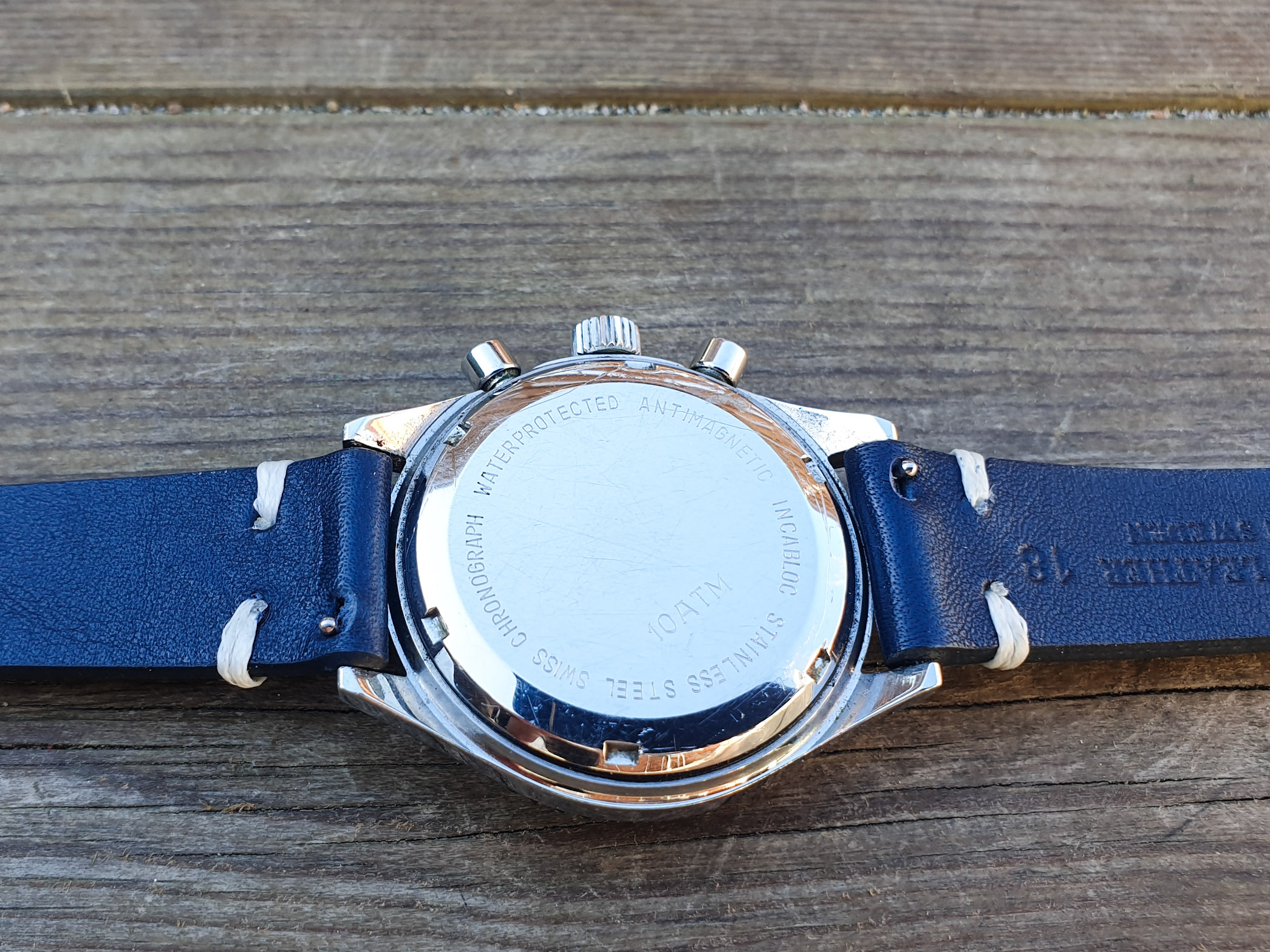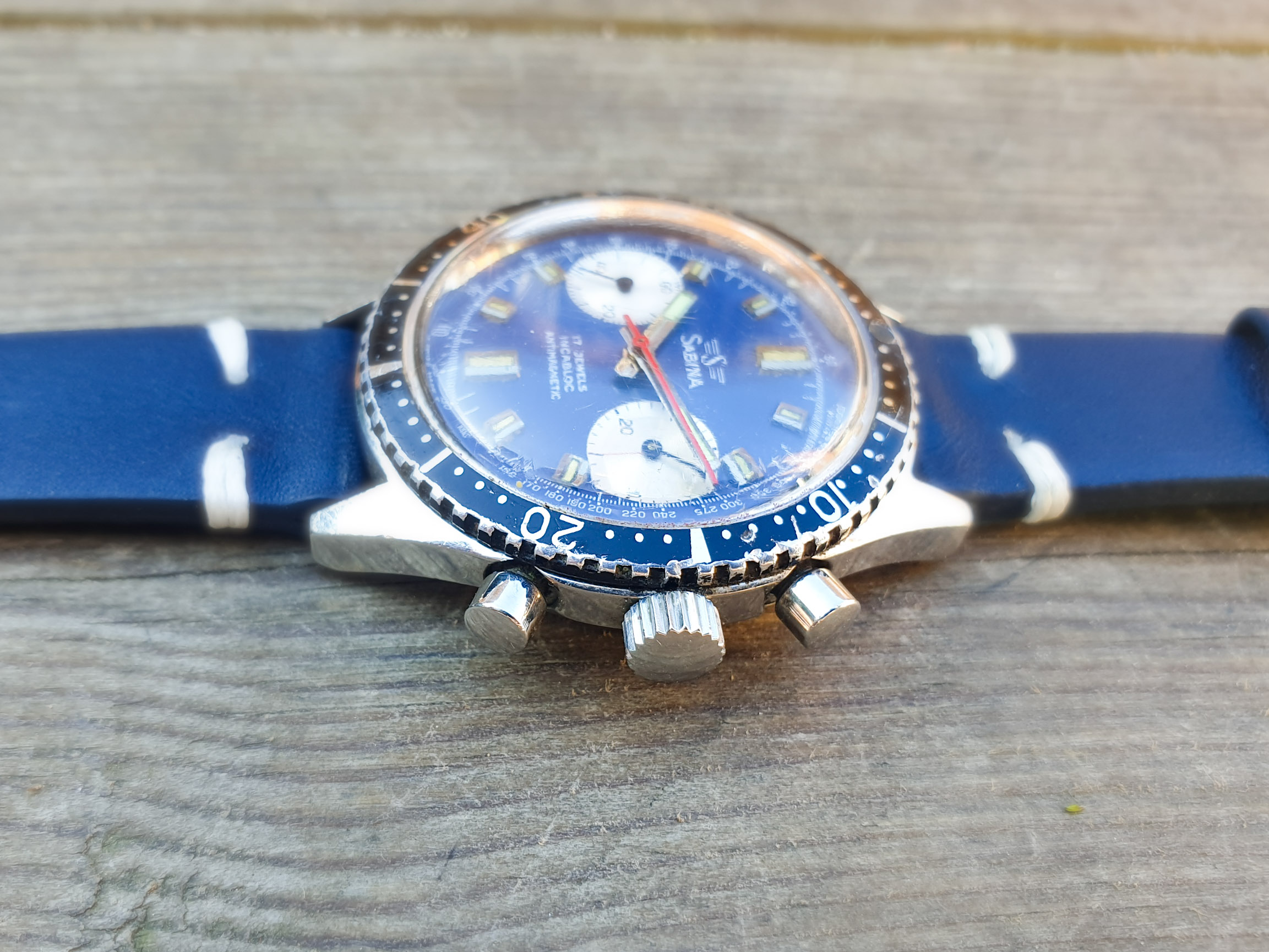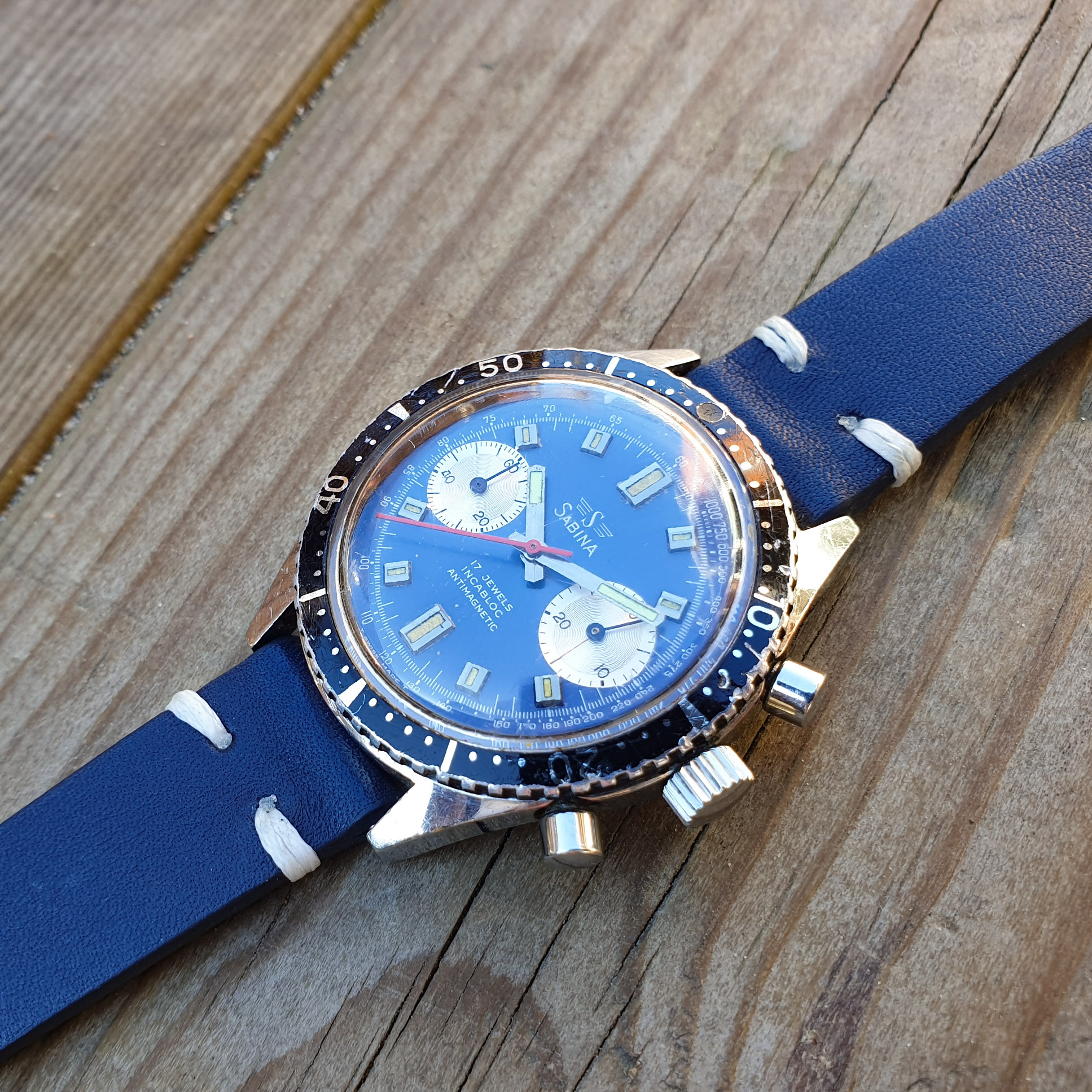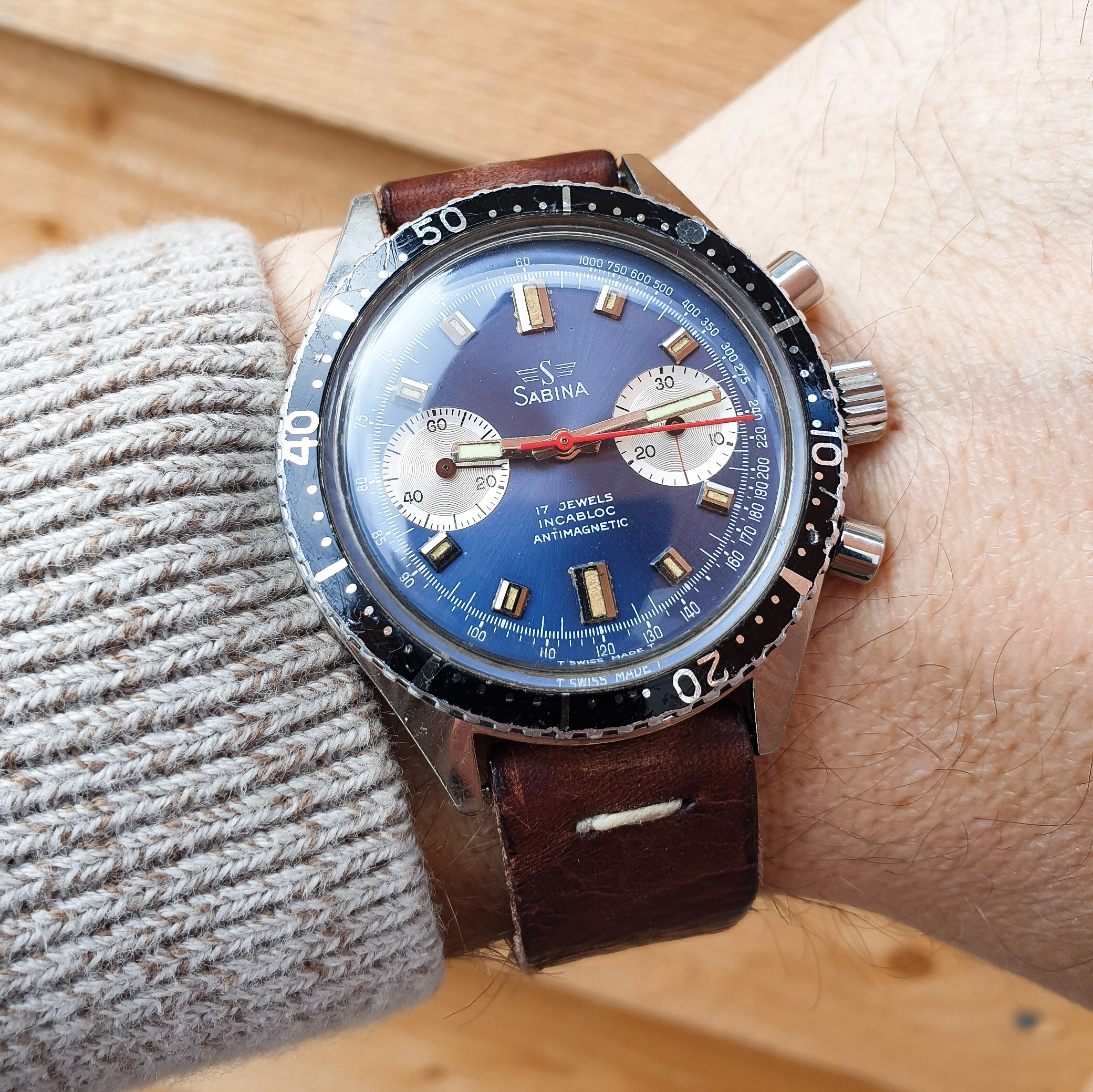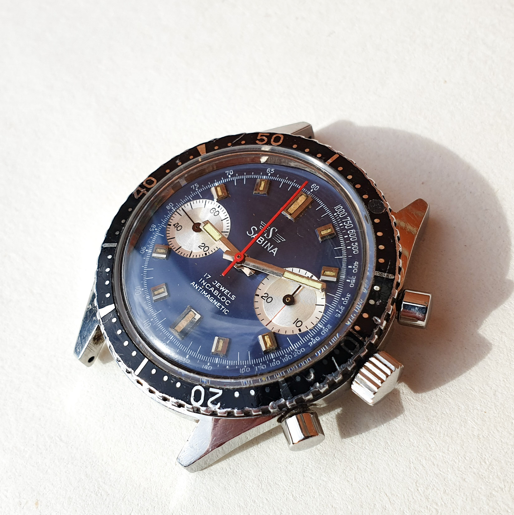 For sale is this very cool looking vintage Sabina Chronograph with beautiful blue reverse panda dial. Sharp stainless steel case (39 mm) in good unpolished condition. Movement is famous Valjoux 7733 and all chrono functions are working well. Movement looks nice and clean and it was serviced ones in my possession about 2.5 years ago.