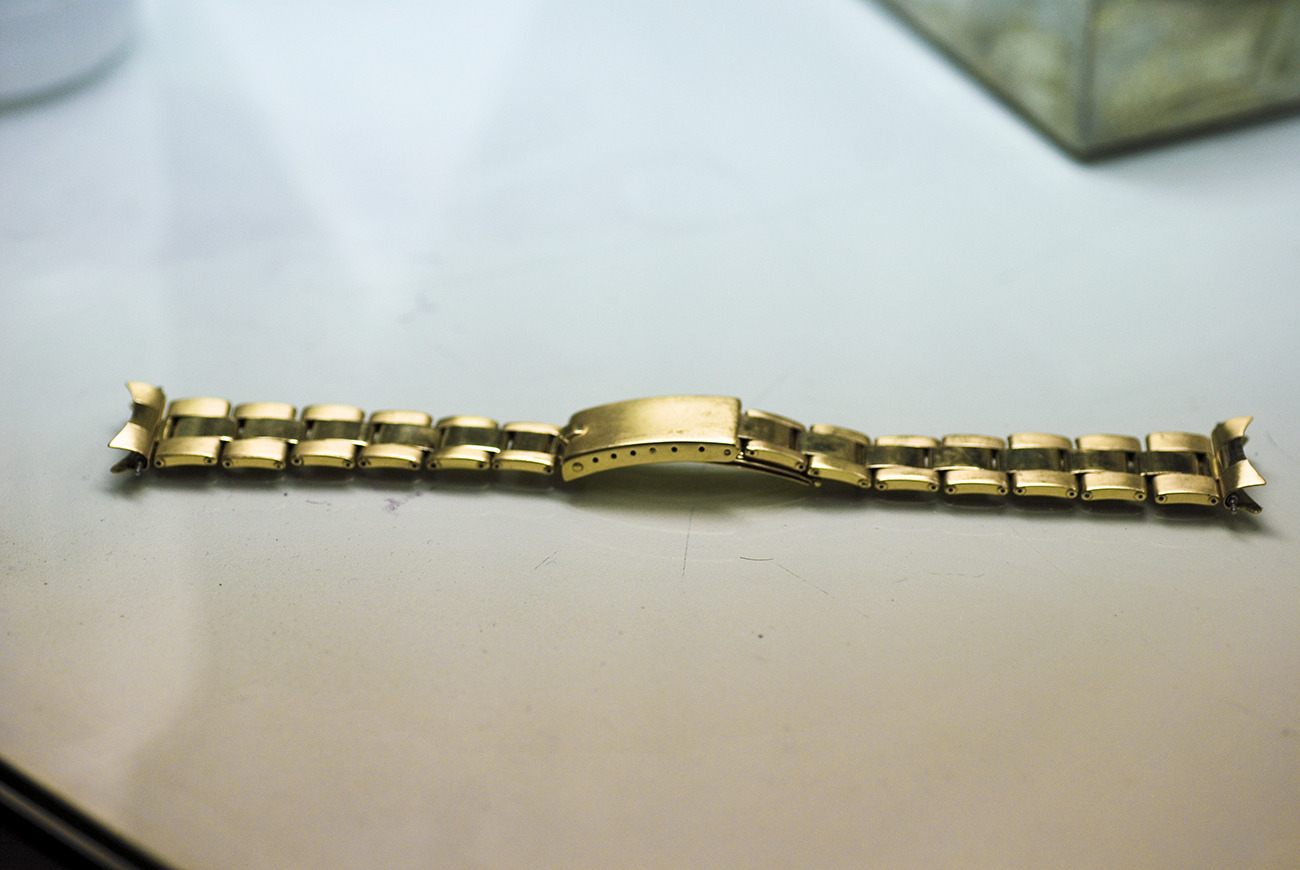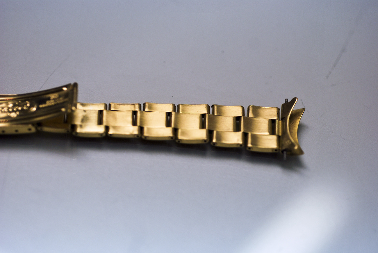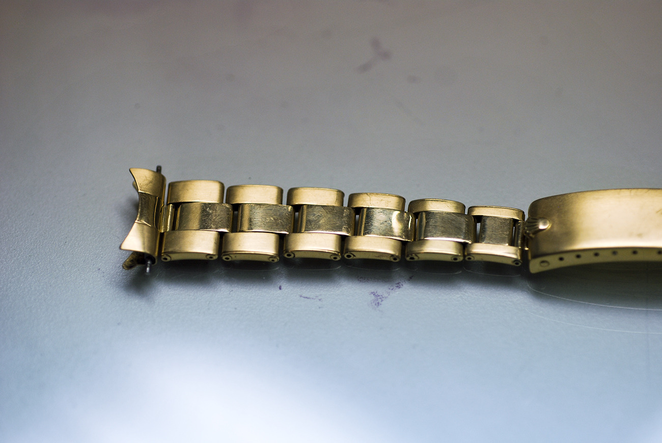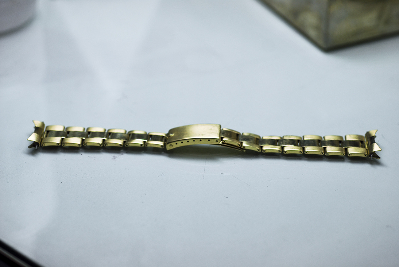 Rivet band is tight and keeps its original adjustment. Shows damage on a link, clearly visible. 7+6 links!
