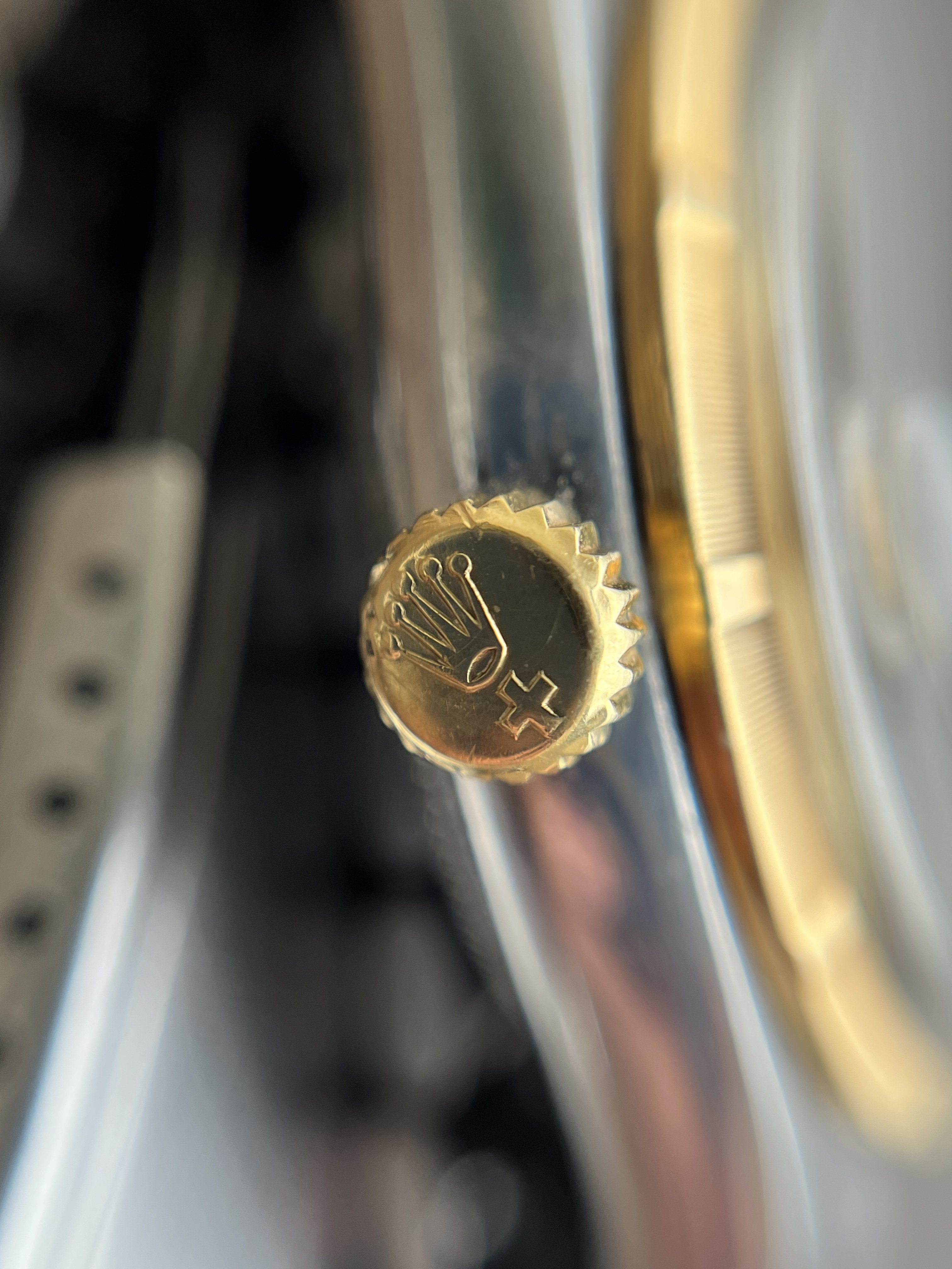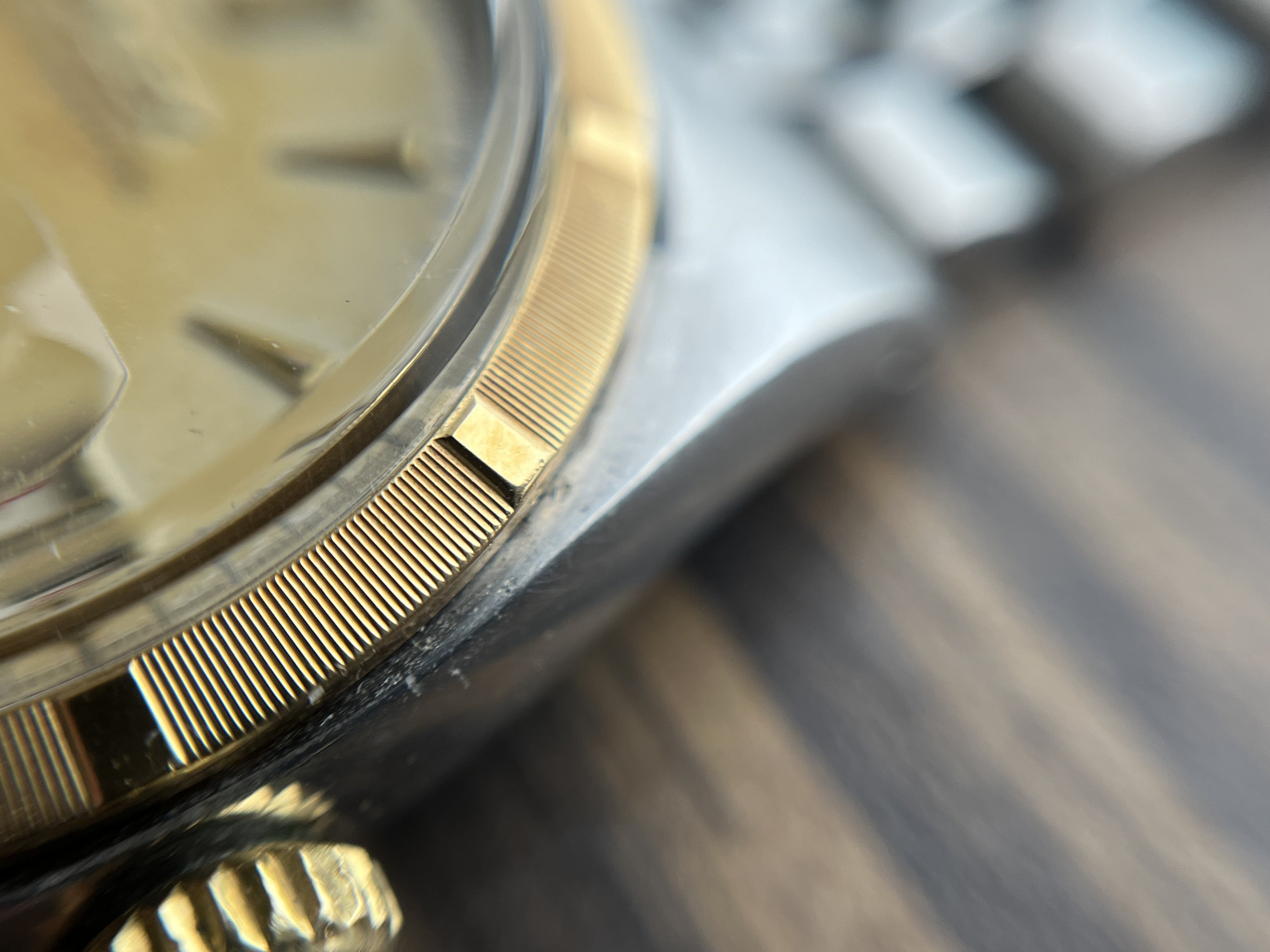 The 18k yellow gold bezel is incredibly sharp (see macro photo).