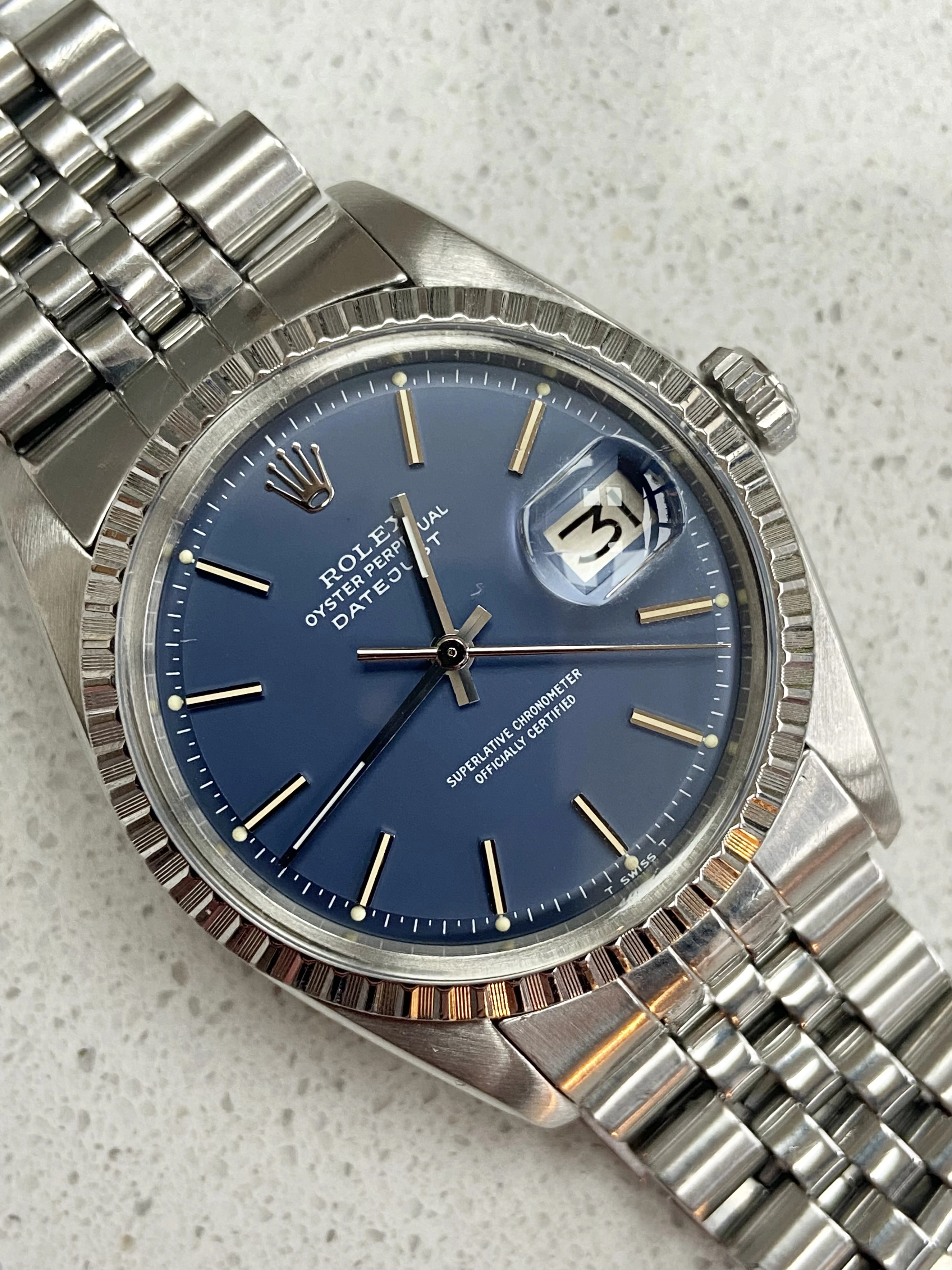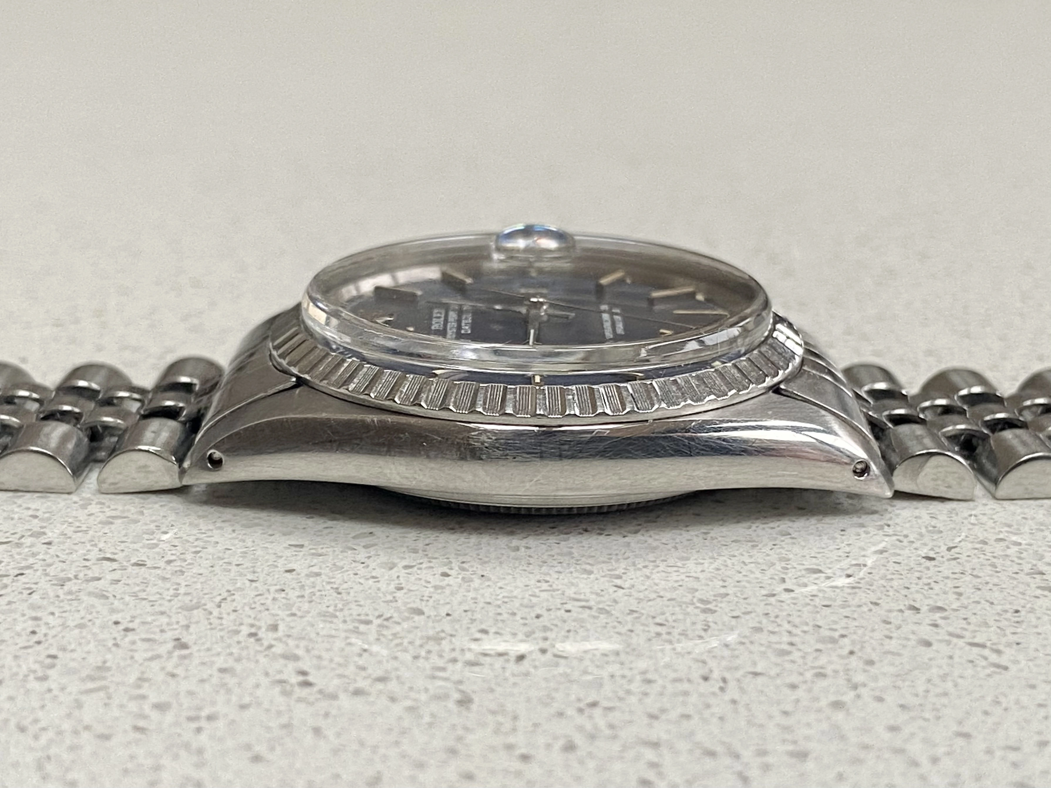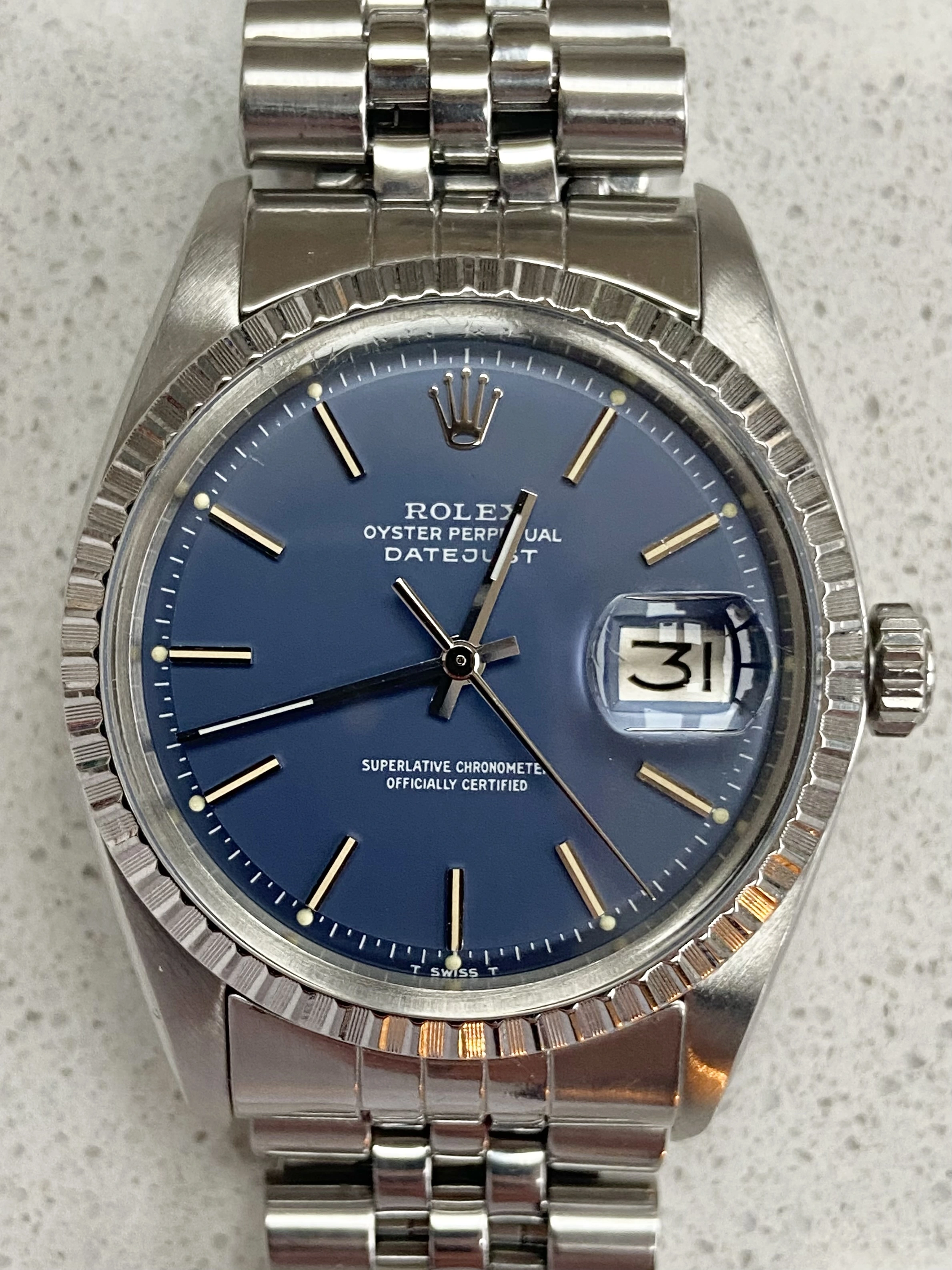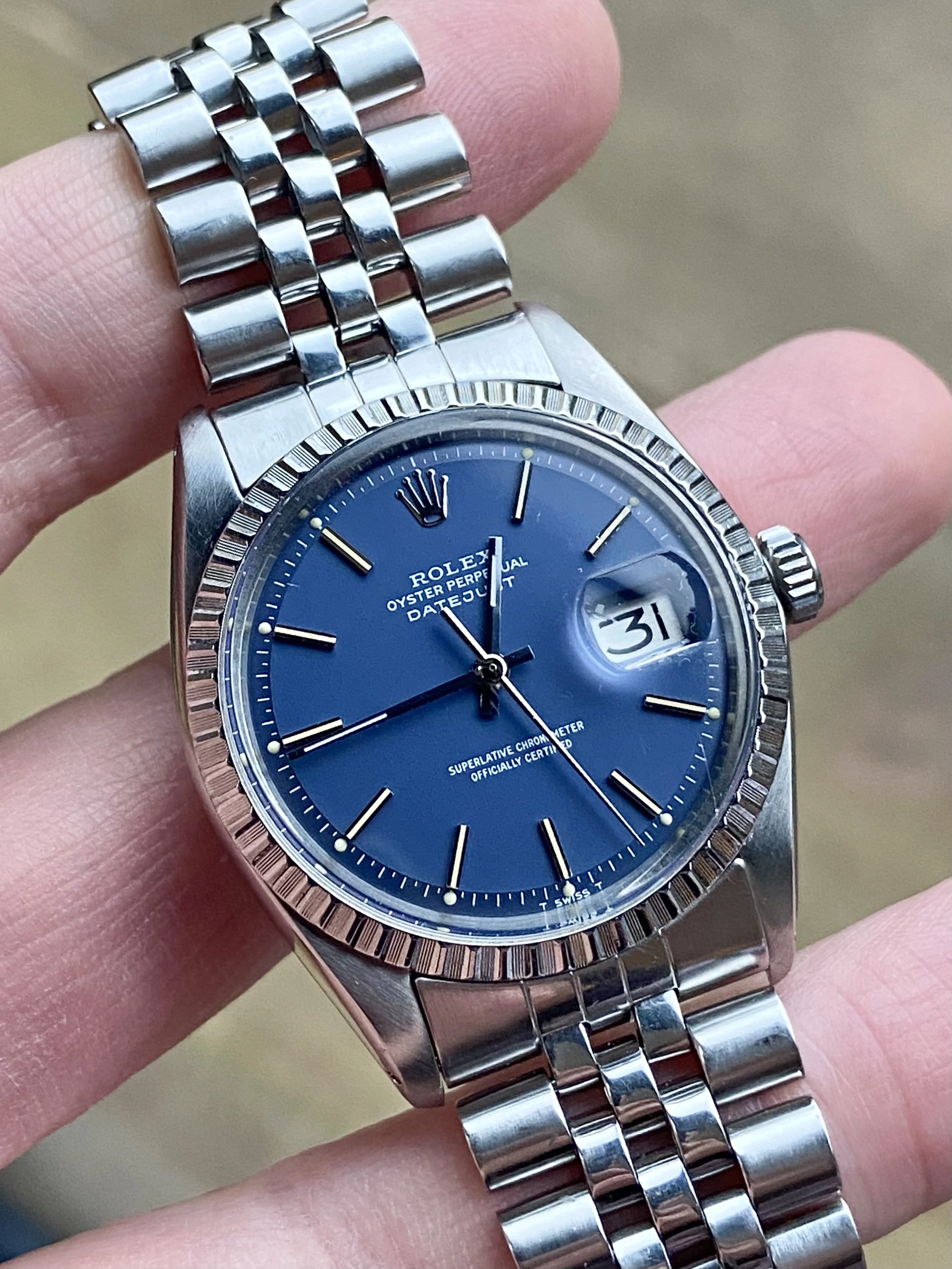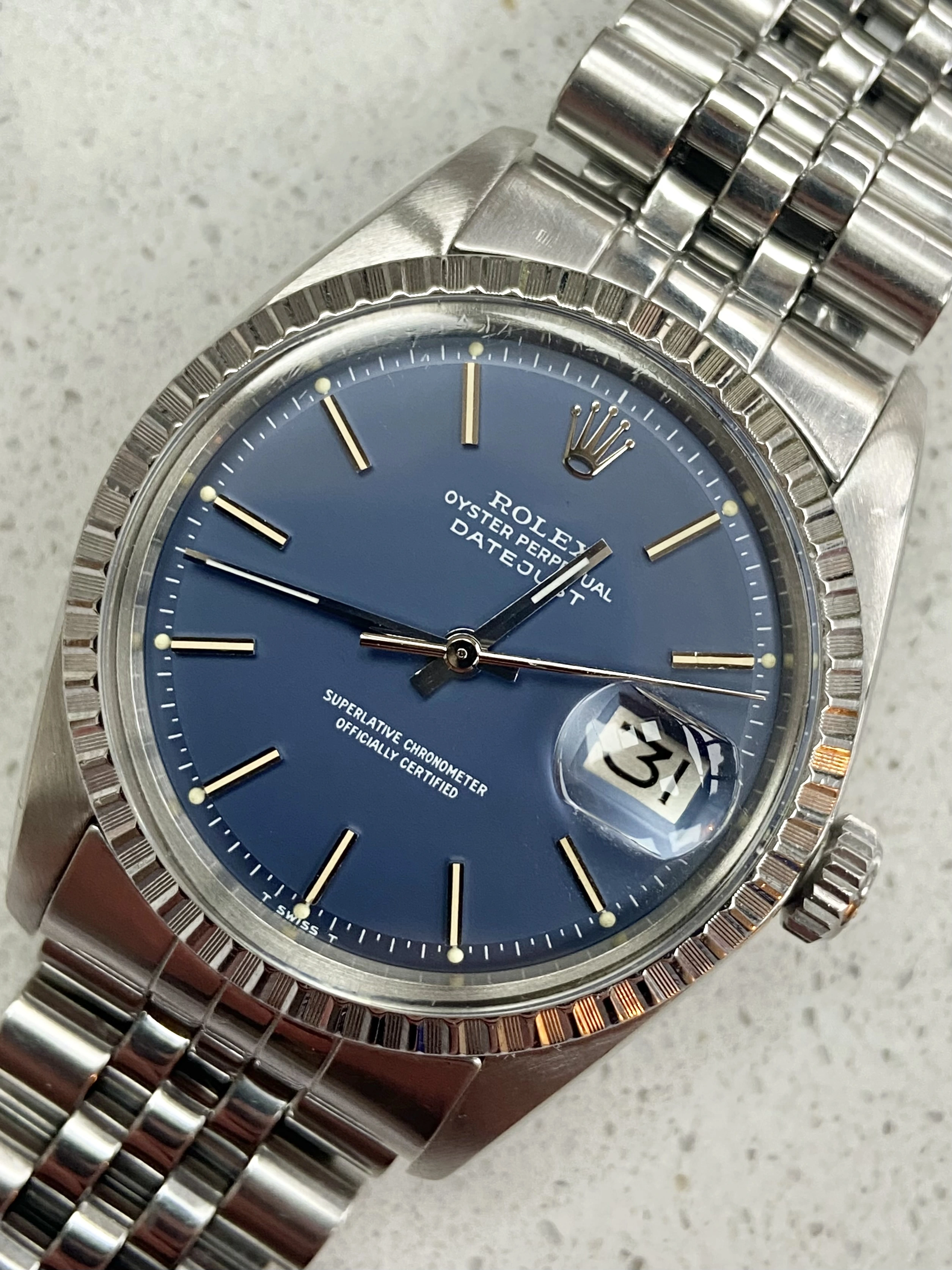 ·Offering for sale a vintage 1970’s Rolex DateJust 1603 with blue pie pan type dial. I’ve had a 16030 blue dial datejust before but this blue is nicer, less saturated and more of a pastel blue. Comes with its original coffin style Rolex box and service cards showing it was fully serviced by Rolex in 2011 and 2017.