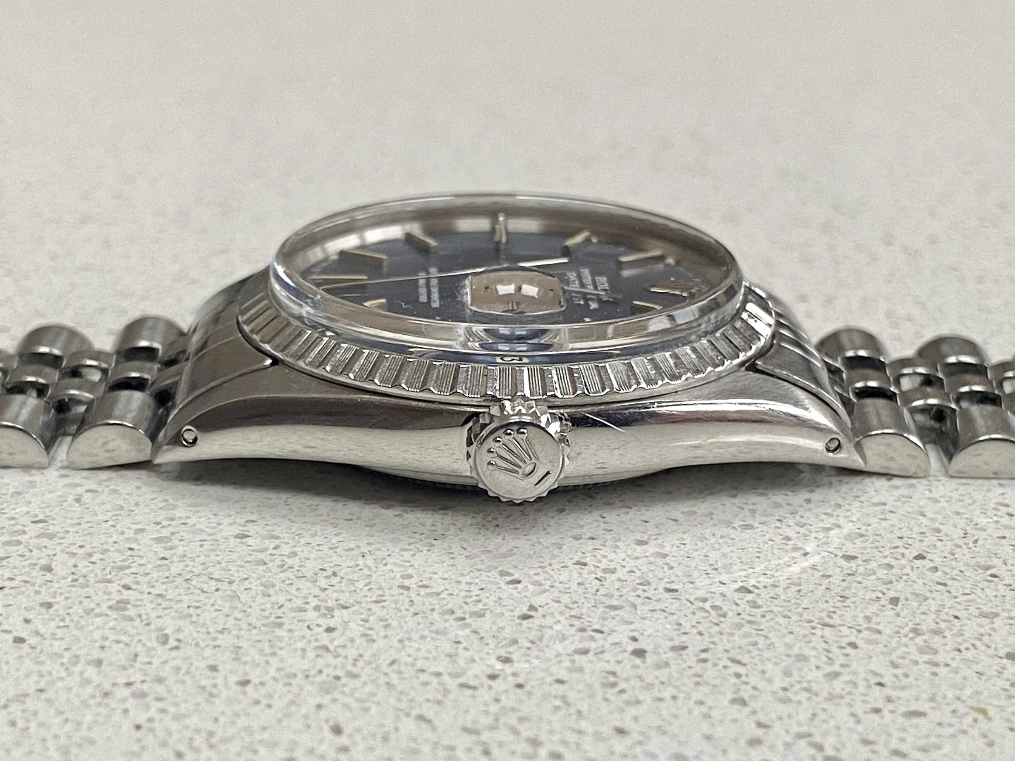 The 36mm 1603 stainless steel case with engine turned bezel is in good condition, nice and thick with no damage or corrosion and has been previously polished by Rolex.