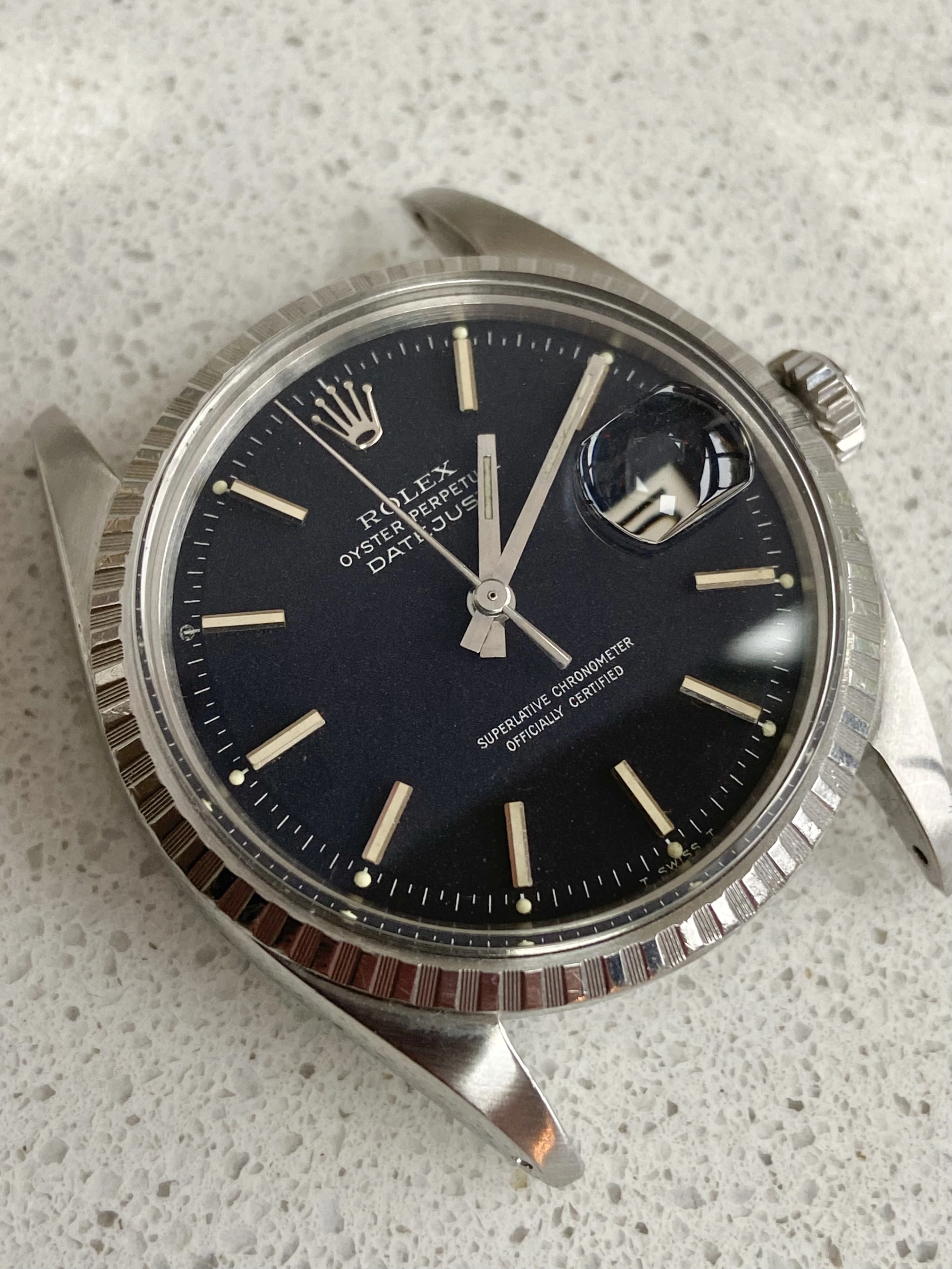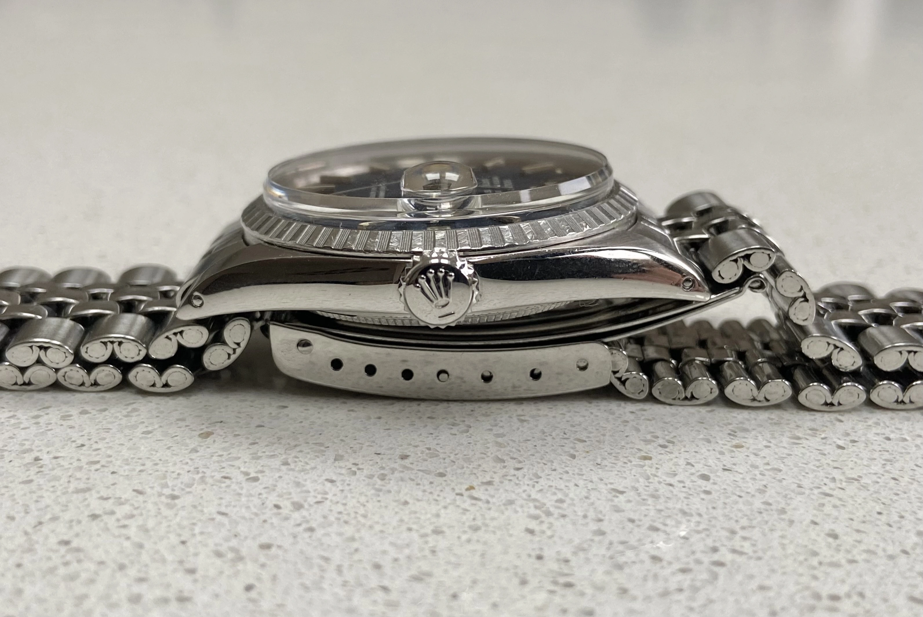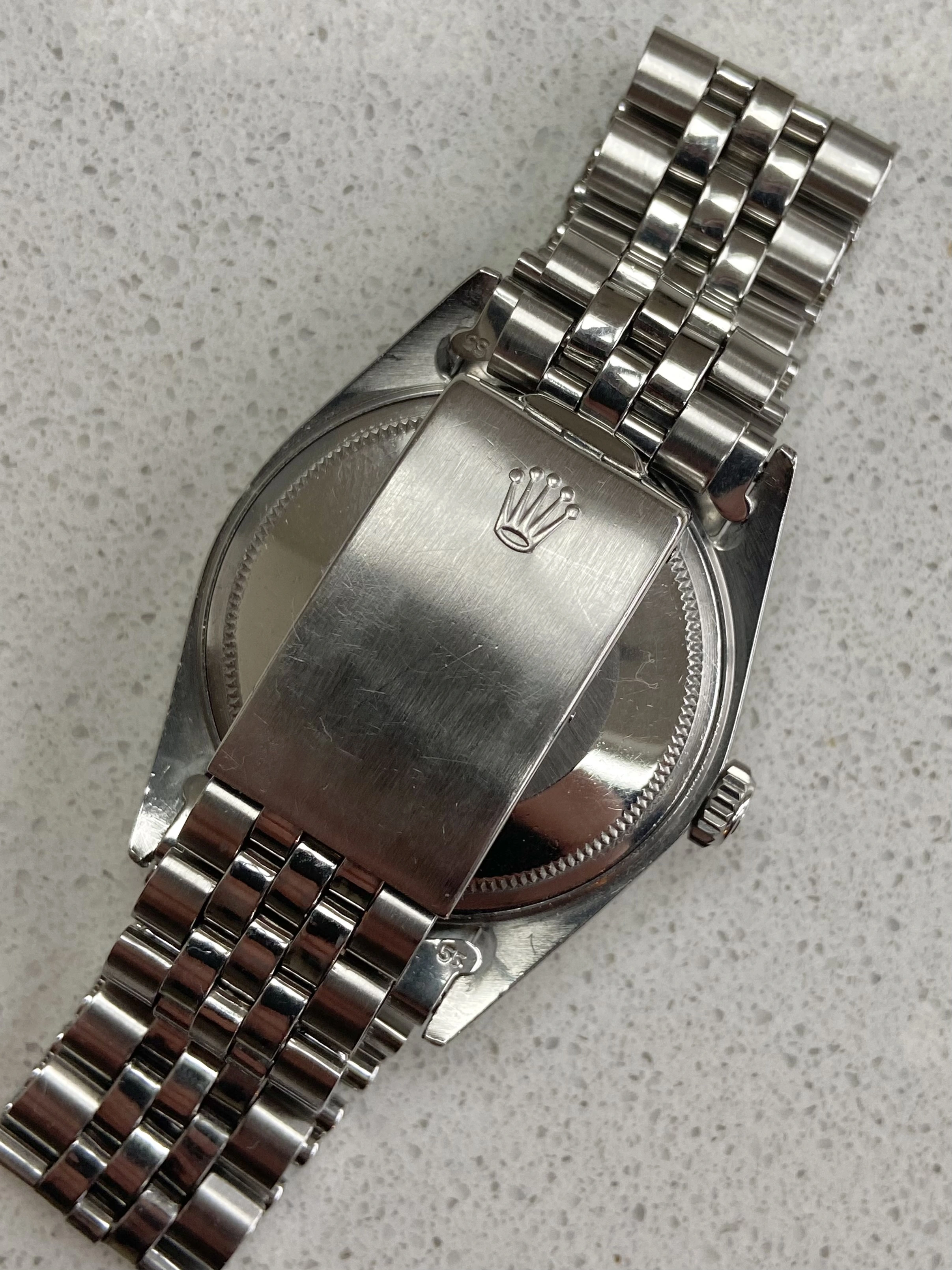 Stainless steel 36mm case ref 1603 with engine turned bezel. Has been polished before (not by me). New genuine Rolex crown, tube, crystal and seals at service on Nov 25. Passed waterproof test at service.