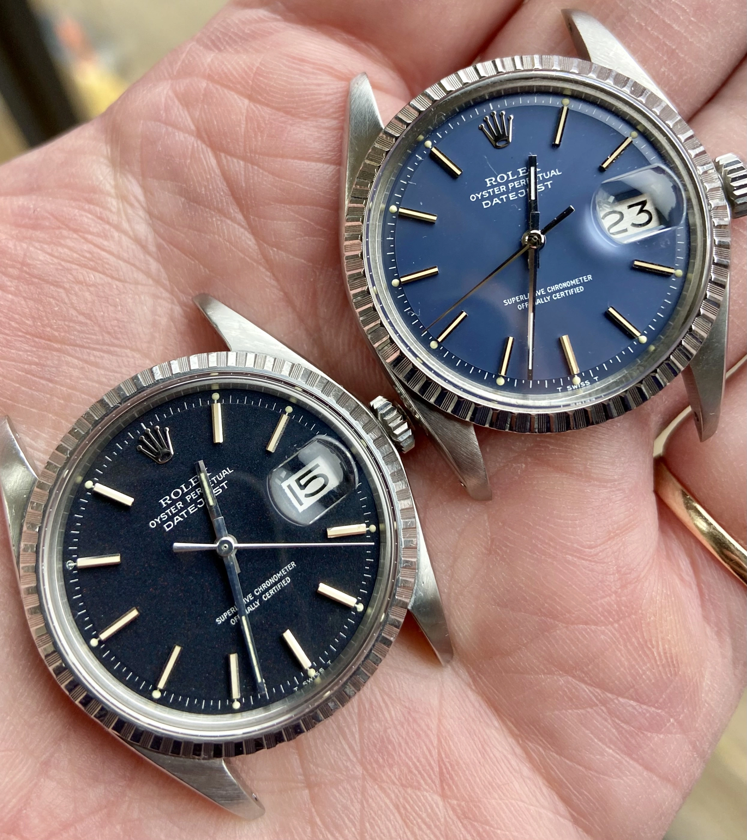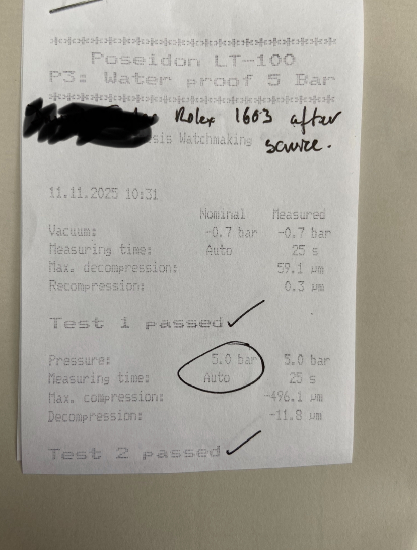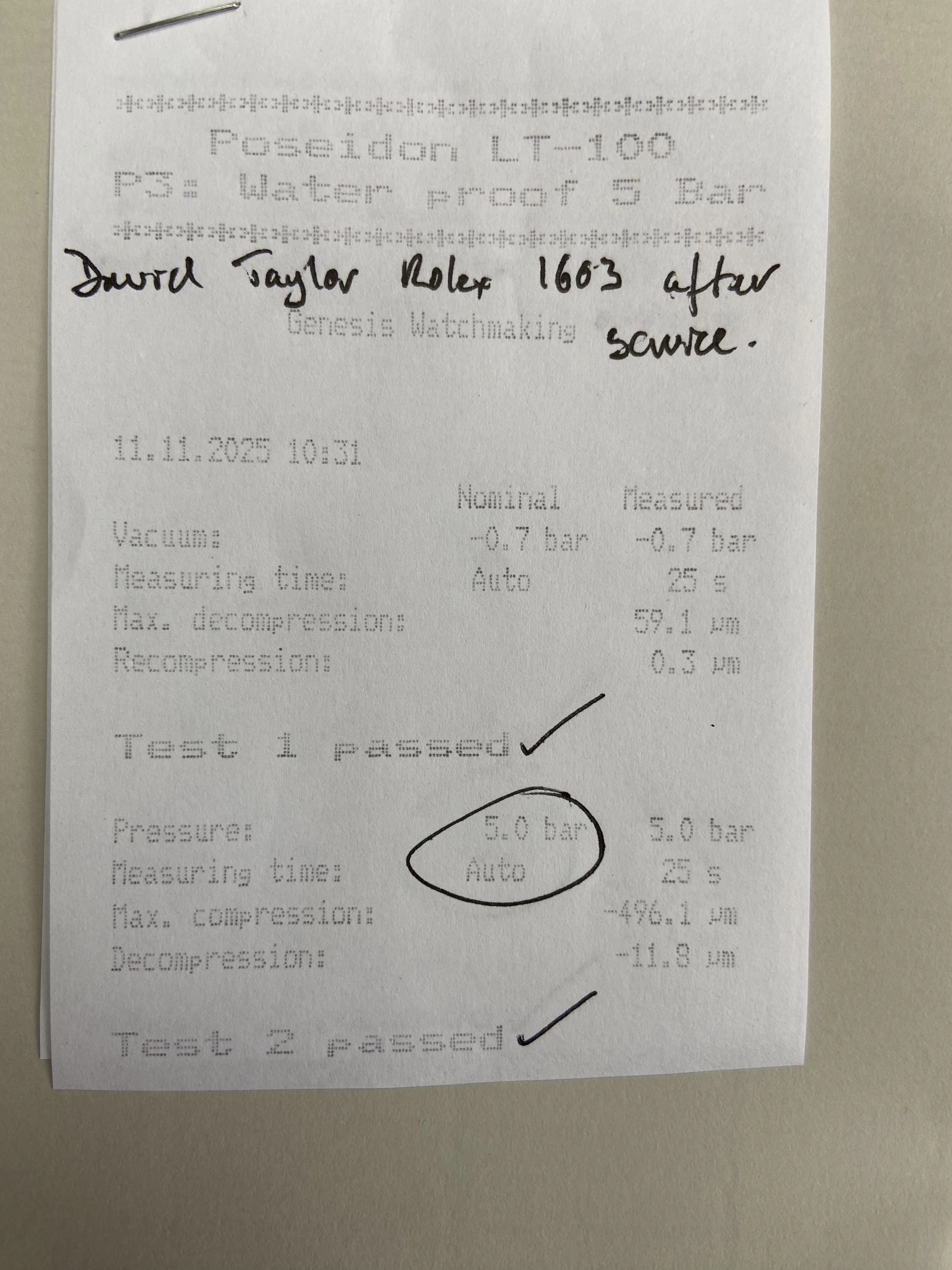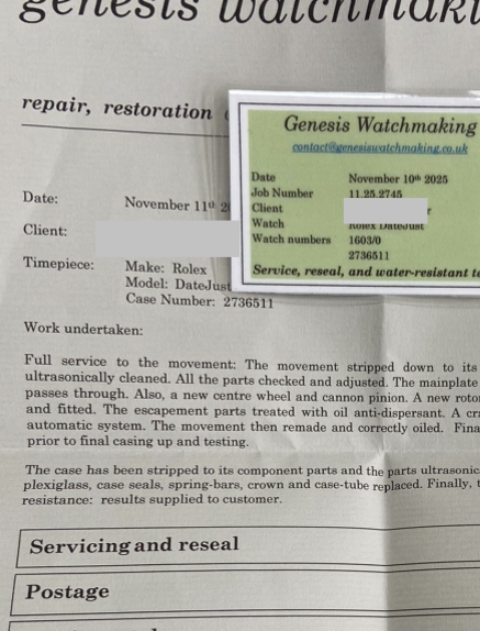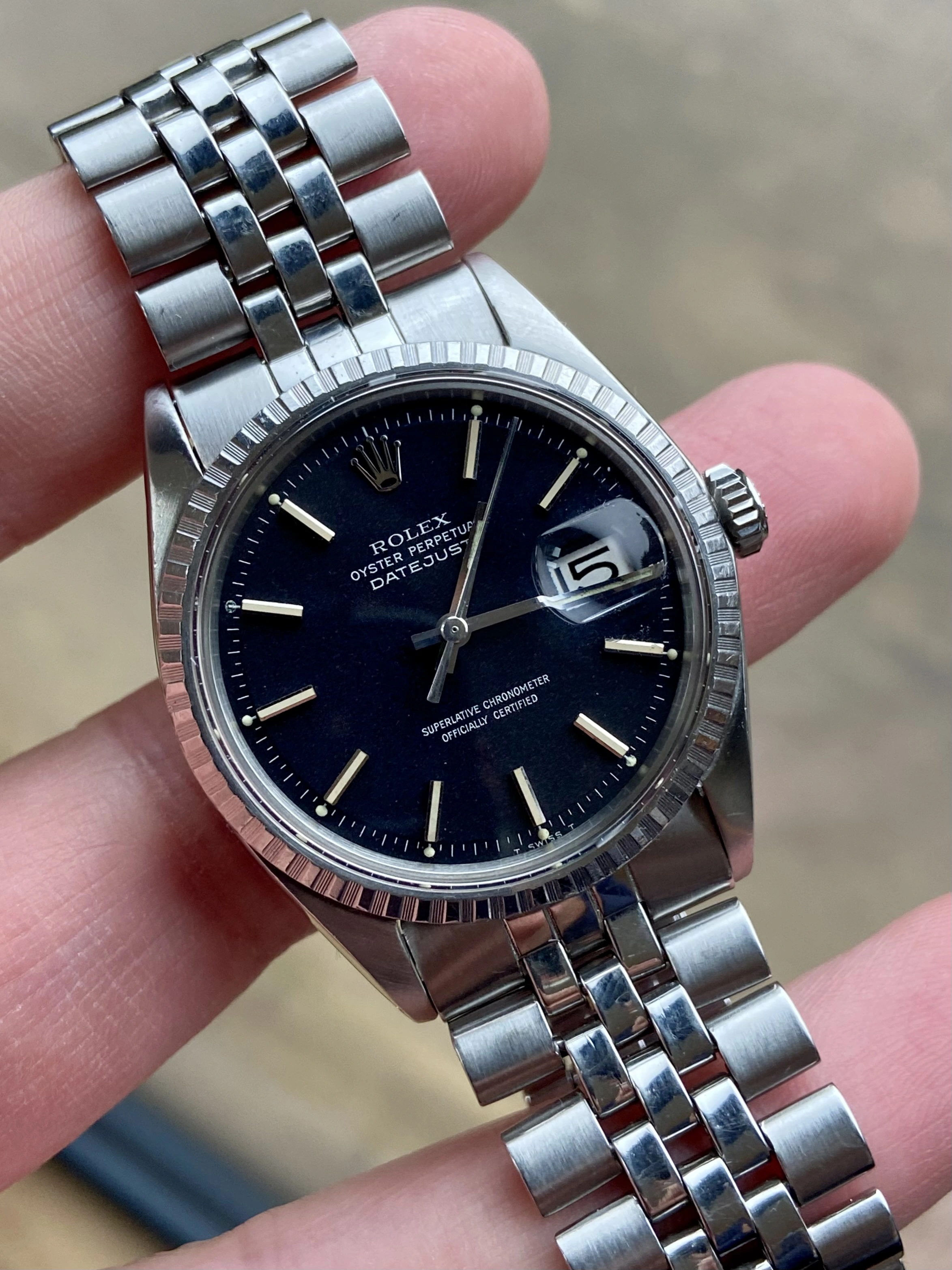Stainless steel 36mm case ref 1603 with engine turned bezel. Has been polished before (not by me). New genuine Rolex crown, tube, crystal and seals at service on Nov 25. Passed waterproof test at service.