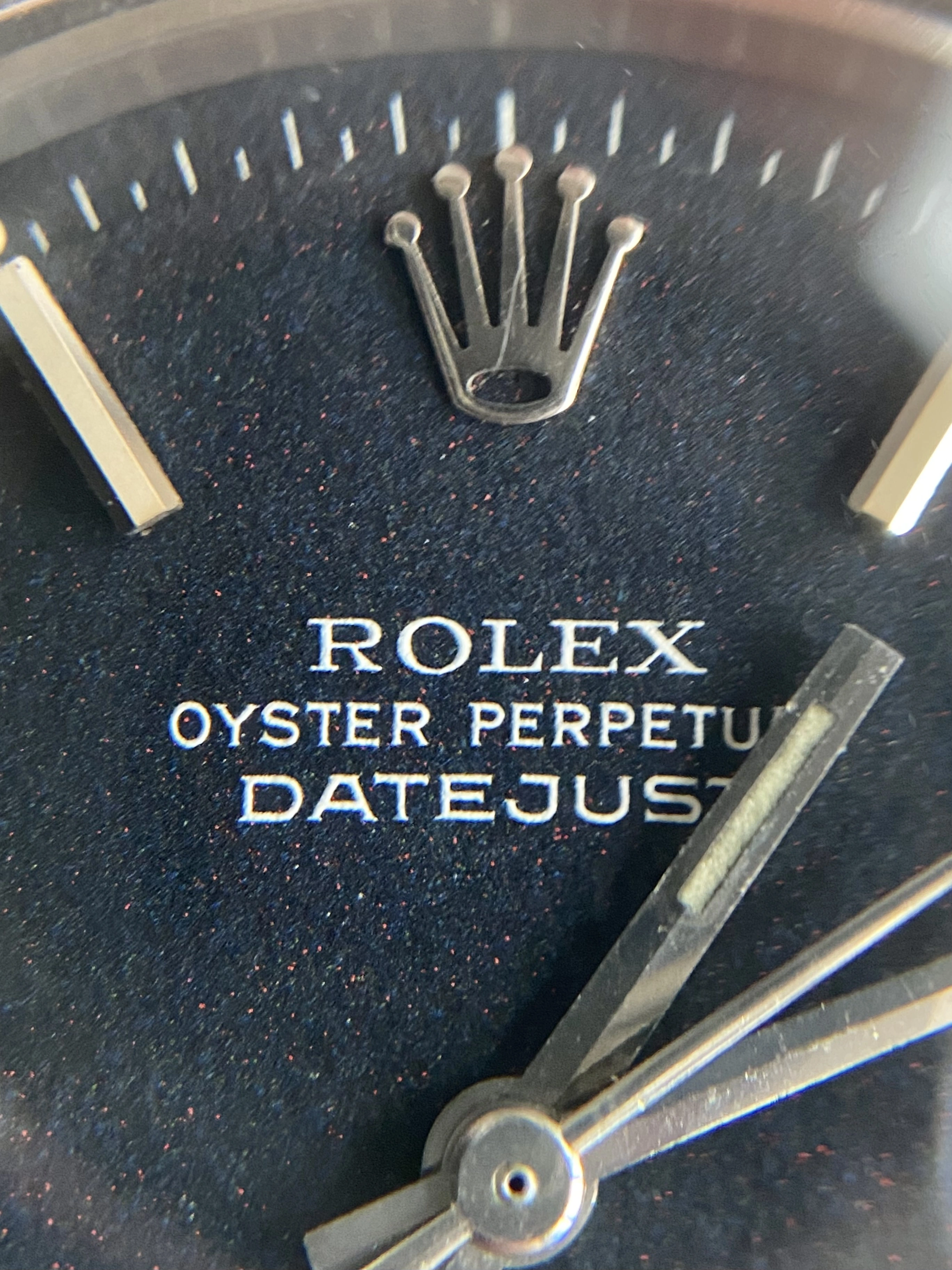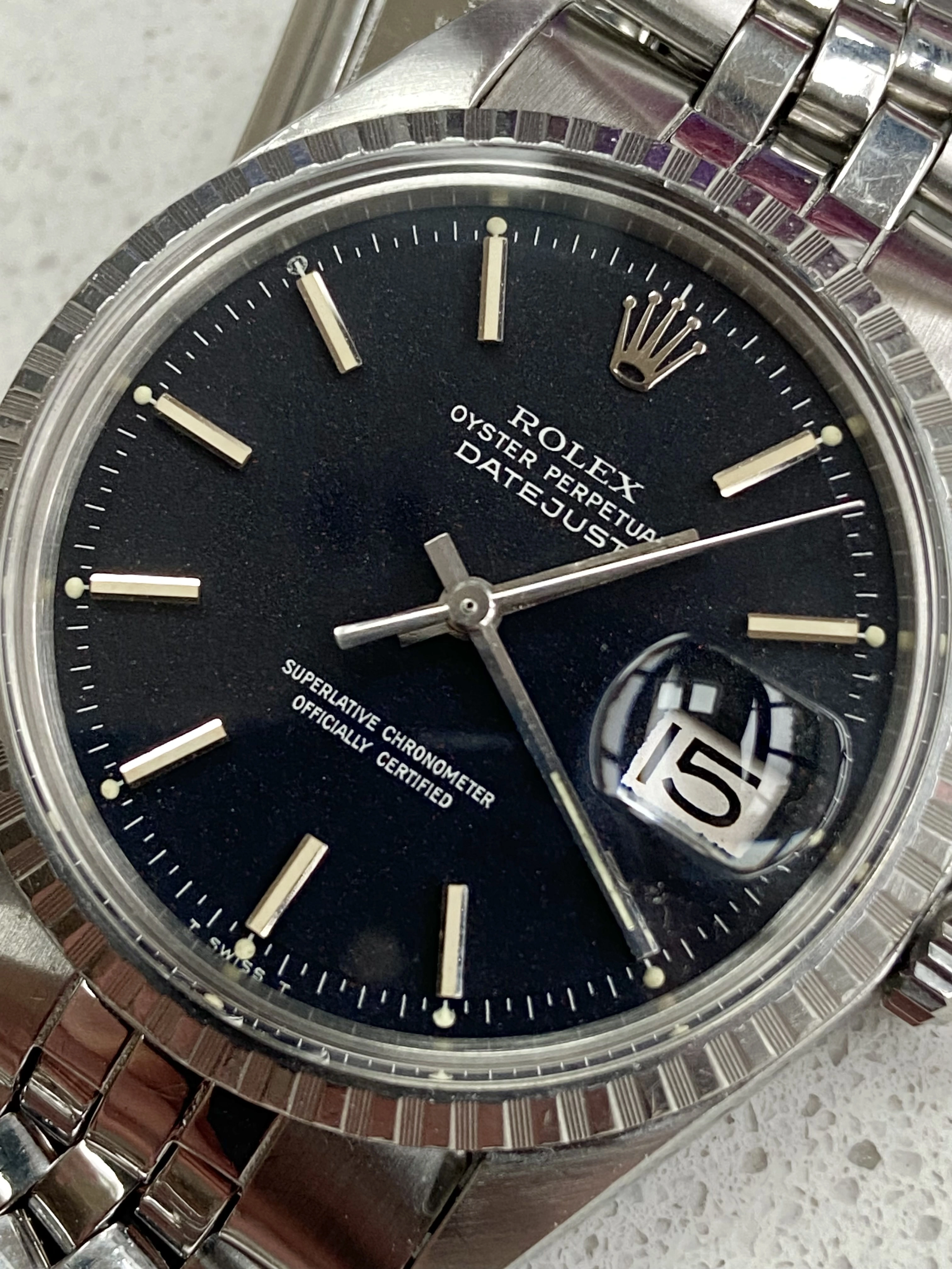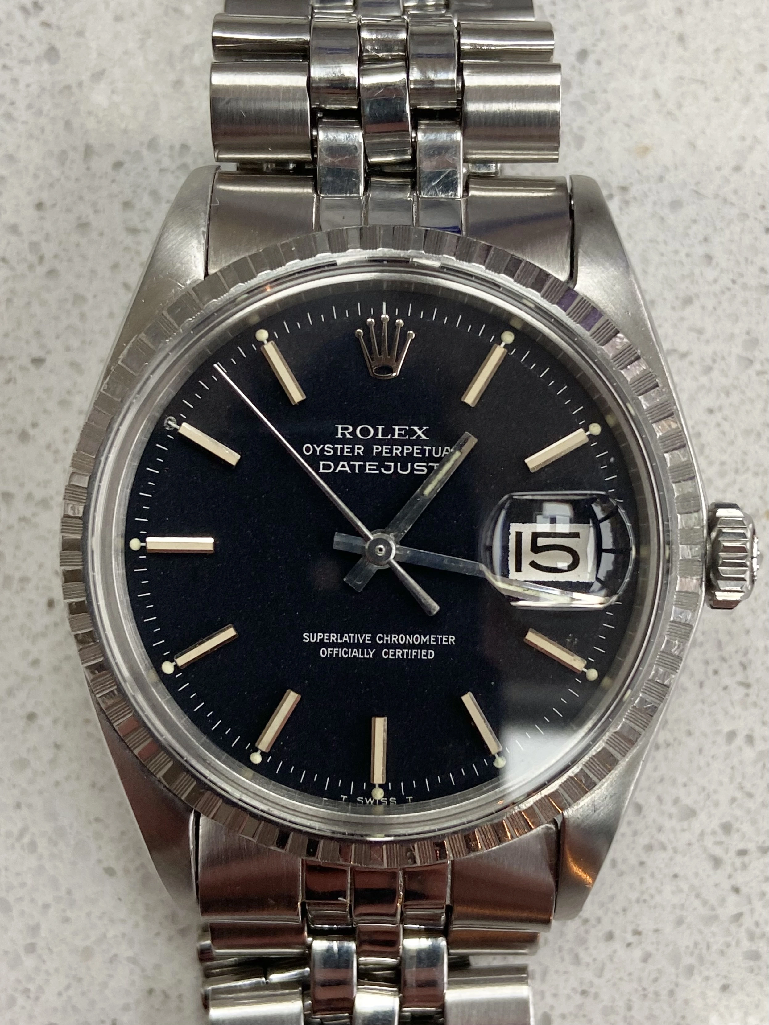 ·Offering for sale a vintage 1970’s Rolex DateJust 1603 with matte black ‘confetti’ dial. These matte black DateJust dials are something else, much more interesting and attractive than the standard black dials. The dial on this one is beautiful with clear flecks of red and blue and gives it a different look to other DateJusts. This has just returned from a full service with a Rolex certified watchmaker, sympathetic to vintage and is under warranty to Nov 2027.