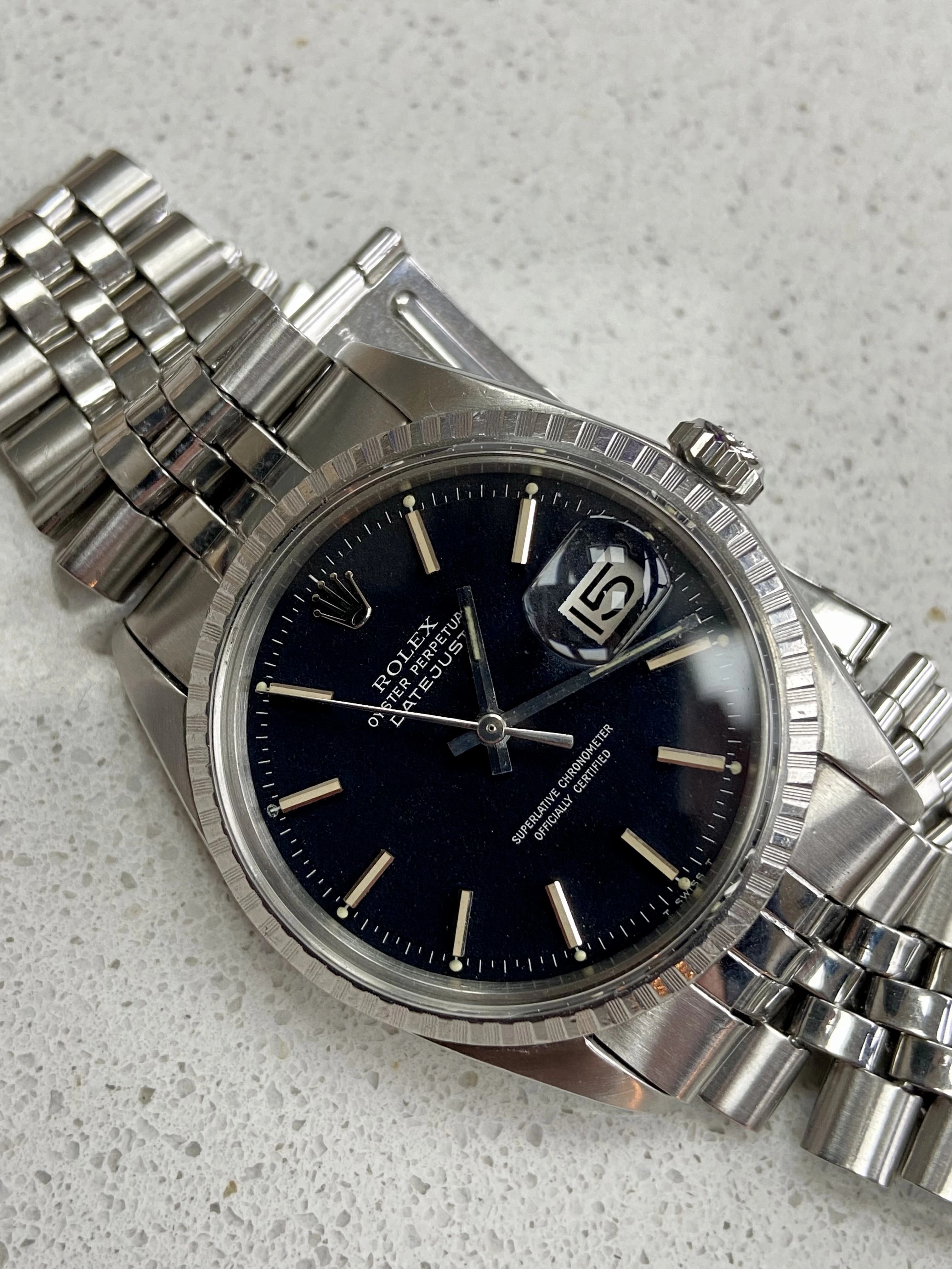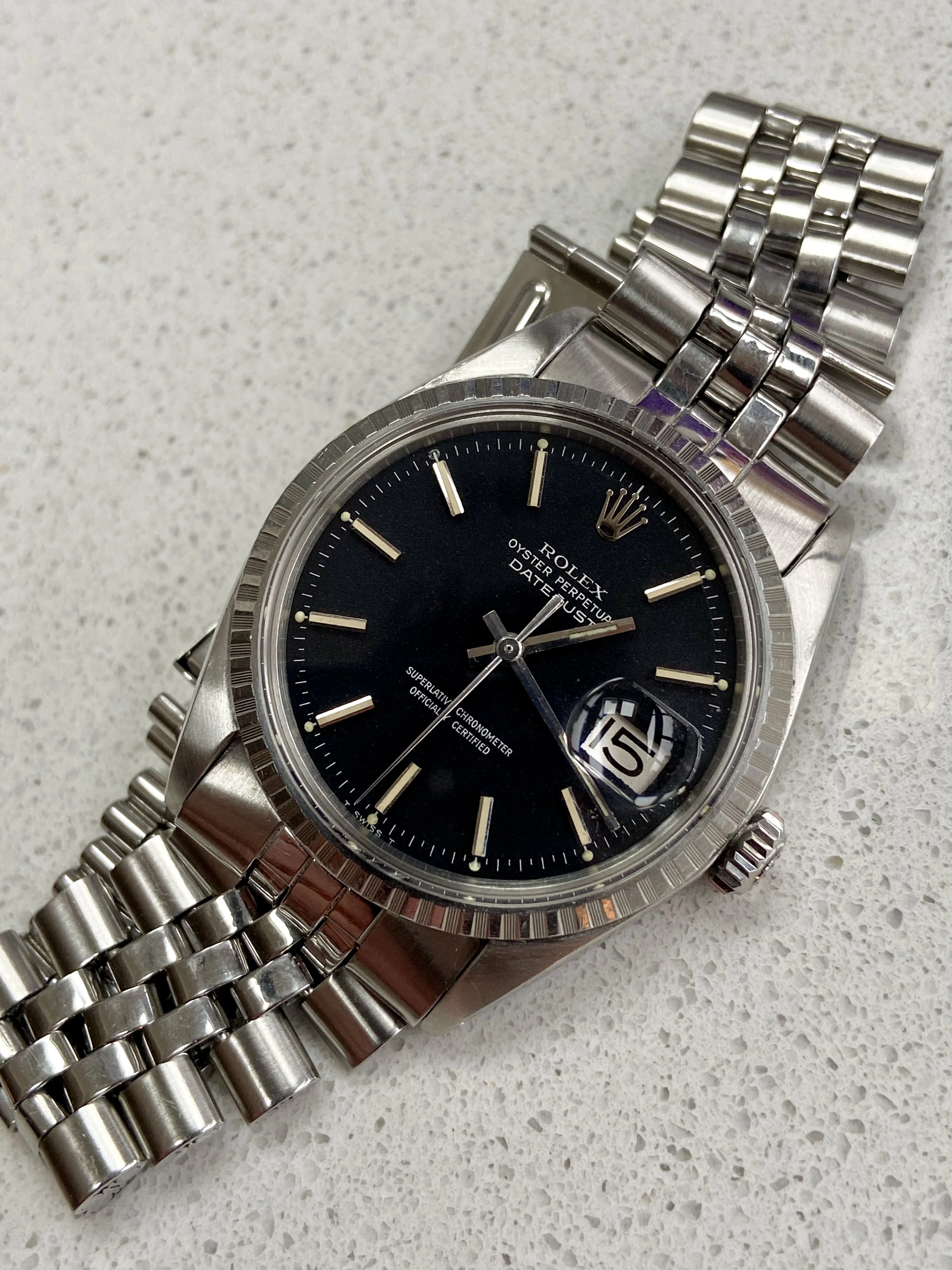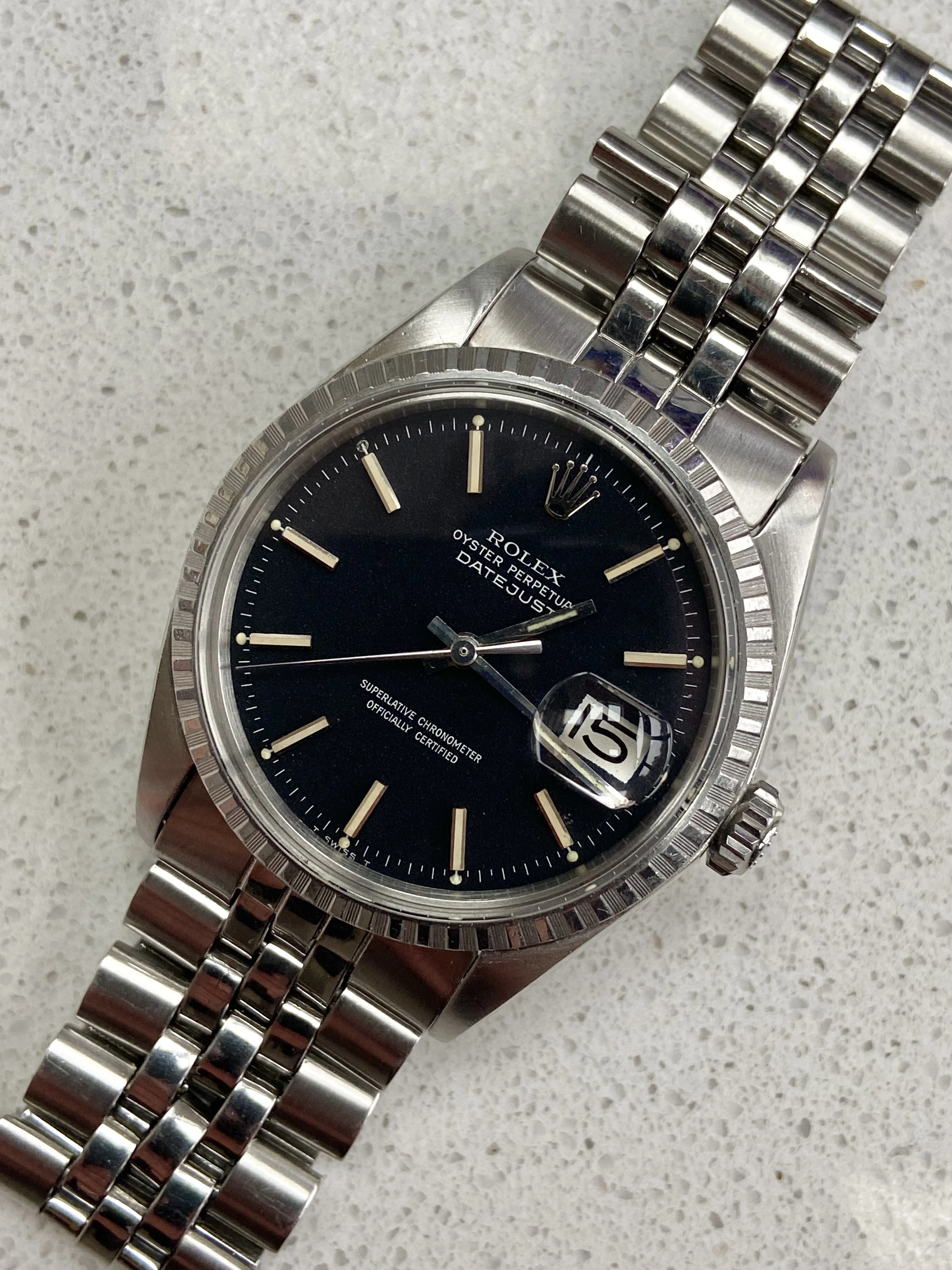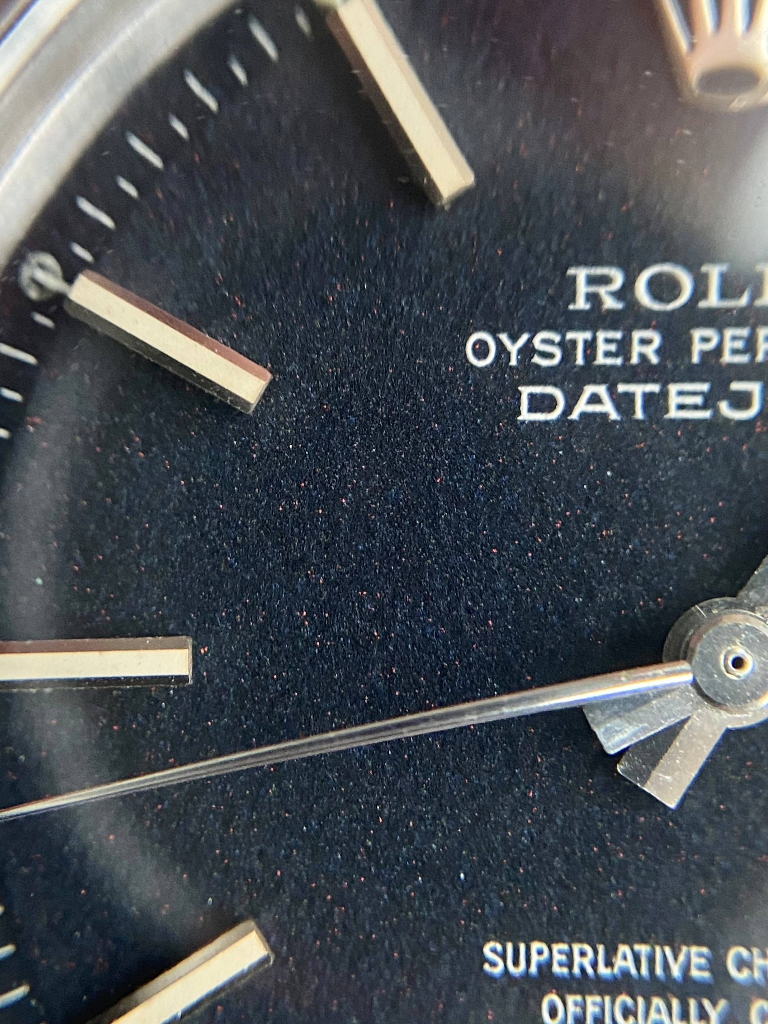 ·Offering for sale a vintage 1970’s Rolex DateJust 1603 with matte black ‘confetti’ dial. These matte black DateJust dials are something else, much more interesting and attractive than the standard black dials. The dial on this one is beautiful with clear flecks of red and blue and gives it a different look to other DateJusts. This has just returned from a full service with a Rolex certified watchmaker, sympathetic to vintage and is under warranty to Nov 2027.