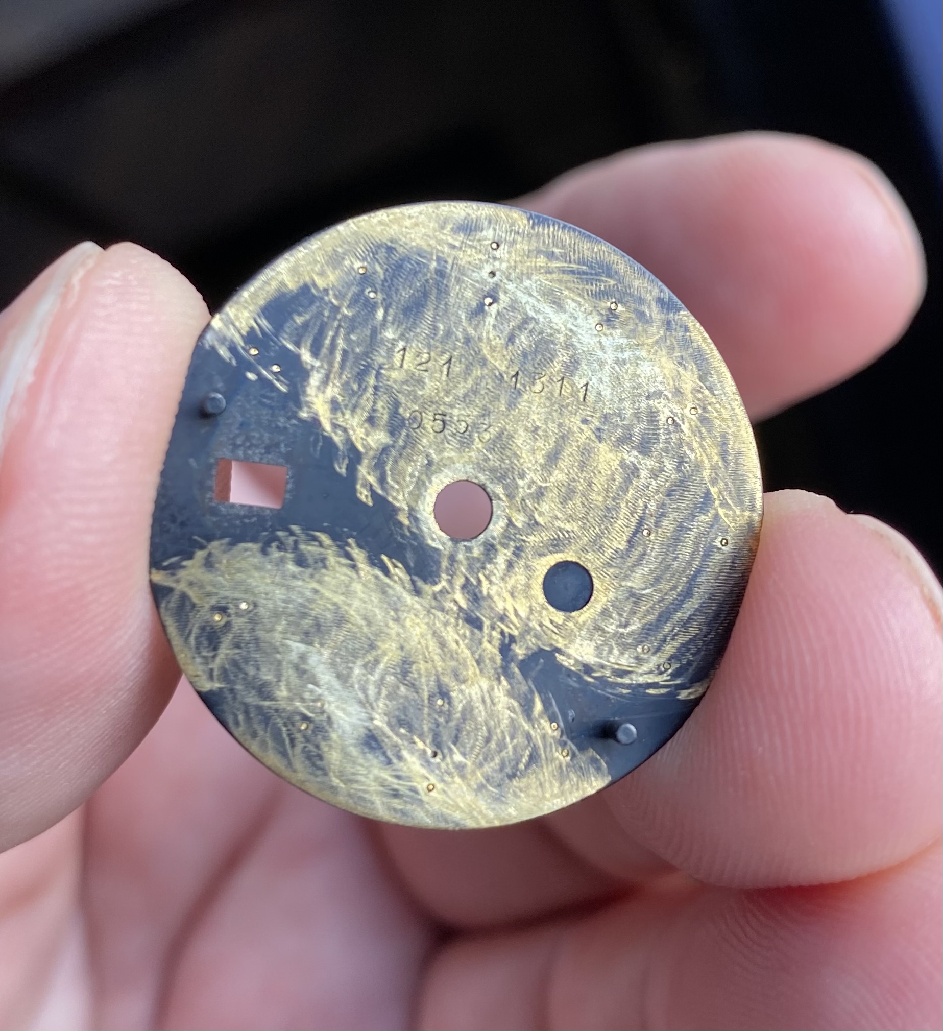 Dials shows wear, deterioration and pitting to the laquer layer on top of the dial paint, mostly around the edge and around the date window.