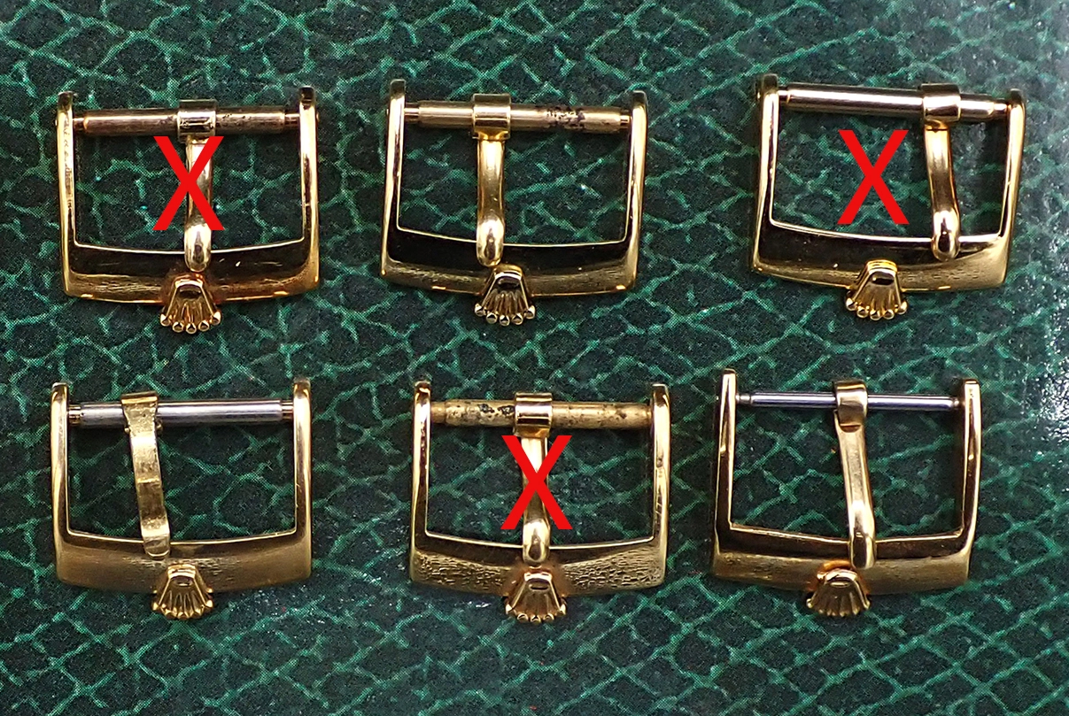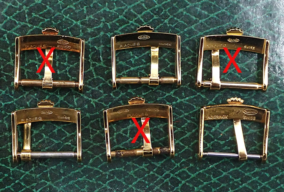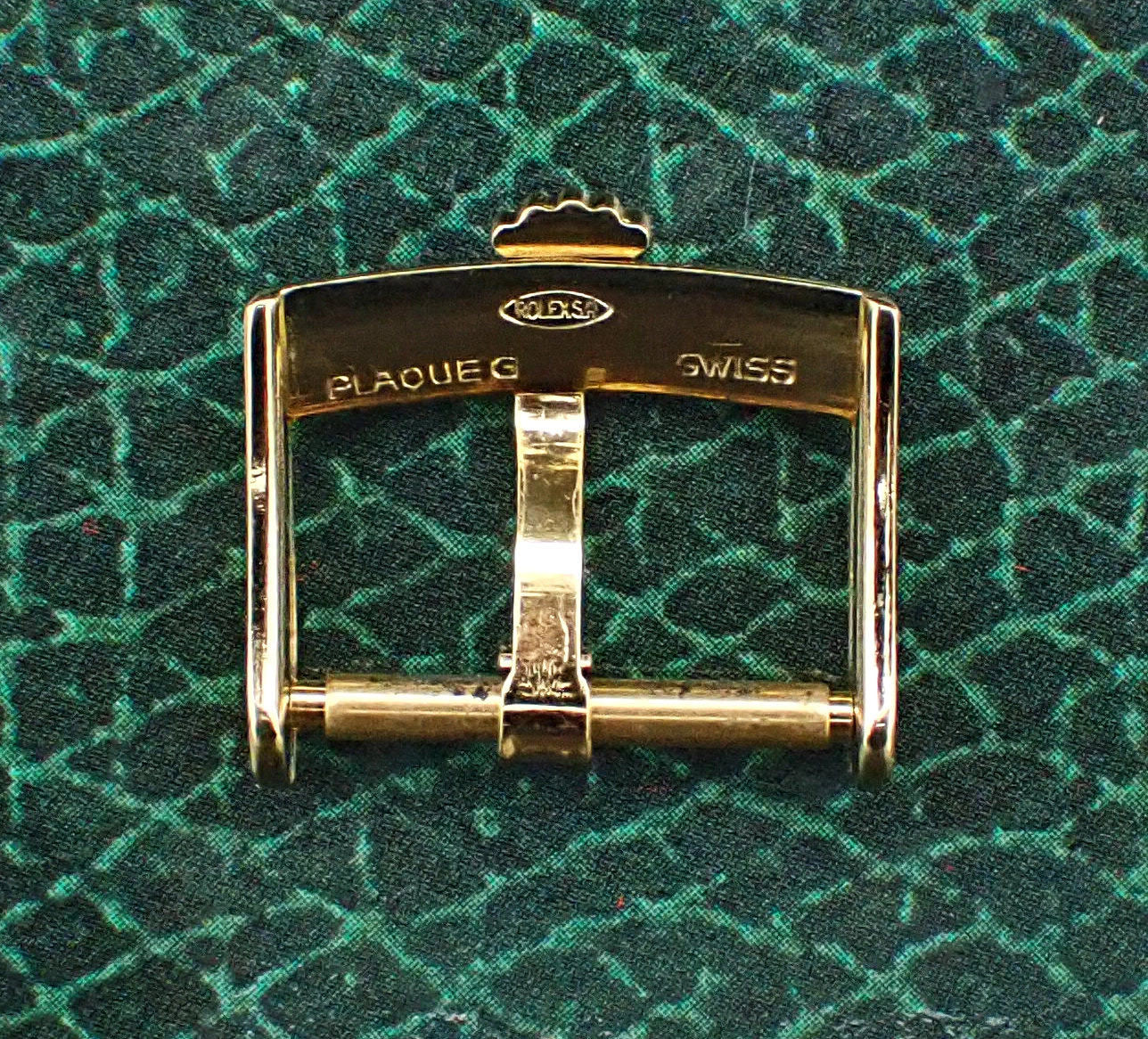 On offer here I have availableeight just 3 remaining genuine vintage Swiss Made Gold Plated Rolex Buckles in 16mm width for a variety of classic full size Rolex models in gold or bi-metal. These are gold plate over steel and pre-laser, with stamped nomenclature, and of excellent quality. These buckles are in Excellent to Near Mint overall vintage condition, with minimal signs of wear and age and no major defects. They contain all the correct nomenclature on the underside of the buckle —seven of them with “PLAQUE G”, the encircled “ROLEX SA” and “SWISS” in various alignments, while one example is labeled "ACIERINOX" instead of Plaque G (a slightly earlier designation, I believe)