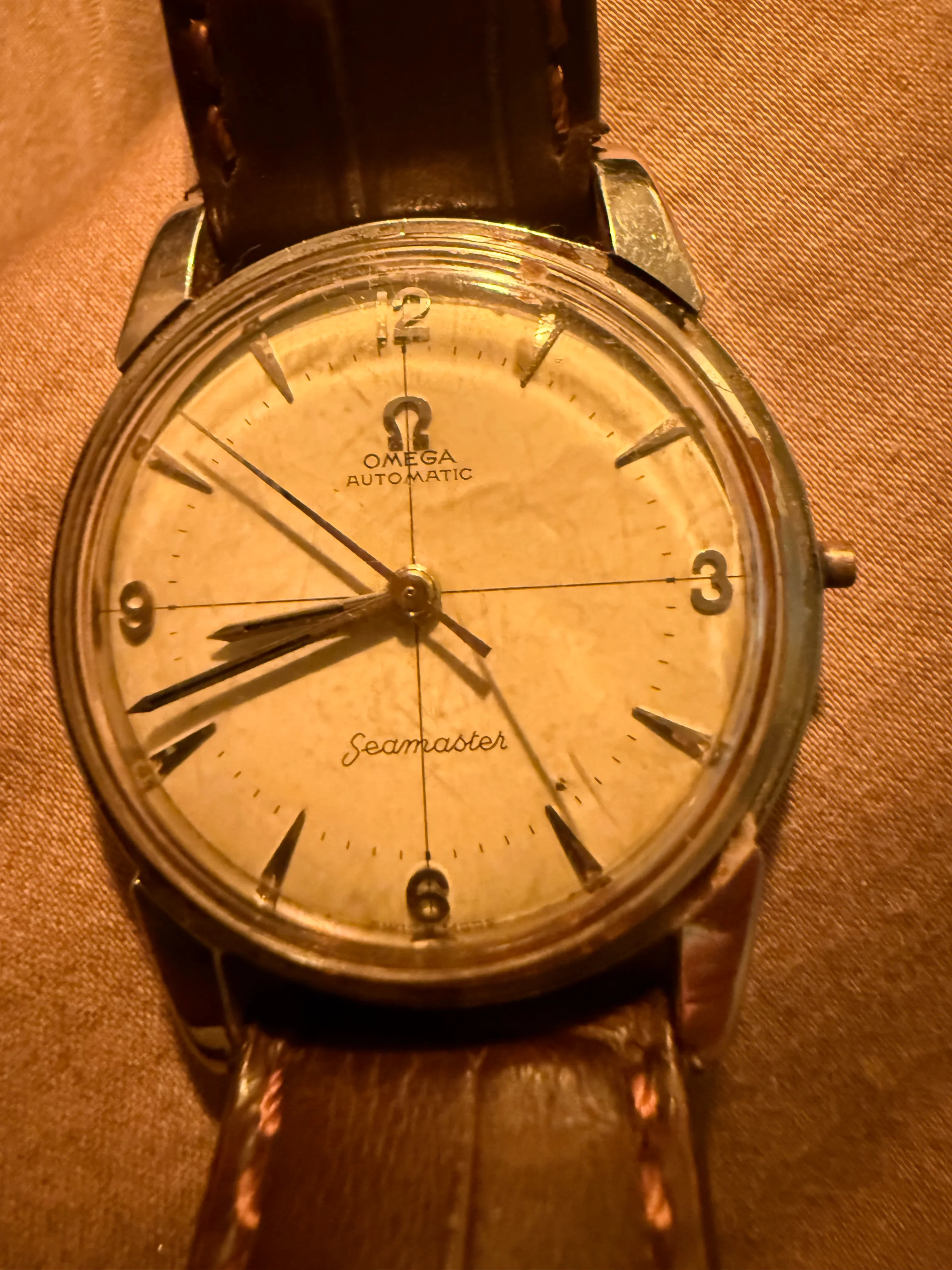 1. The hands do not seem original. Dad recalls the watch was sent to Omega for a service in the late 80's or early 90's overseas perhaps in the UAE region. I believe the hands should be the dauphine non lumed hands as I cannot see any lume remnants in the chevrons? Was there a non lume chevron hour markers?