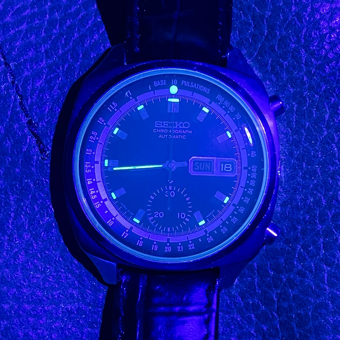 Dial / Hands / Bezel: Deep black dial in excellent condition. Applied hour markers with intact lume. Luminous paint glows bright and uniformly under UV light. Some cracking and lume loss on minute hand. Rotating inner bezel. Bright red chrono hand resets to 12:00.