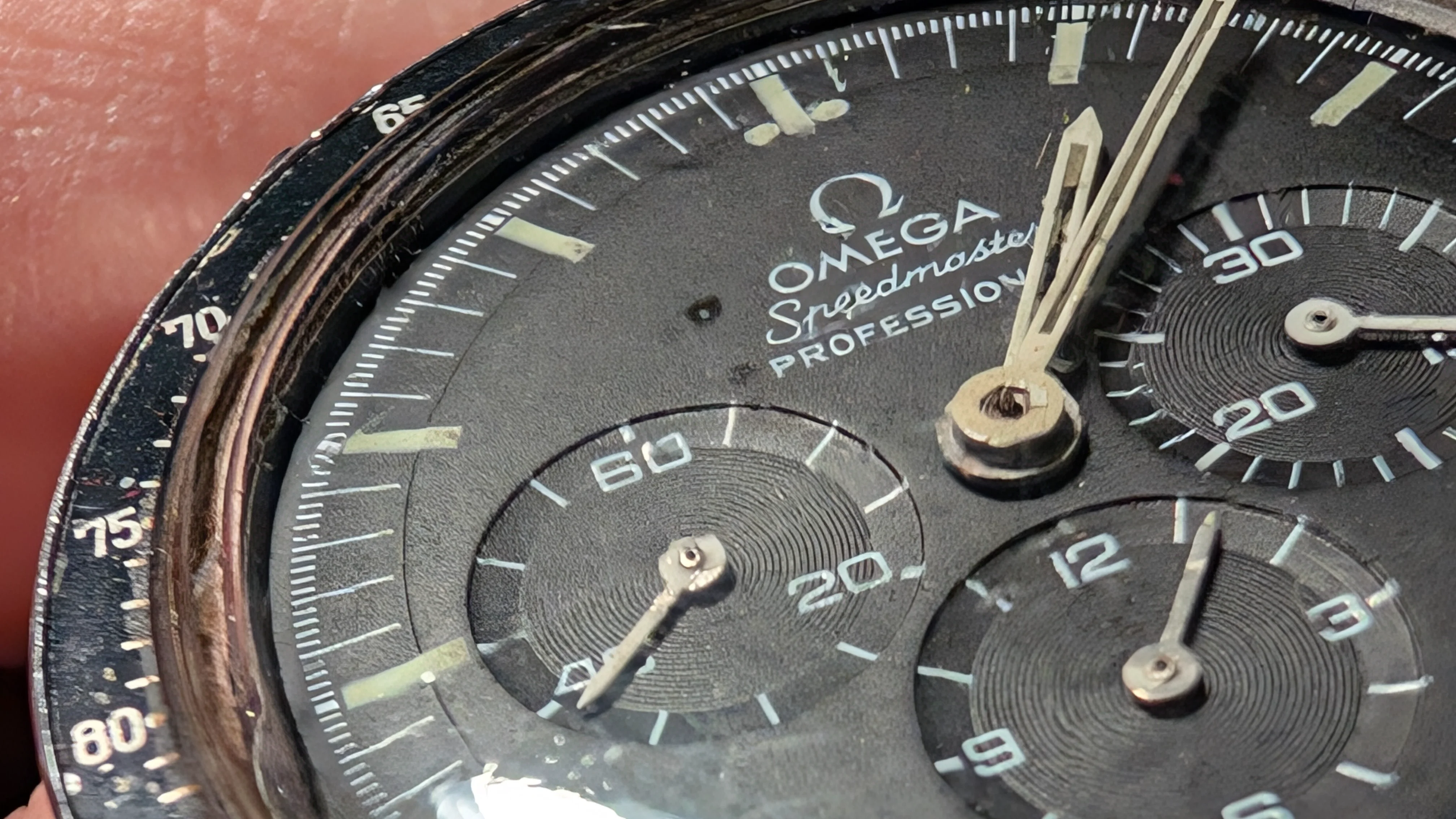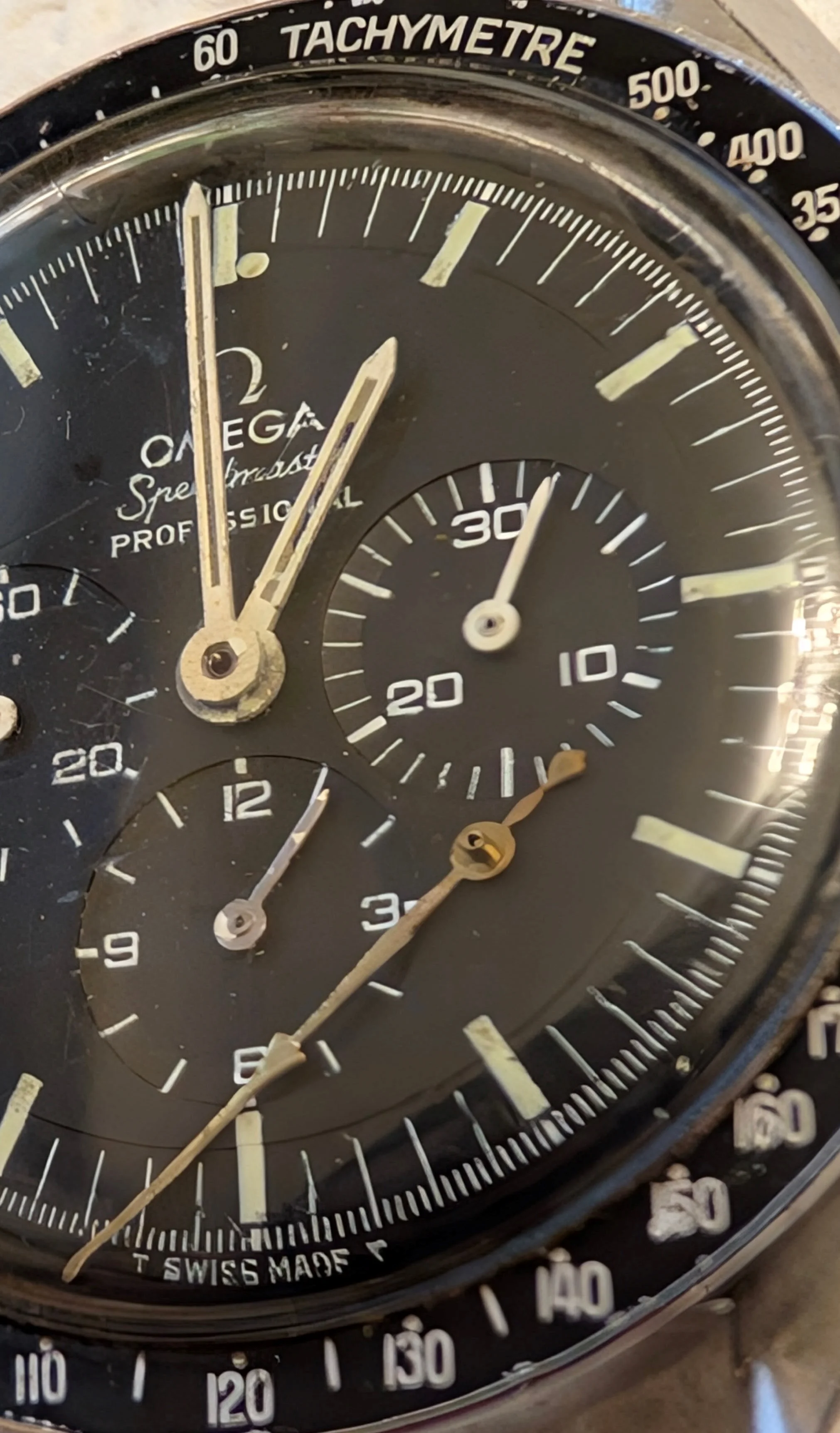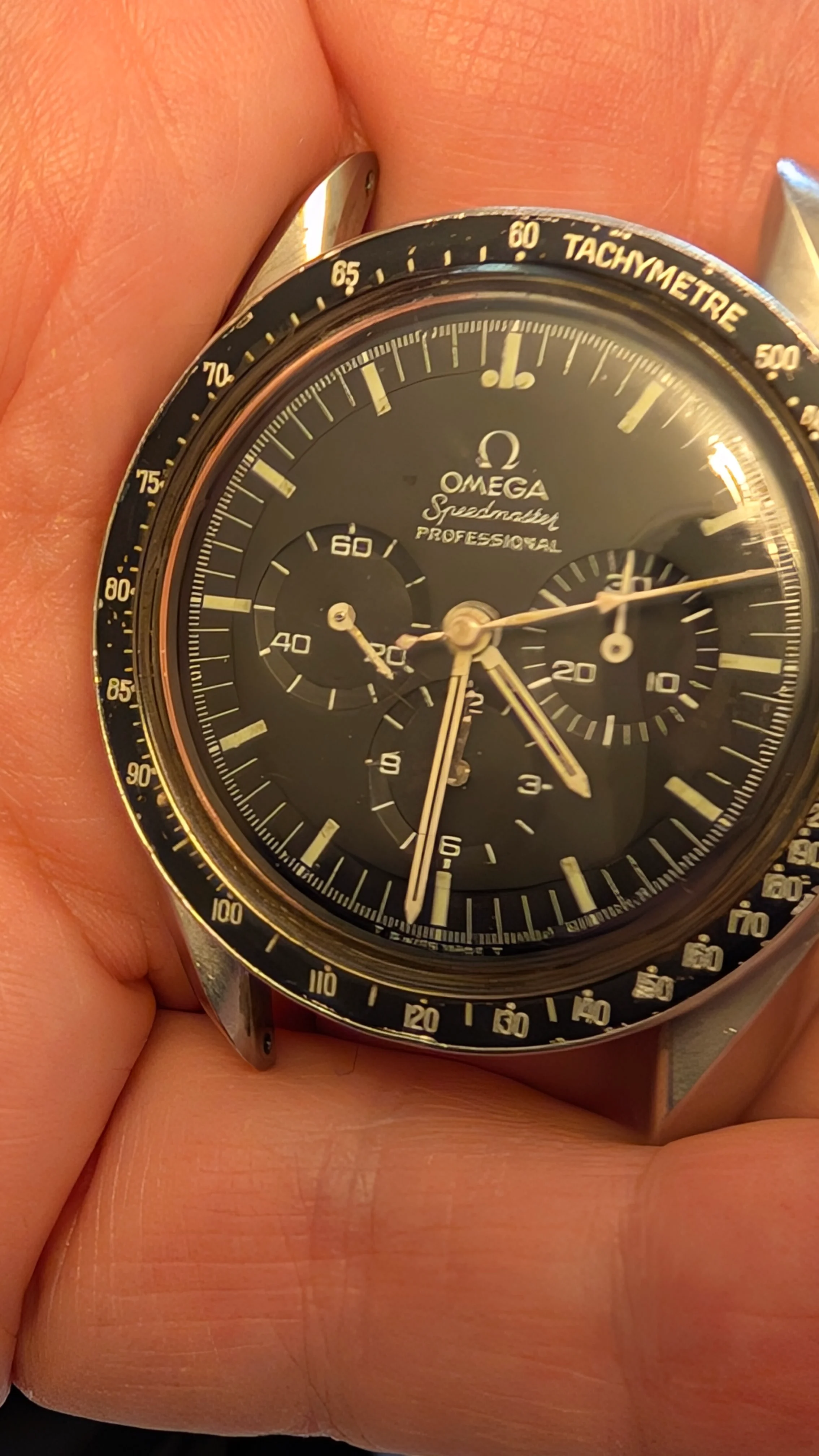 So-- I'm looking to you all for comments or advice. The chrono hand was swinging loose and fell off after a couple days of wear. I immediately took it off, tilted the watch so the now detached hand wasn't running into the other hands and let the spring wind itself down over a couple days. My plan is to send it to a watchmaker for a full-service, replace the hesalite, replace the fallen off chronohand with the correct Omega hand, and have the hands stripped and repainted/lumed to match the dial lume color. My current thinking is to avoid having anything done to the dial, bezel, and case to retain the original "patina" and "age" (aka, wear) gained over decades of wear while living life and turning wrenches, etc. I have no intention to ever sell this or anything and will just pass it down to through the family again here in a few more decades.