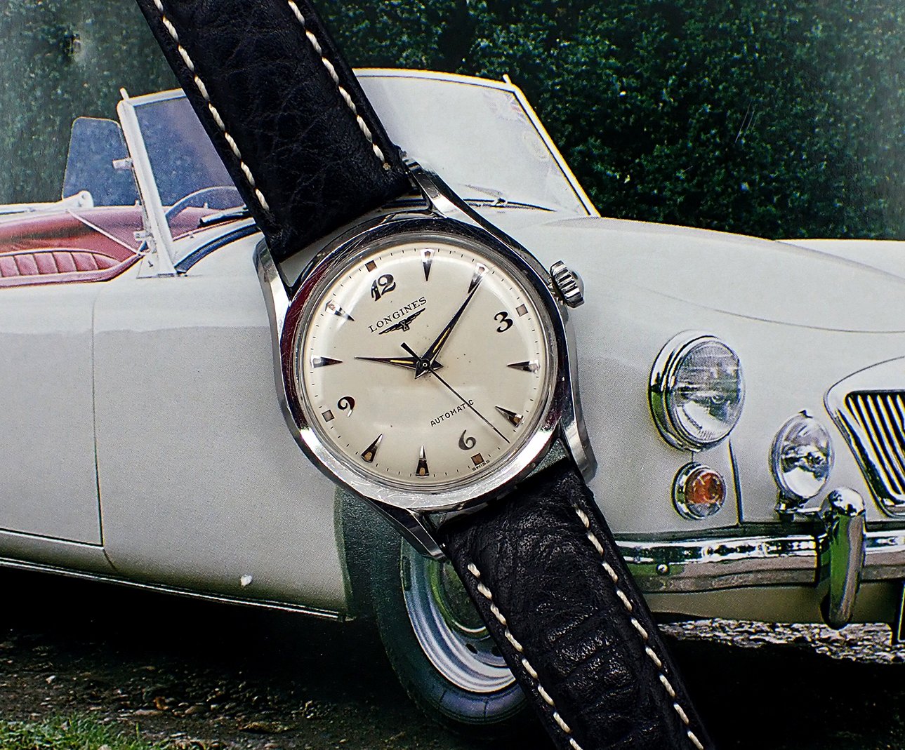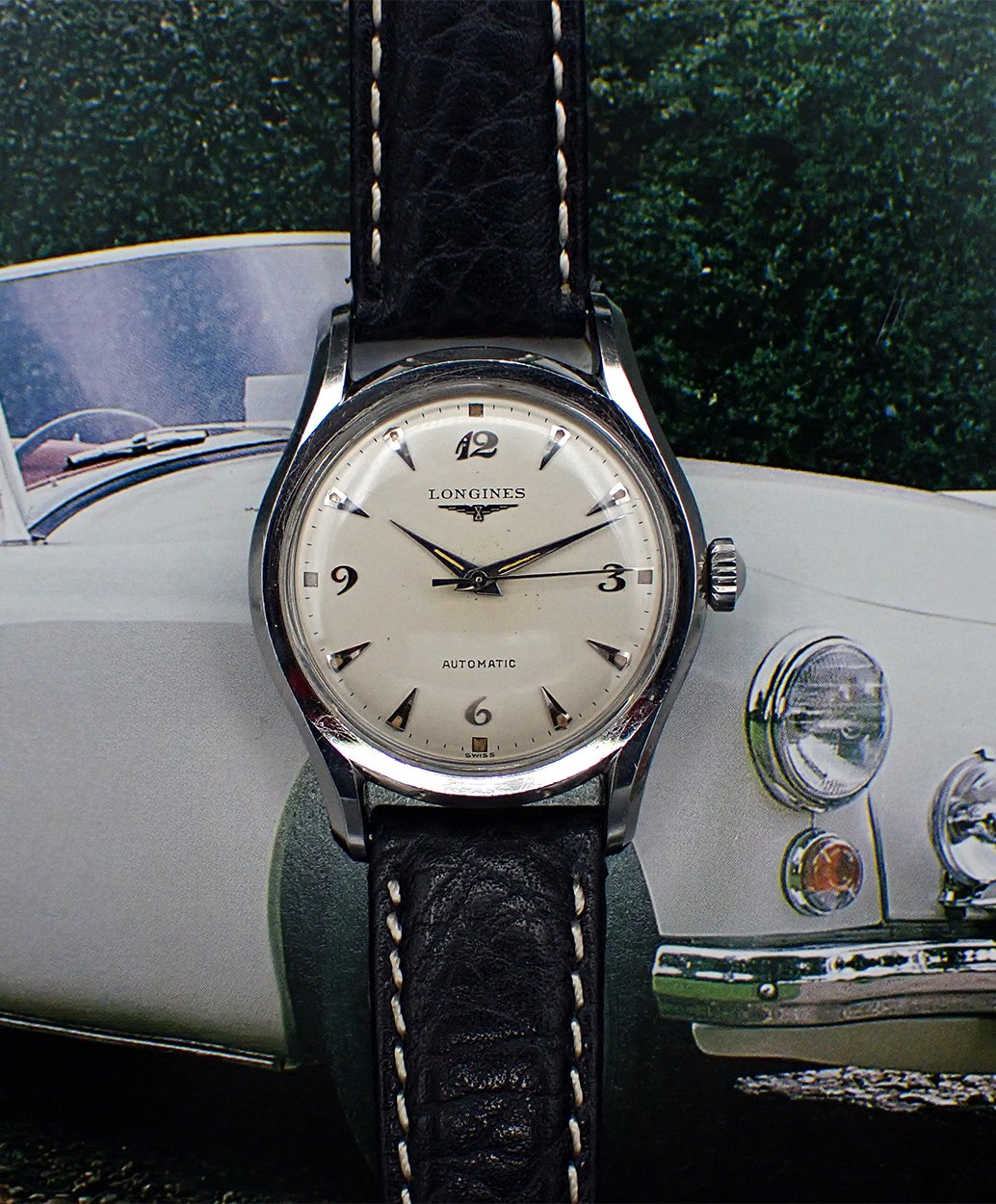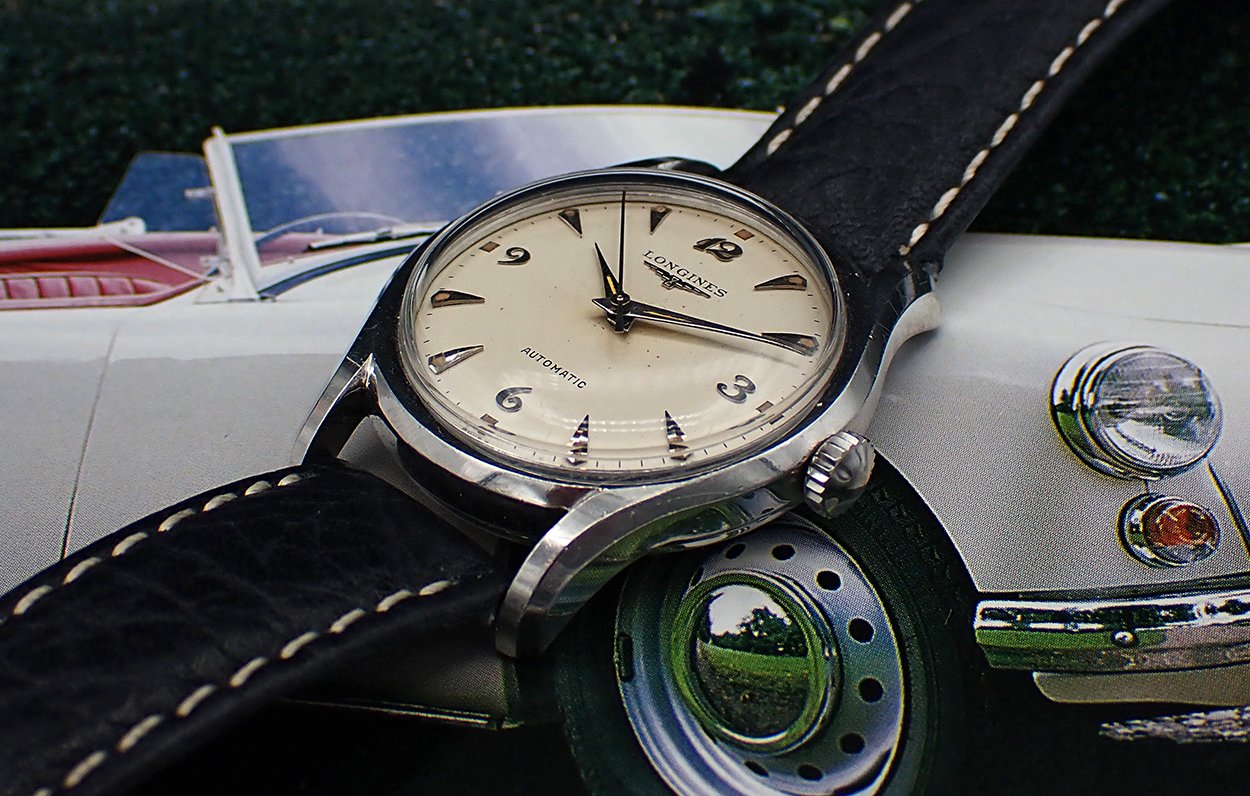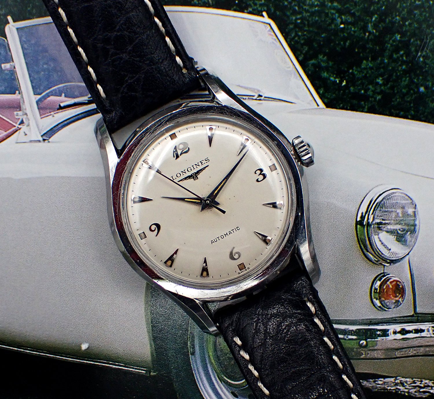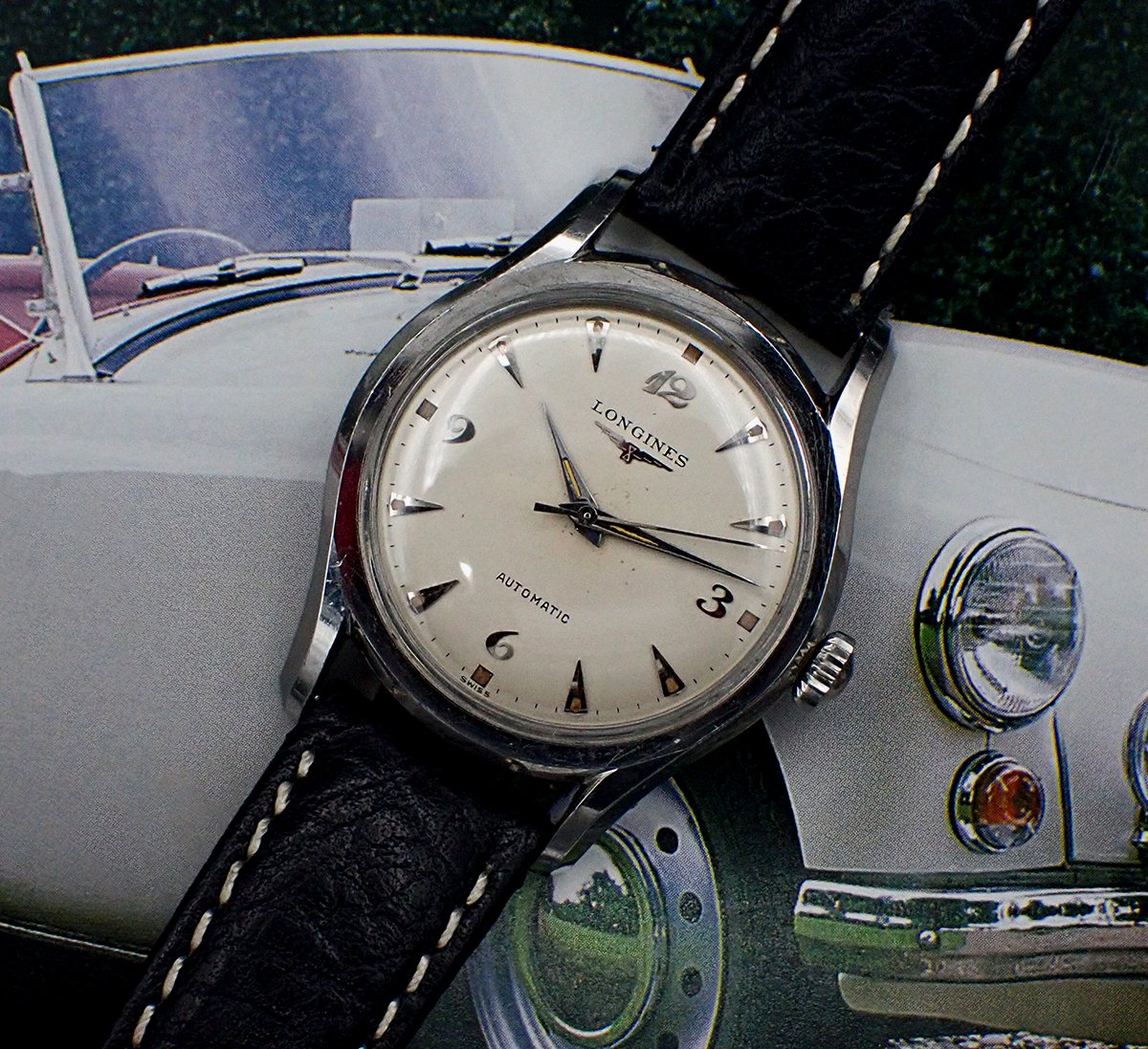 DIAL & HANDS: Beautiful original factory printed white dial with applied silver Breguet numerals for the quarter Arabics, silver teardrop “dagger” markers for the rest and attractively aged radium luminous markers all around. Applied winged hourglass logo and LONGINES printed in black on the dial below “12”, with AUTOMATIC printed above the “6”. This wonderful dial has aged to a warm and creamy ivory patina, which is beautifully complimented by the biscuity hue of the aged luminous plots. This dial does shows some light spotting and a minor mark or two but this is quite hard to see with the naked eye - Very Good original condition overall on this super charming vintage Longines dial. Polished silver pointed “dauphine”-style hour and minute hands with original luminous fill that matches the dial’s nicely, perhaps just a shade lighter, and the baton sweep seconds hand are all quite bright and attractive - Excellent condition. Simply a wonderful execution of the ever popular Breguet numeral dial!