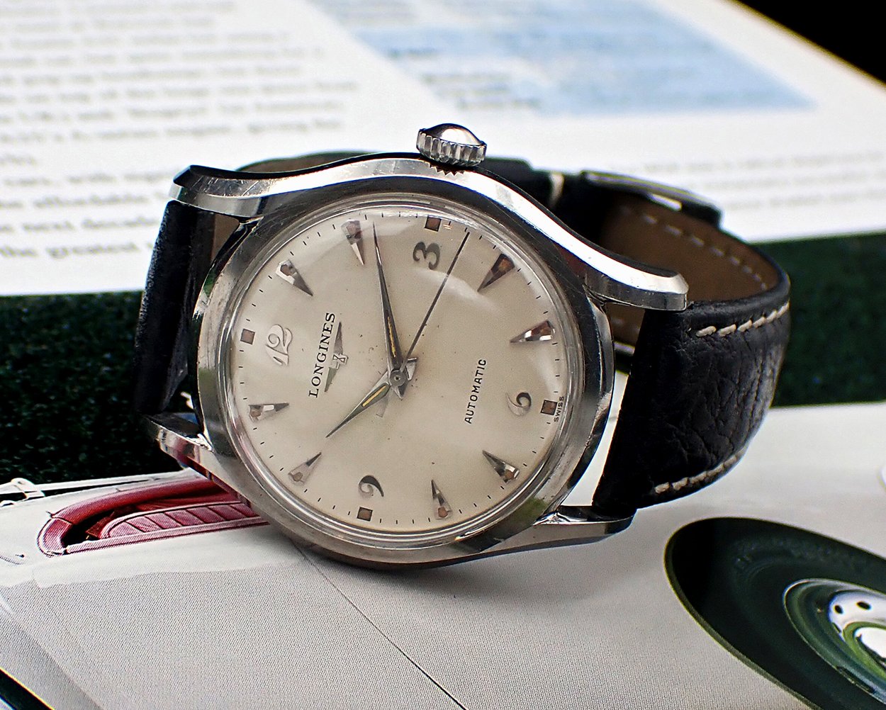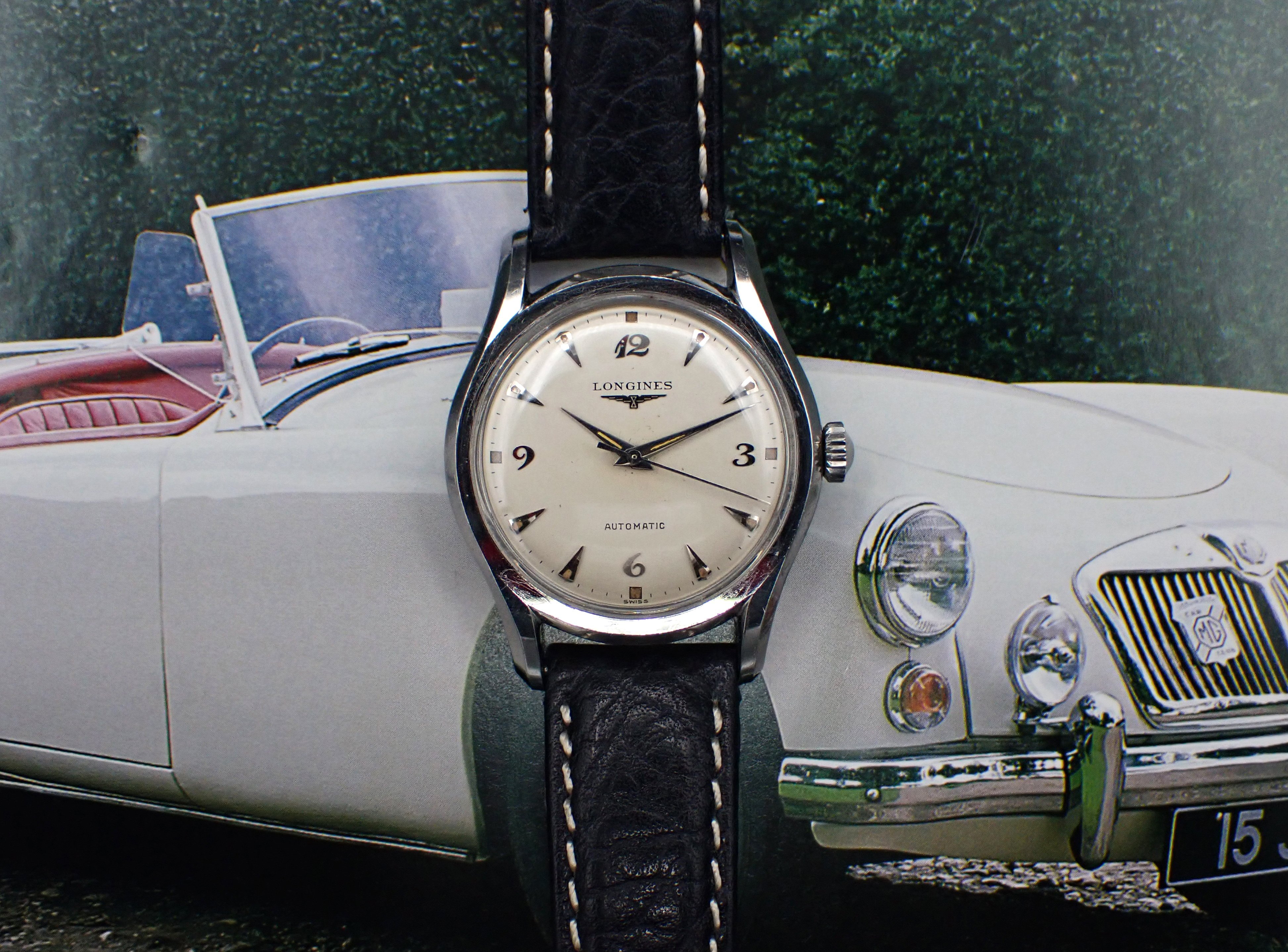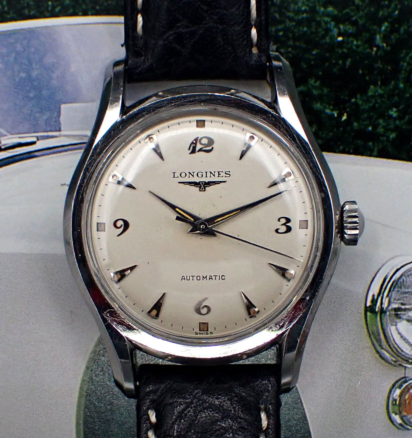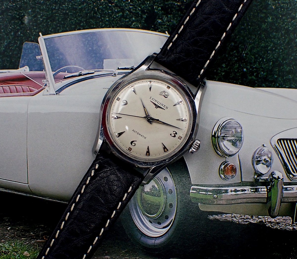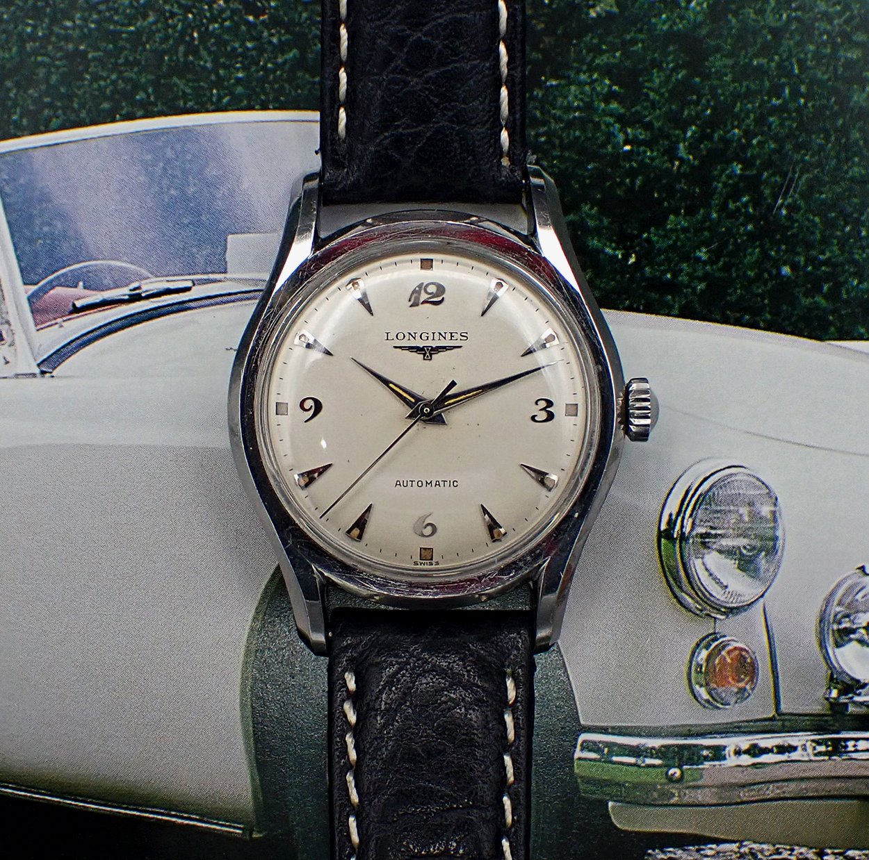 DIAL & HANDS: Beautiful original factory printed white dial with applied silver Breguet numerals for the quarter Arabics, silver teardrop “dagger” markers for the rest and attractively aged radium luminous markers all around. Applied winged hourglass logo and LONGINES printed in black on the dial below “12”, with AUTOMATIC printed above the “6”. This wonderful dial has aged to a warm and creamy ivory patina, which is beautifully complimented by the biscuity hue of the aged luminous plots. This dial does shows some light spotting and a minor mark or two but this is quite hard to see with the naked eye - Very Good original condition overall on this super charming vintage Longines dial. Polished silver pointed “dauphine”-style hour and minute hands with original luminous fill that matches the dial’s nicely, perhaps just a shade lighter, and the baton sweep seconds hand are all quite bright and attractive - Excellent condition. Simply a wonderful execution of the ever popular Breguet numeral dial!