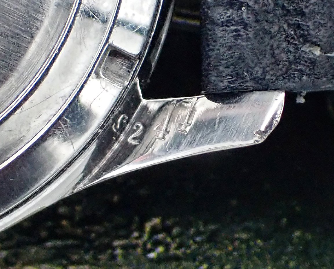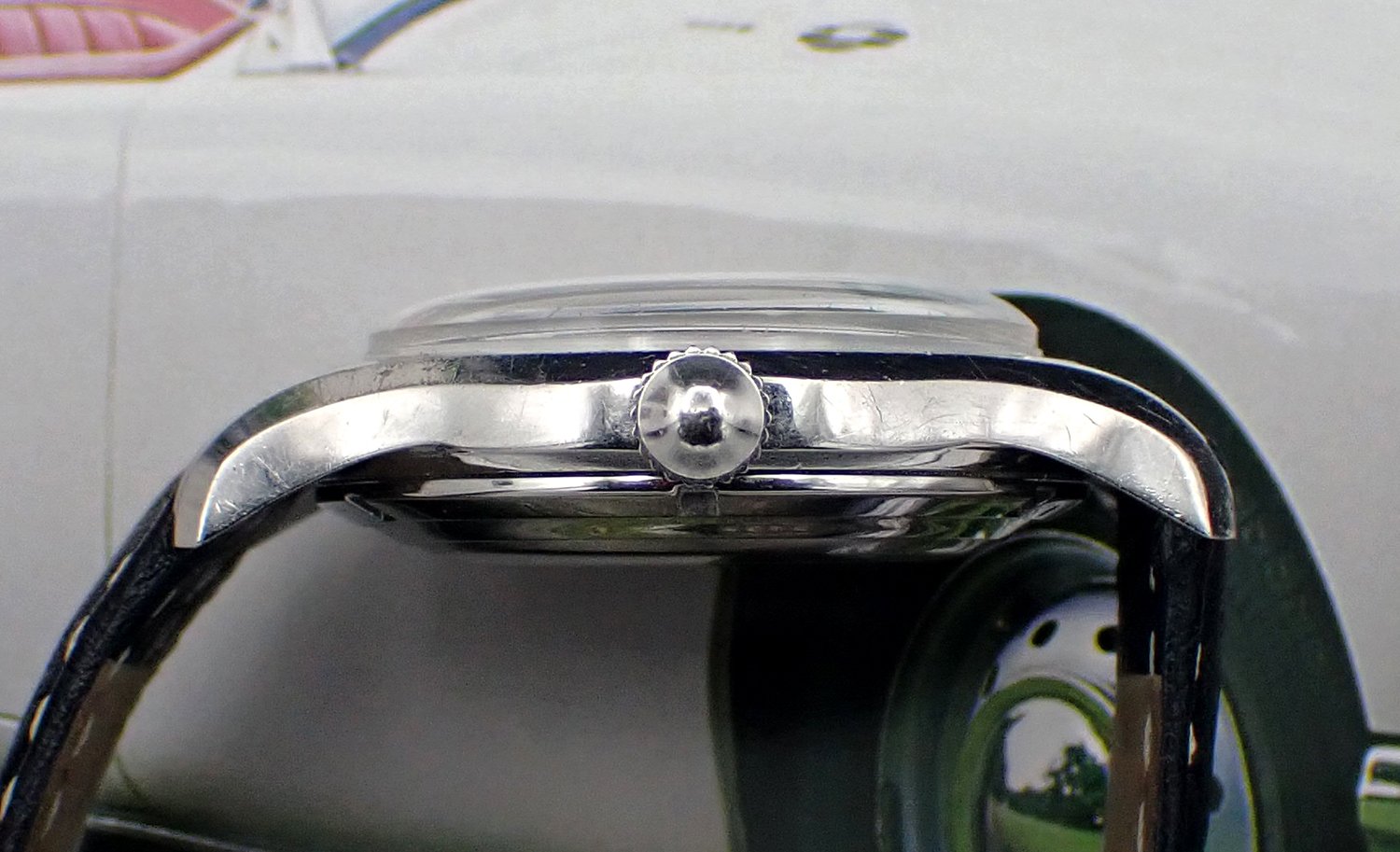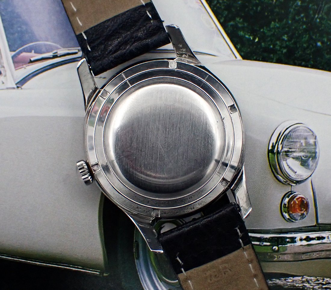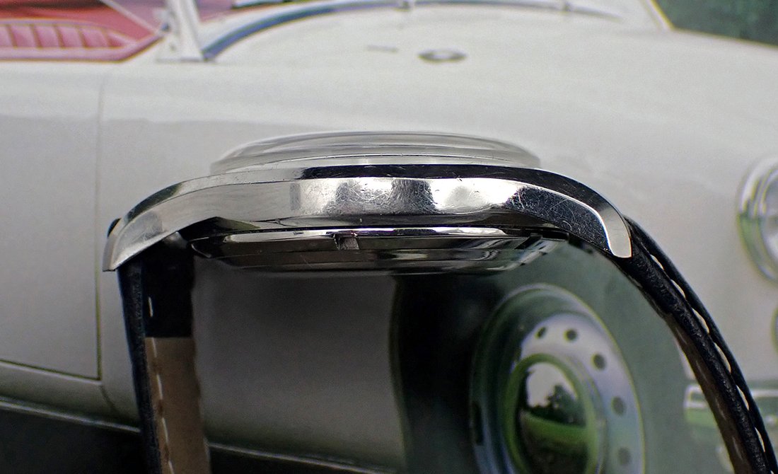 CROWN: Correct, unsigned “bowler”-style push-in knurled steel crown is Excellent cosmetically and sits flush to the case. It winds smoothly and pulls out to the time setting position exactly as designed.