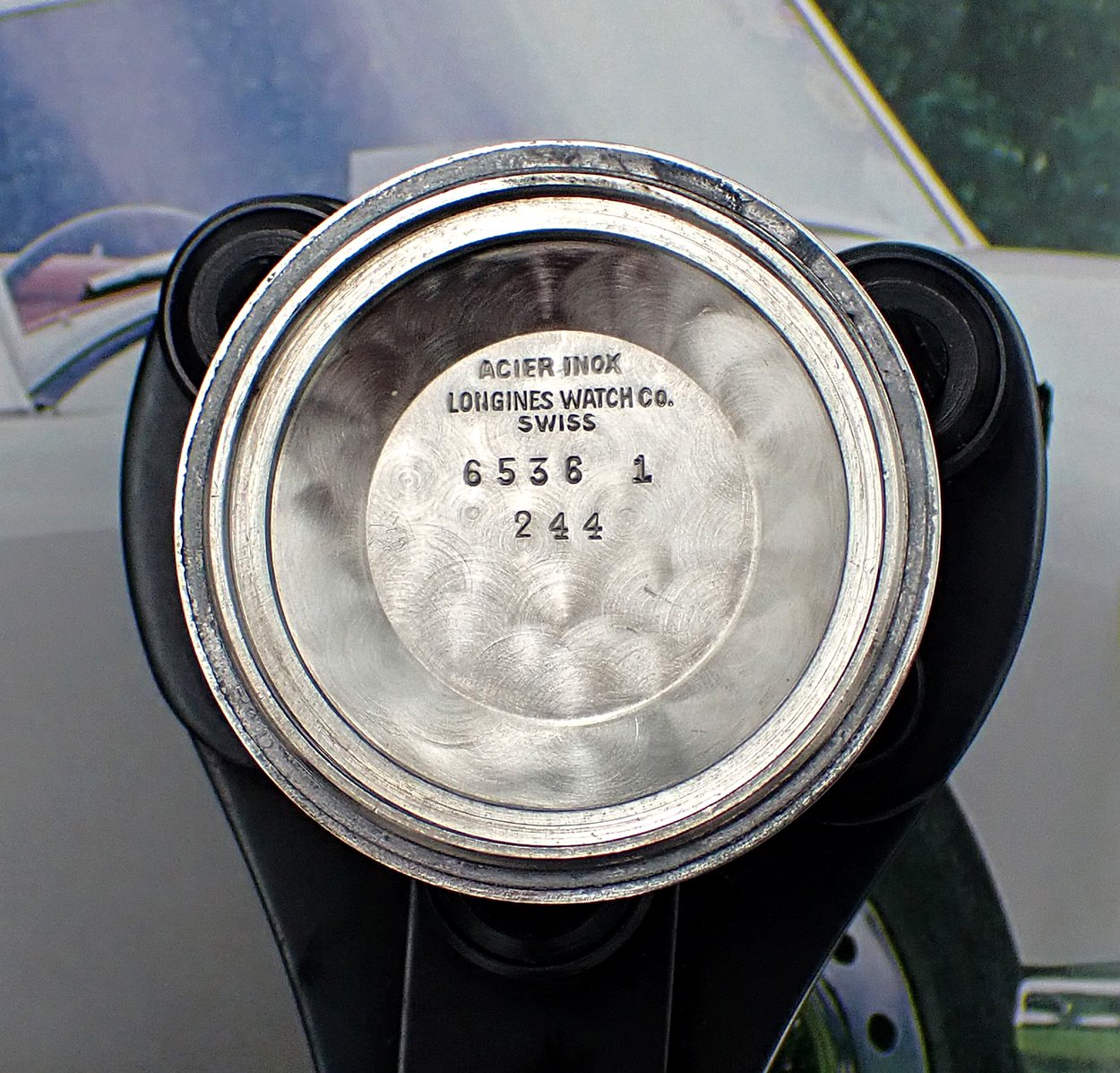 CASE & BACK: Classically proportioned two-piece all-steel screw back case measure 35 mm wide (not including crown) x 44 mm long x about 12 mm tall to the top of the crystal. It appears unpolished and features very sharp edges, facets and curved Bombé-style lugs, as well as a completely flat bezel extremely similar to Patek Phillipe's famous 565 case design. Overall, the case is in Excellent vintage condition, with only small scratches and wear marks for a watch of this age. The notched, water resistant caseback also has only minor scratches, likewise Excellent original condition for a 70-year-old watch. Outer caseback is dedication-free and the inner case and back lip show negligible corrosion at their contact points. Inner back is stamped with the correct Longines nomenclature for a steel watch of the time, including not only the 6536-1 reference number but also a unique case number, “244”, that is also stamped on the underside of the top left lug. All in all, this is a really cool and dare I say unique case shape that is very pleasing to wear and admire on the wrist.