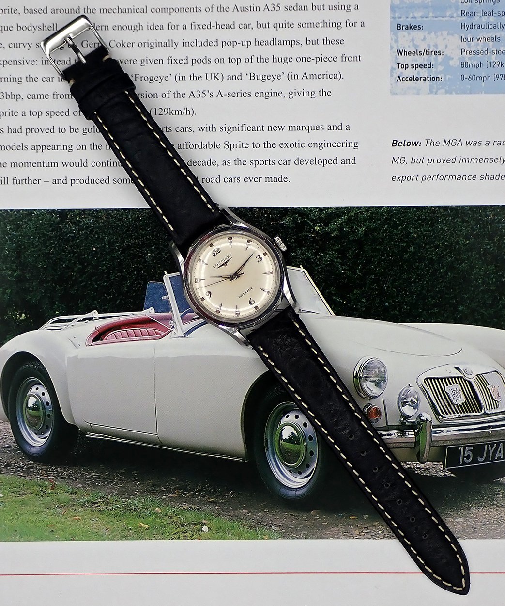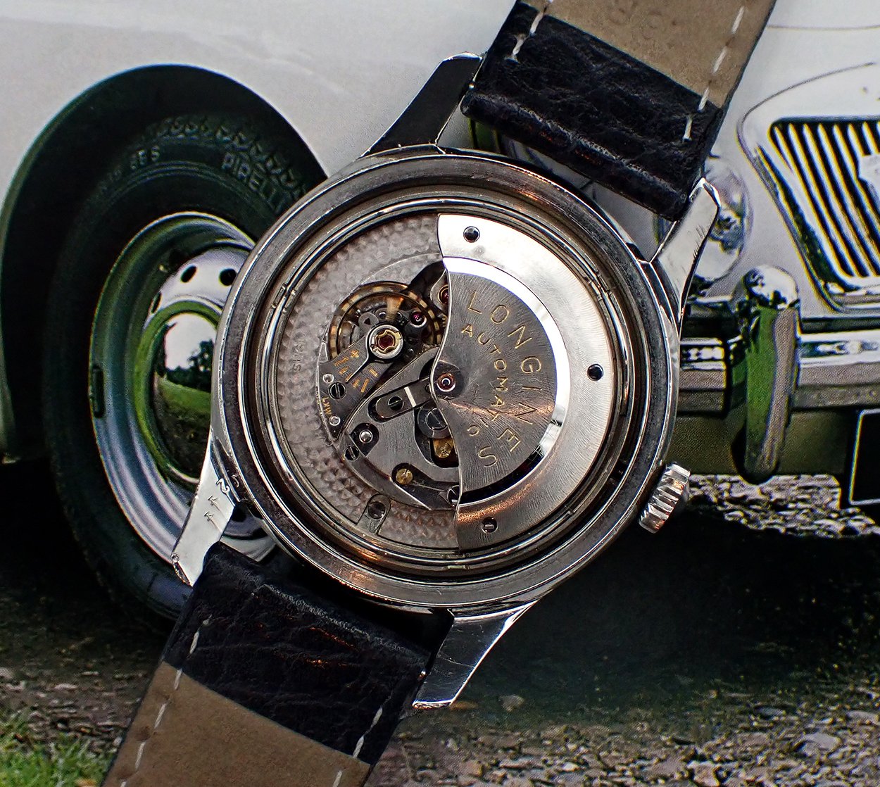 BAND: This Longines comes on a new water resistant grained black leather strap with sporty white contrast stitching that really compliments the watch nicely, IMO. It also features a generic steel buckle. This classic Longines takes 18 mm straps.