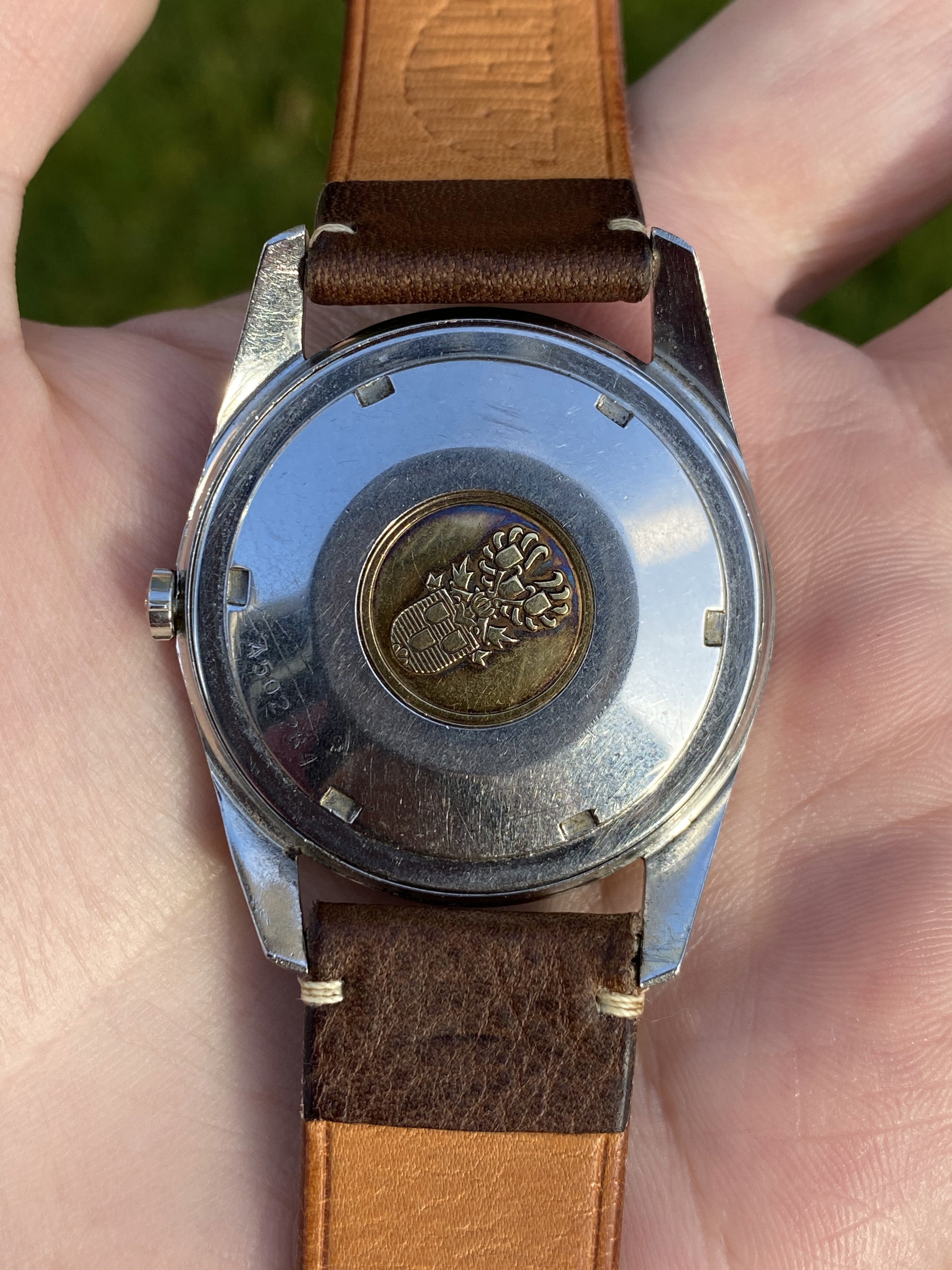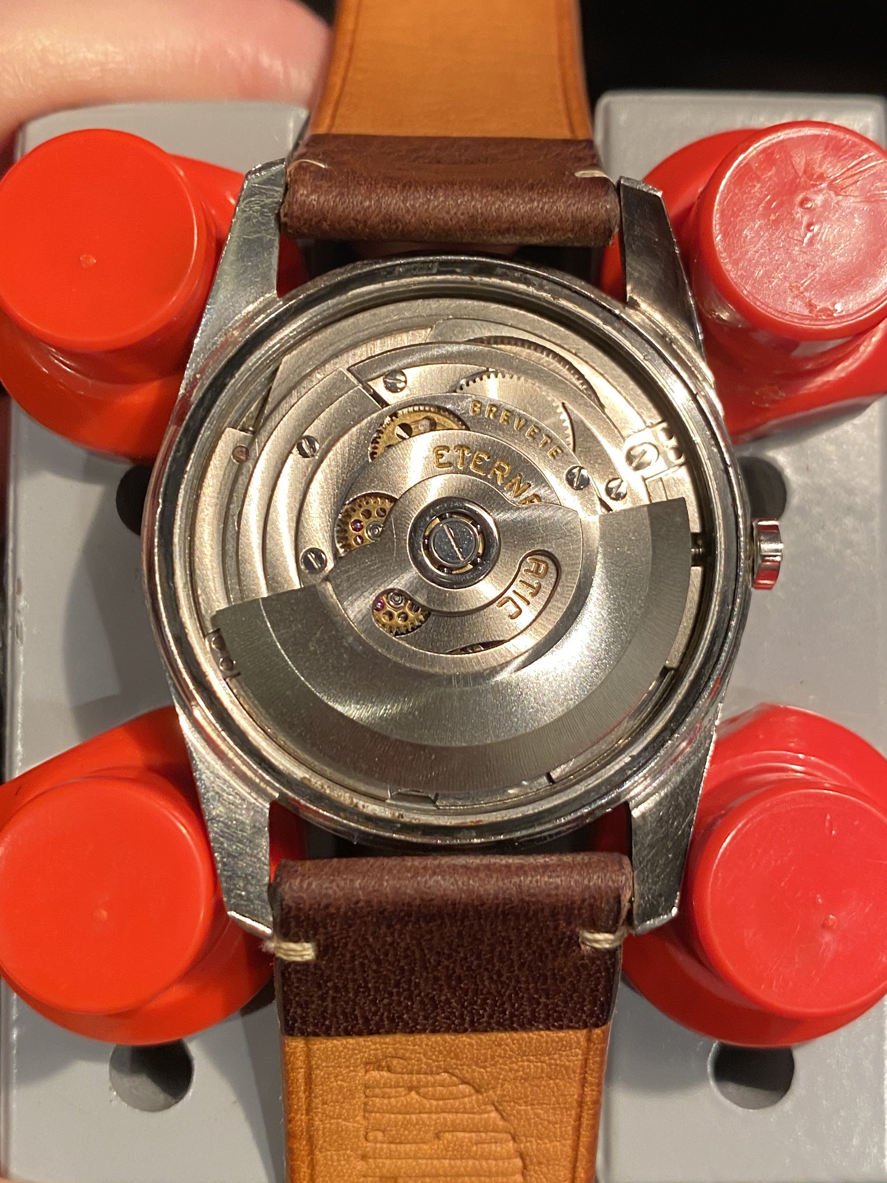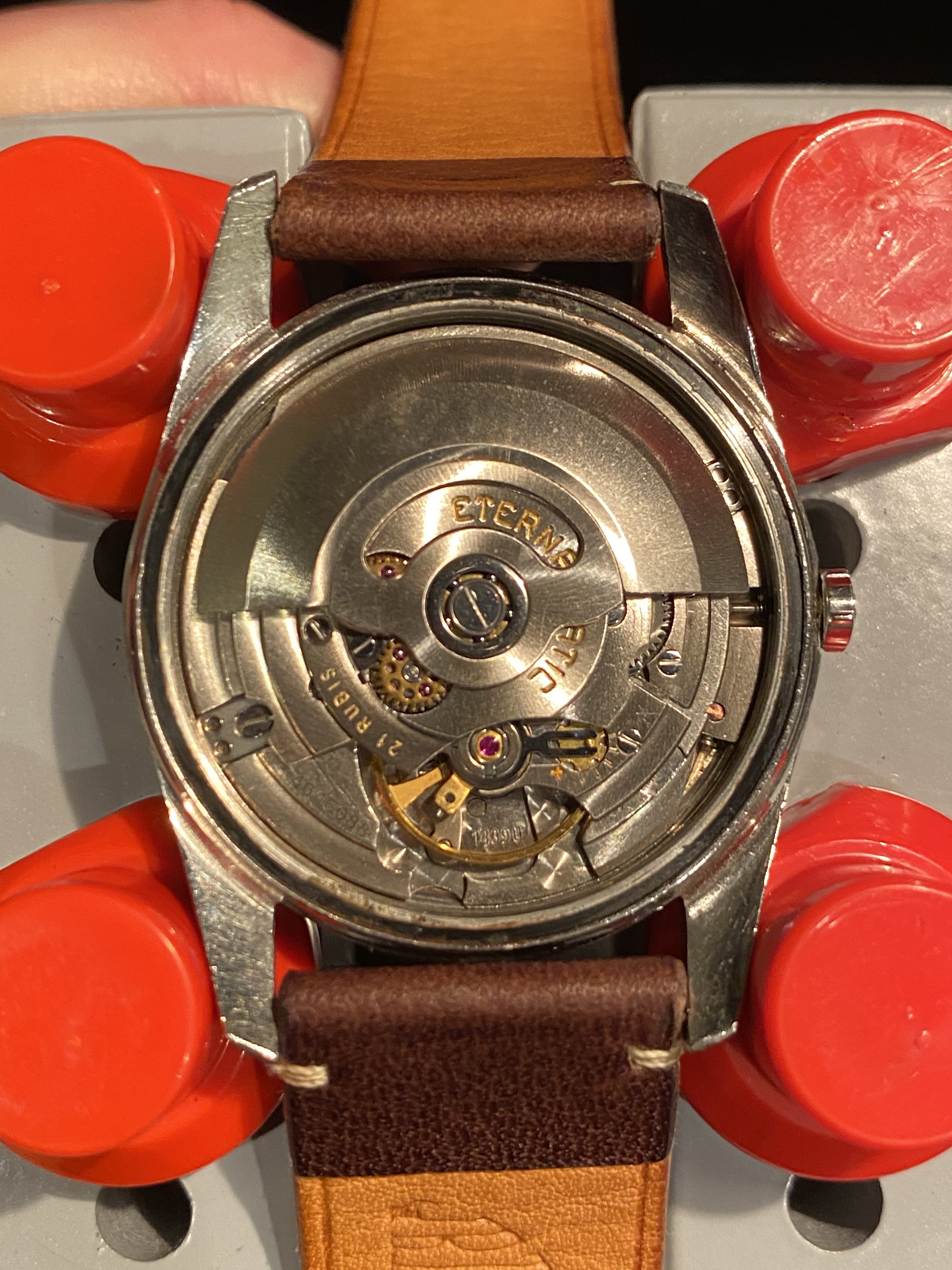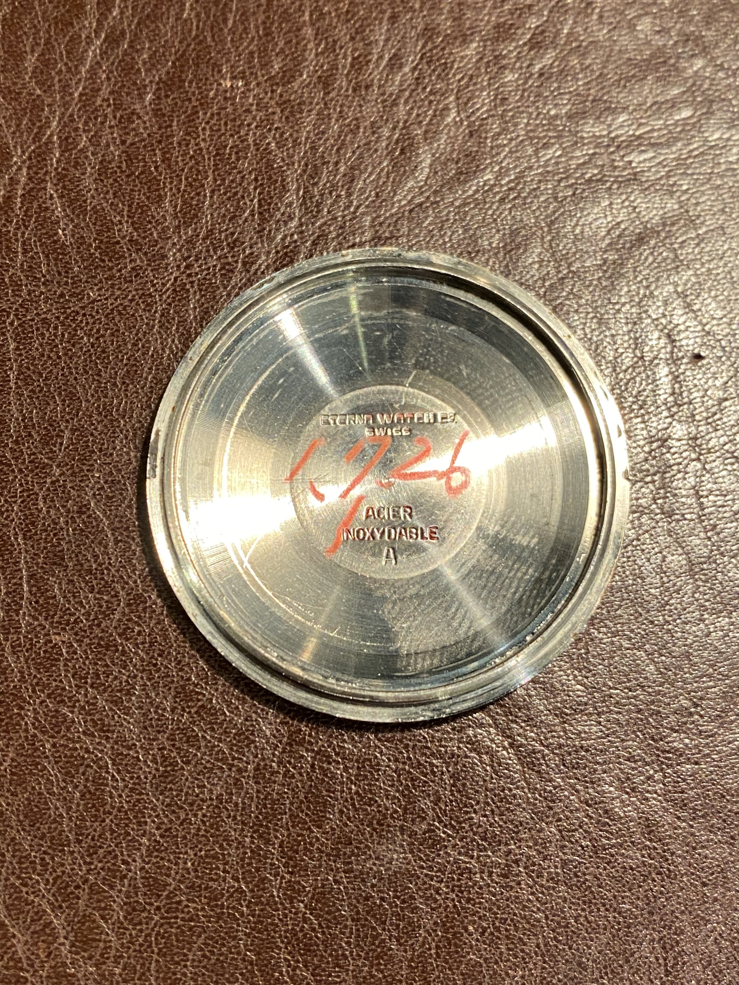 Case: Original 35mm stainless steel case is unpolished and features a very uncommon gold Schild family crest medallion in the caseback. While uncommon, these are legitimate references found on only the Chronometer marked Centenaires (here's another example posted here on the forum recently). Full background isn't fully known on the caseback, but the Schild family was involved in the founding of Eterna, so presumably this is some sort of commemorative caseback. The case is in nice condition with the exception that the bottom-right lug is ever so slightly bent downwards. It isn't very noticeable in hand, and it doesn't impact strap fit or wearability so you could leave it as-is or have a watchmaker bend it back into position.