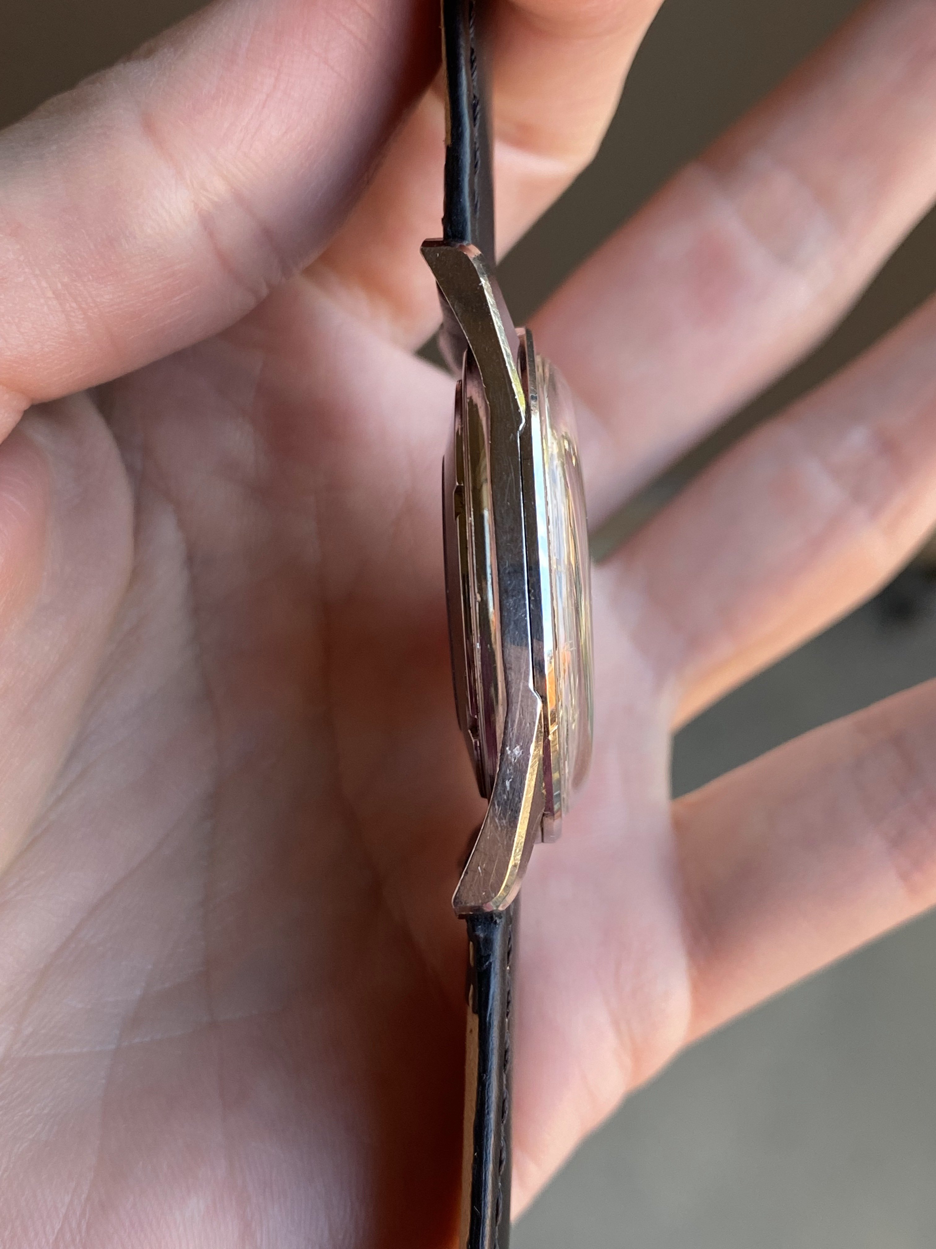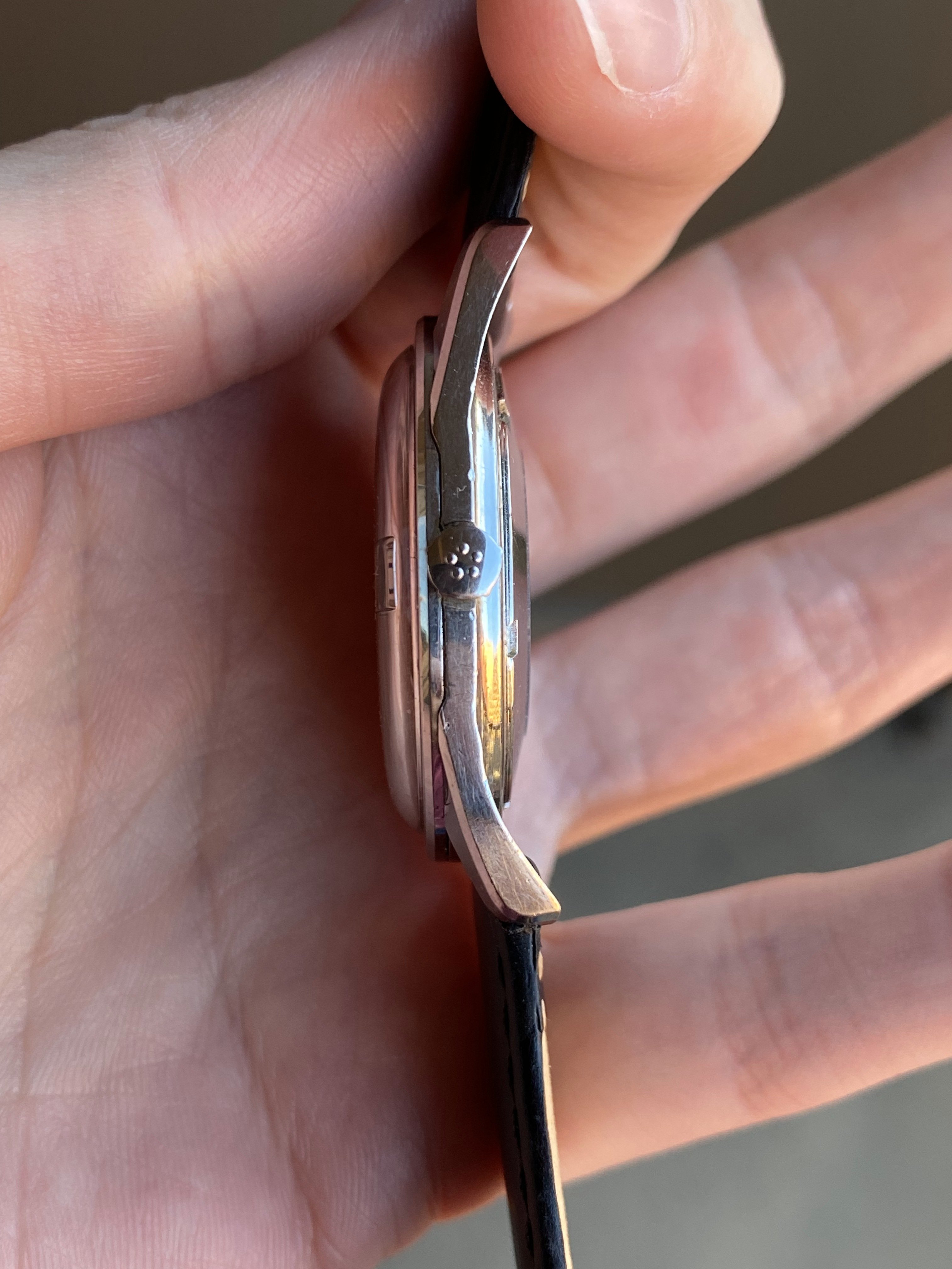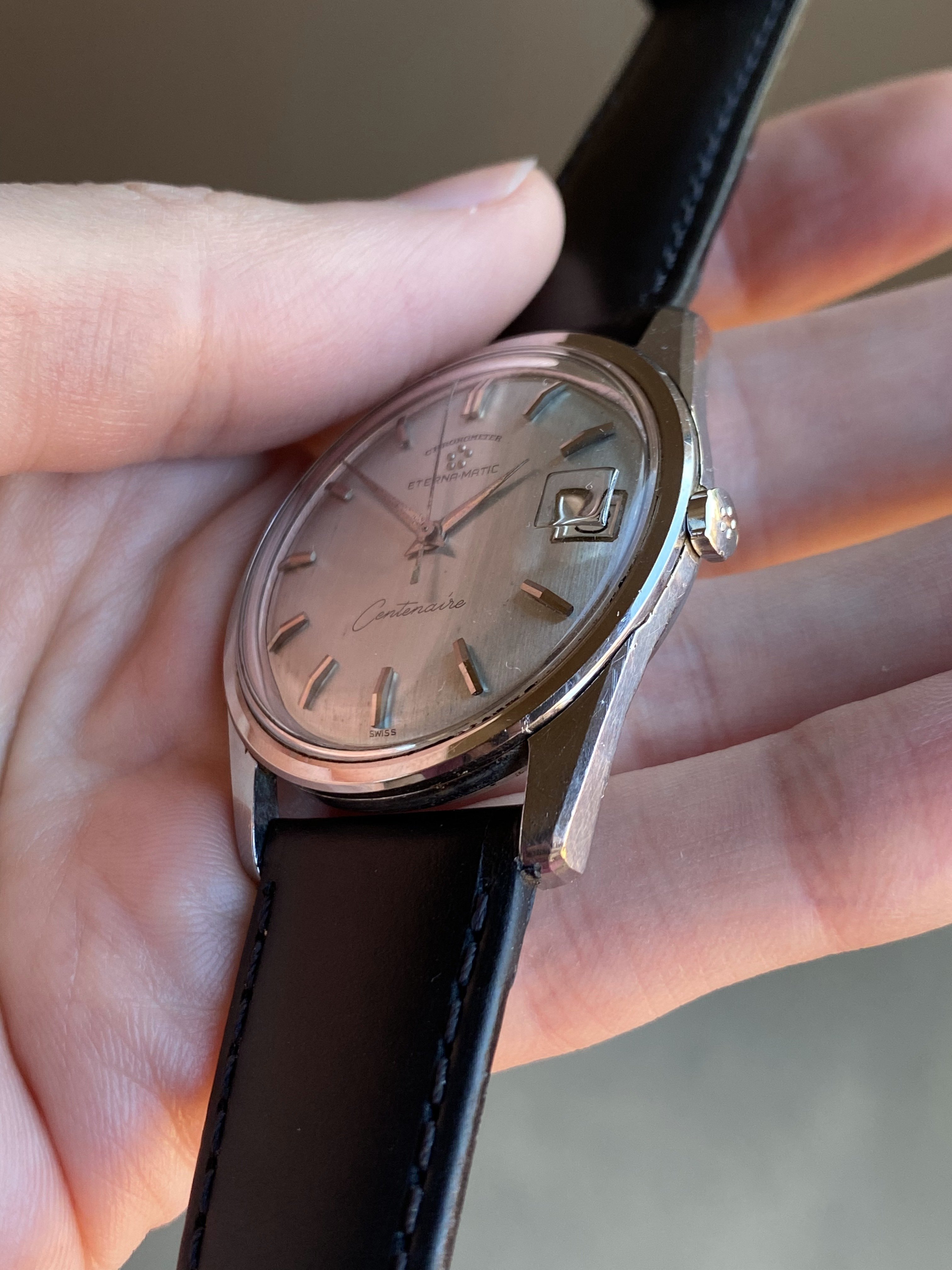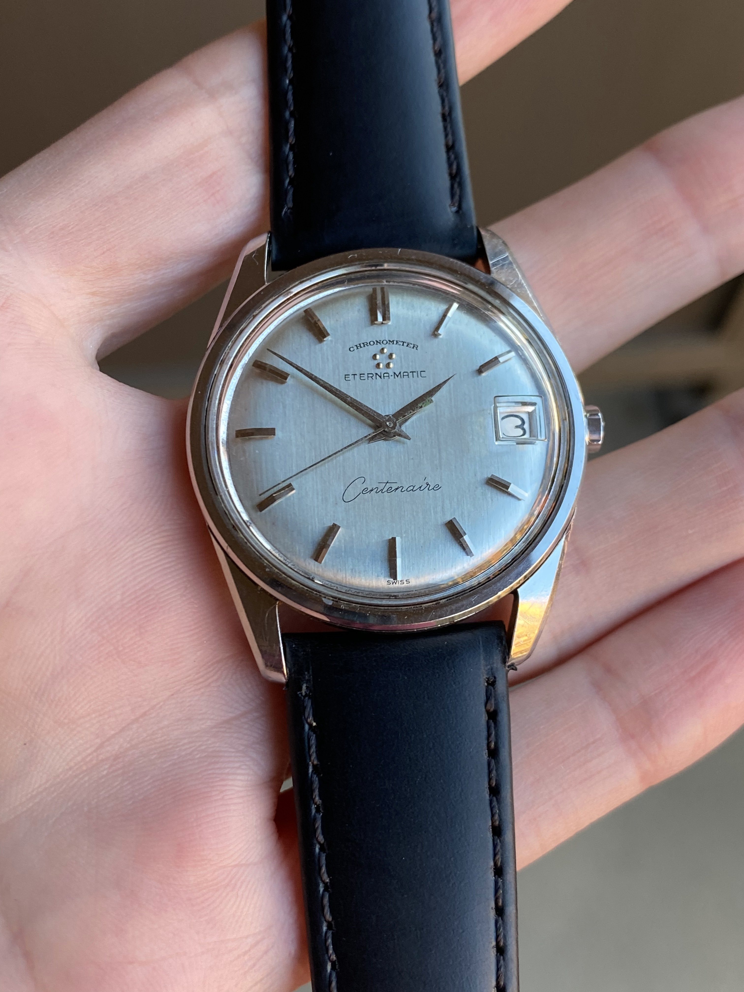 Case: Original 35mm stainless steel case is unpolished and features a very uncommon gold Schild family crest medallion in the caseback. While uncommon, these are legitimate references found on only the Chronometer marked Centenaires (here's another example posted here on the forum recently). Full background isn't fully known on the caseback, but the Schild family was involved in the founding of Eterna, so presumably this is some sort of commemorative caseback. The case is in nice condition with the exception that the bottom-right lug is ever so slightly bent downwards. It isn't very noticeable in hand, and it doesn't impact strap fit or wearability so you could leave it as-is or have a watchmaker bend it back into position.