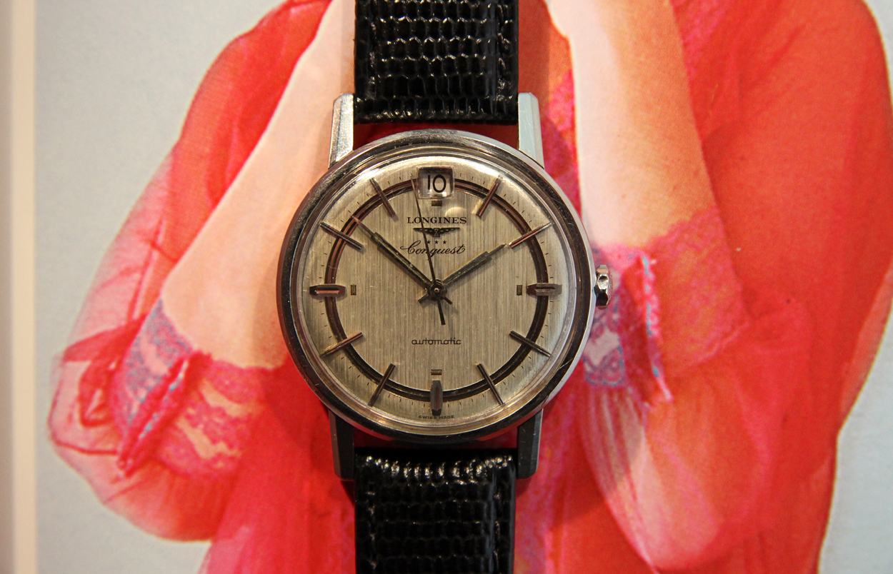 Up for sale is this all-time classic 1960 Longines Conquest reference 9024 in stainless steel 3-piece water resistant case. This example features a beautiful original brushed silver dial with very cool, highly stylized markers placed upon a polished sunken beveled track and date at "12". This Conquest is one of the classic mid-century Longines vintage dress models and is in Excellent original vintage condition overall, with a sharp case and green-enameled "fish" caseback medallion intact. It is powered by the excellent in-house caliber 291 full-rotor automatic movement with date complication, one of Longines' finest movements back in the day. This long-lugged beauty is a classic gent's dress size at 35mm in diameter but definitely wears larger due to the large face and big wingspan. It was recently overhauled by my watchmaker for years' more faithful service to its new owner and therefore will come with a 6-month movement guarantee for all normal non-abusive use. Additionally, the new owner will also get a PDF copy of an email from Longines' excellent Heritage department confirming that the movement & case match and that the watch was originally invoiced in 1960 to their UK agent at that time, Baume & Co.