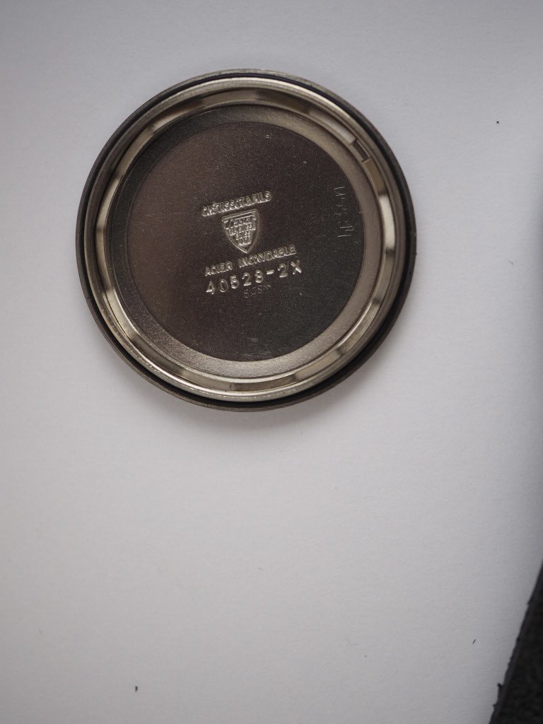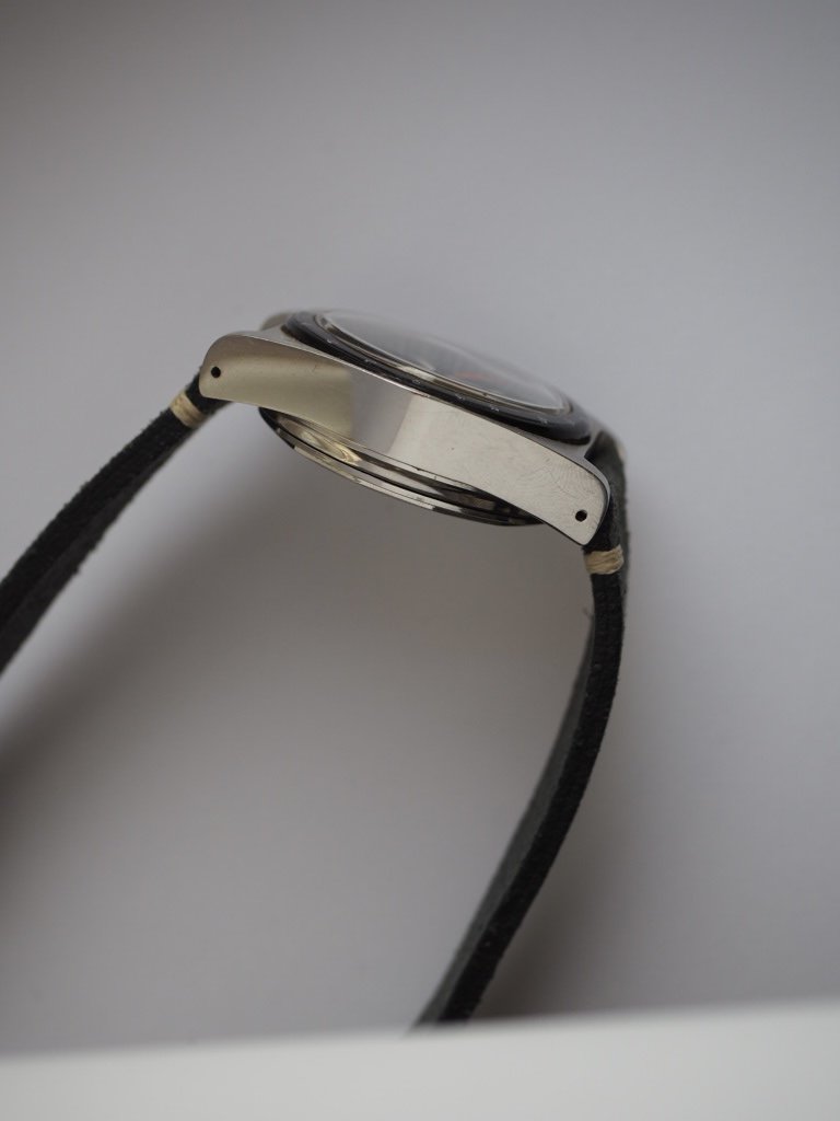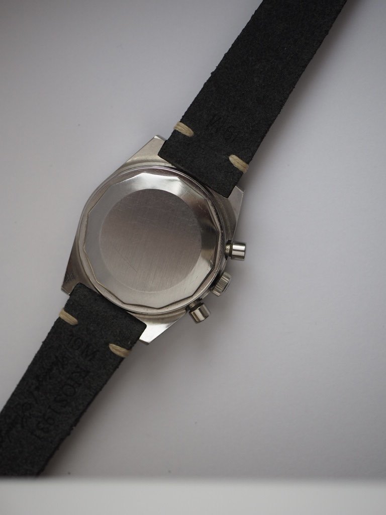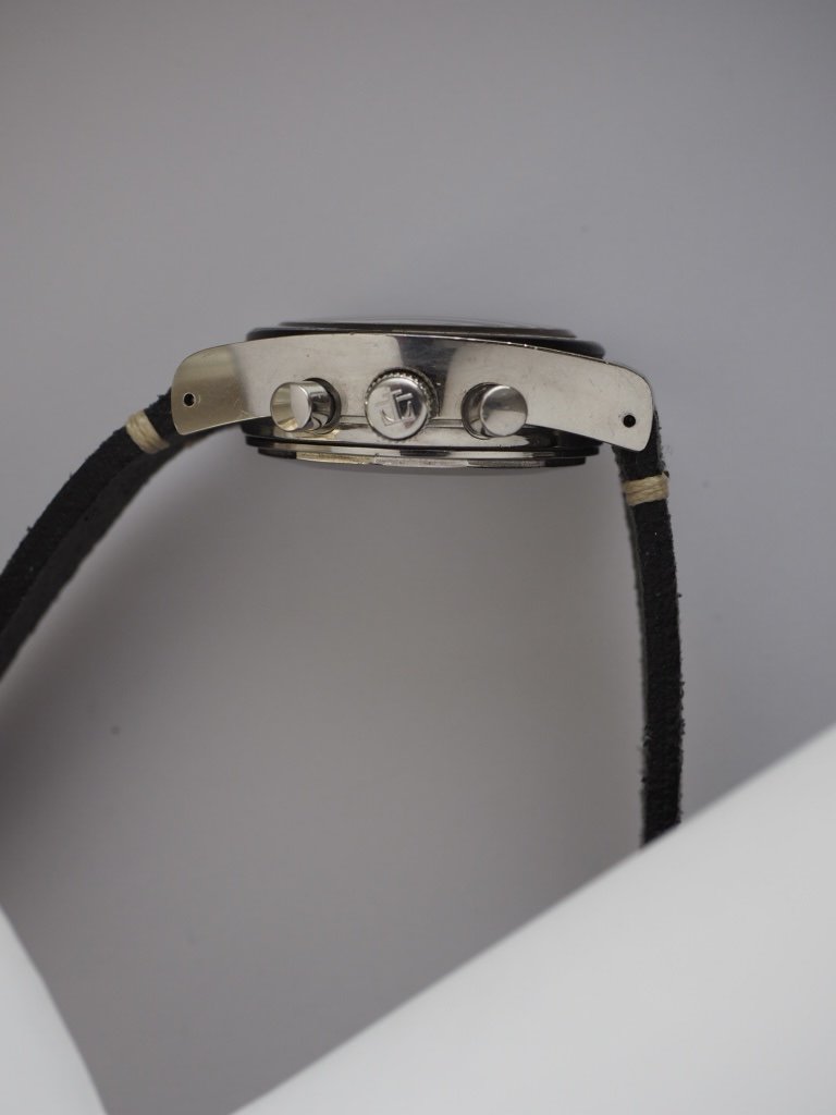 The chrono is 36 mm wide, has ca. 42 mm lugwidth and a height of ca. 18mm. Due to this rather bulky height, it has a great wristpresence. Only notable flaws are a slight misalignment of the hour counter hand (positioned incorrectly by my watchmaker), some ageing-related imperfections on the outer bezel and a few nicks on the crystal.