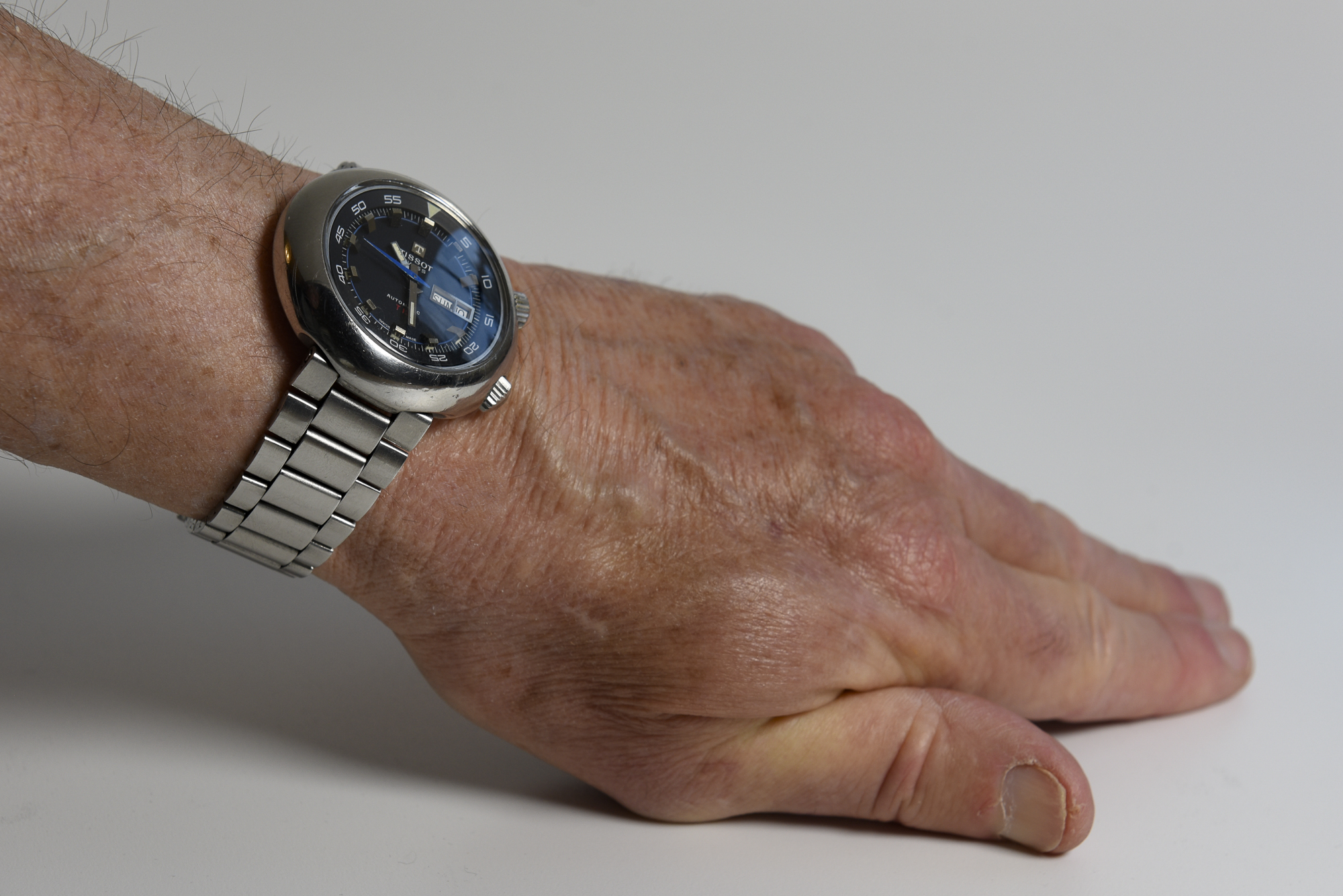 Don't let the 44mm Case Diameter put you off. I typically avoid watches with a Case Diameter great than 40mm unless the watch just knocks my socks off. This does not wear like a 44mm watch, I think it has to do with the size and design of the bezel, which slopes away from the dial pretty dramatically and on the wrist what is visible is the Dial