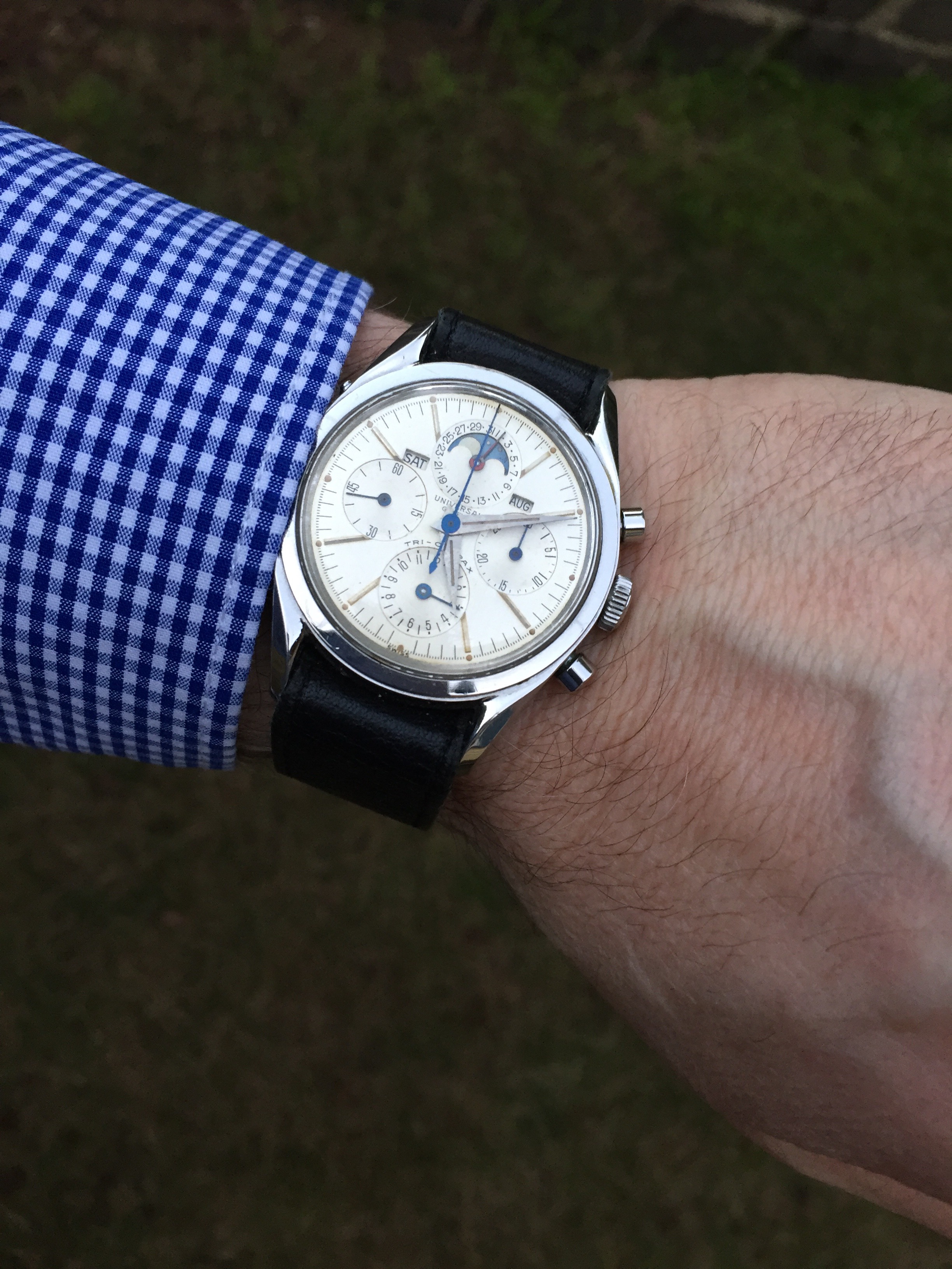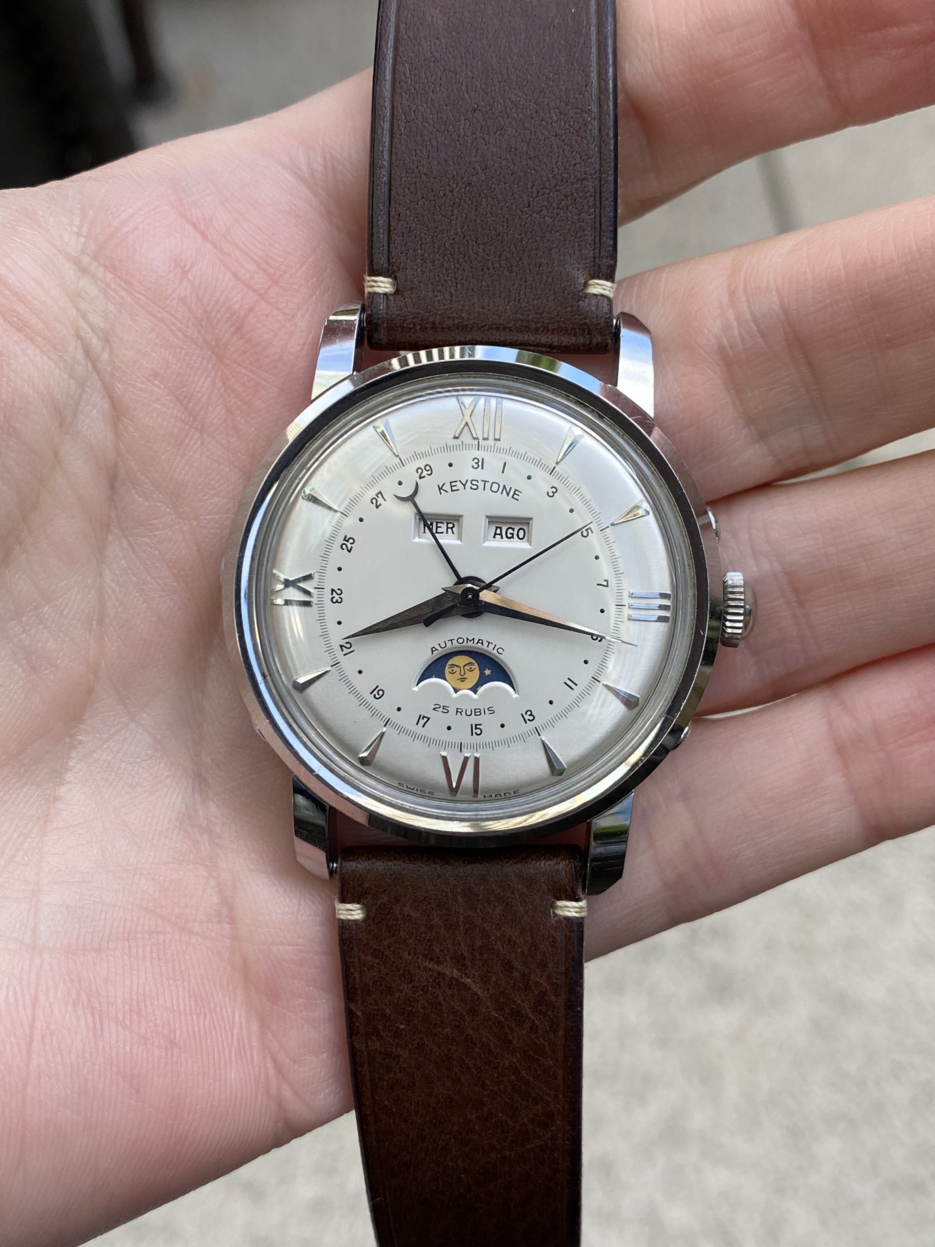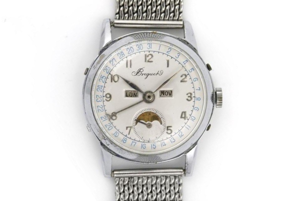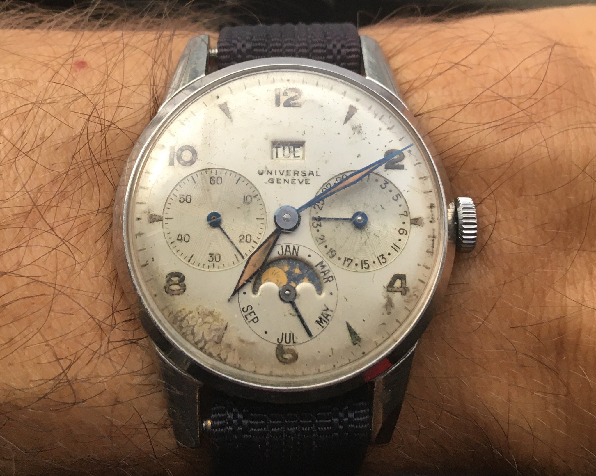 It's listed as a 1950s Breguet, steel, manual winding, caliber 382 triple date moonphase. But a couple of alarms are going off in my head. For one thing, I can't find any other example of a Breguet TDMP. For another, the T in the signature appears to be missing the cross-stroke. For yet another, I can't find any mention of Breguet ever offering a "caliber 382" (or any other manufacture with a 382 moonphase, for that matter). And yes, the discs have appeared to have aged worse than the dial.