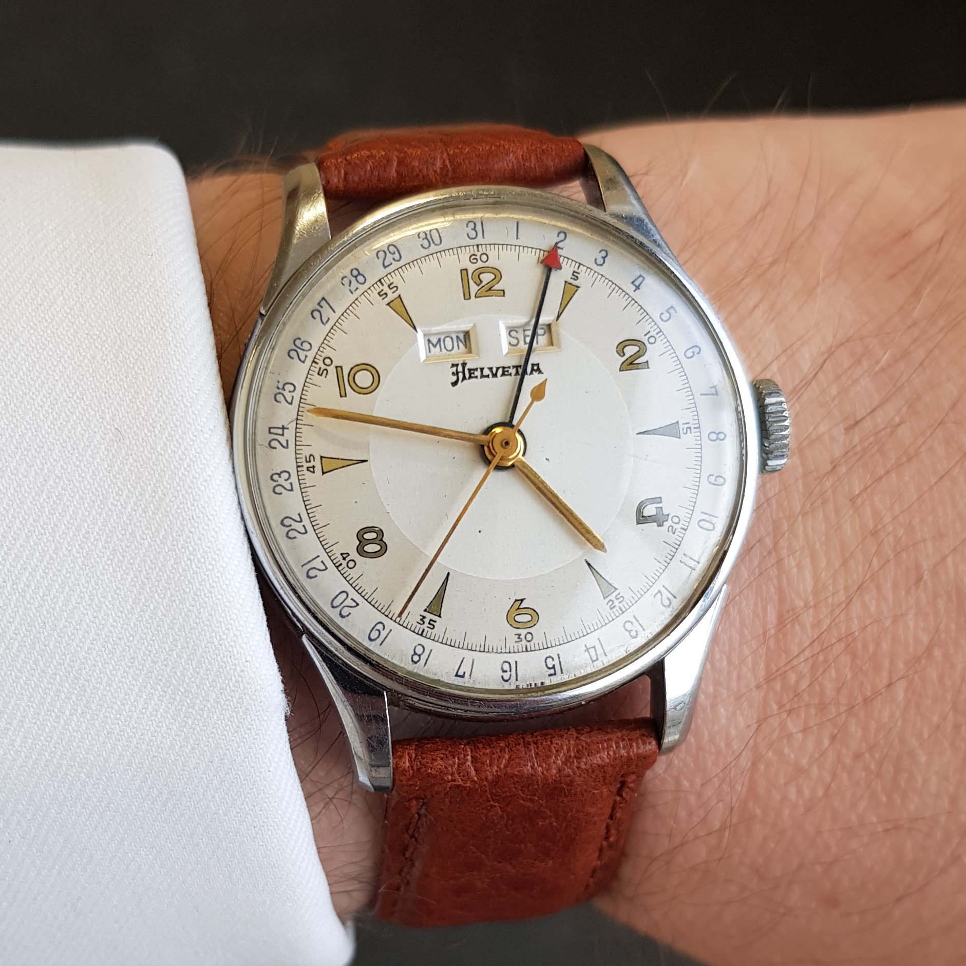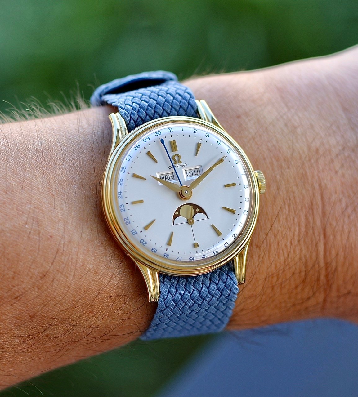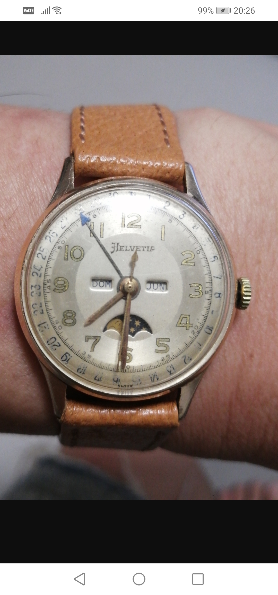 It's listed as a 1950s Breguet, steel, manual winding, caliber 382 triple date moonphase. But a couple of alarms are going off in my head. For one thing, I can't find any other example of a Breguet TDMP. For another, the T in the signature appears to be missing the cross-stroke. For yet another, I can't find any mention of Breguet ever offering a "caliber 382" (or any other manufacture with a 382 moonphase, for that matter). And yes, the discs have appeared to have aged worse than the dial.