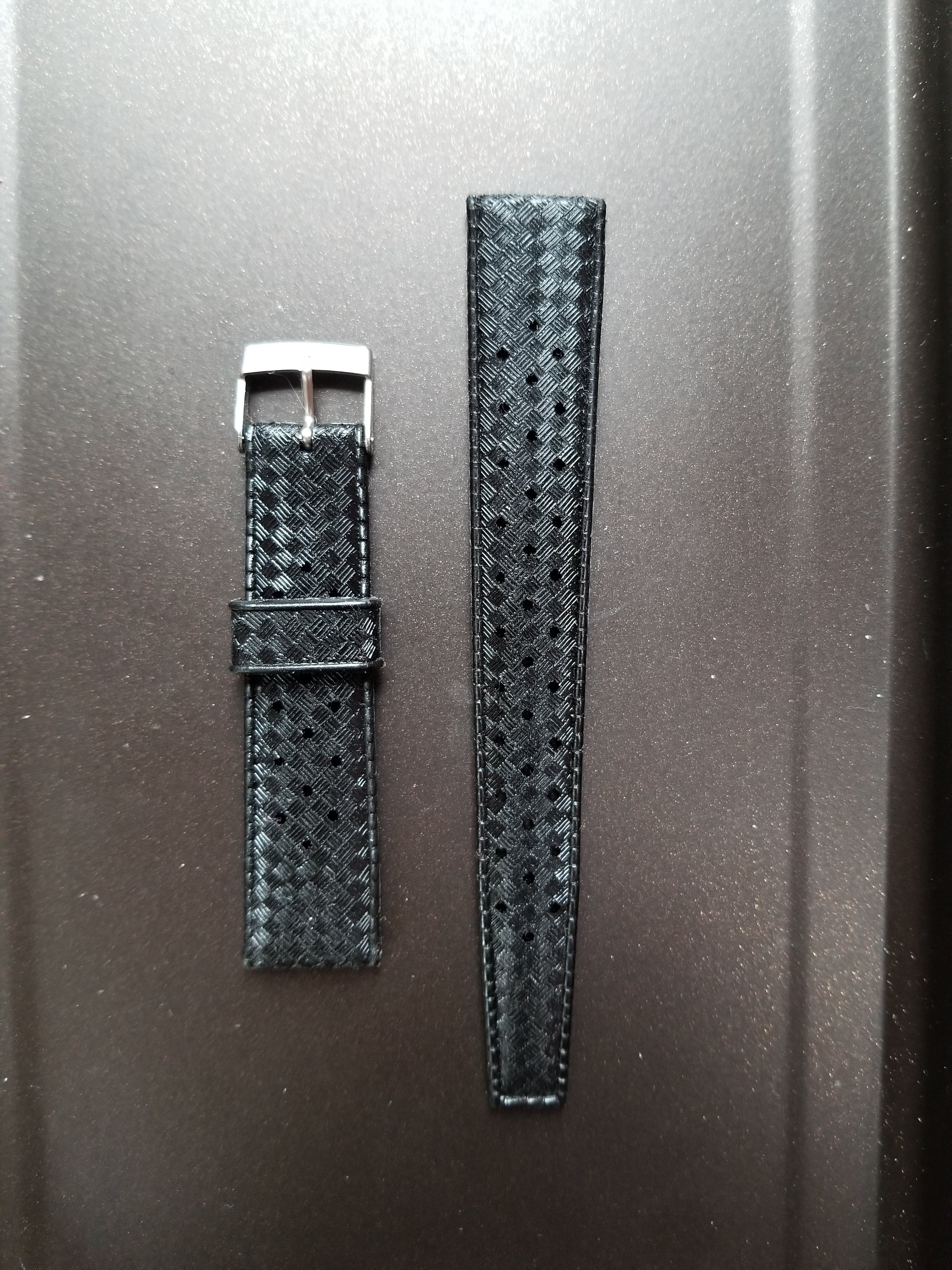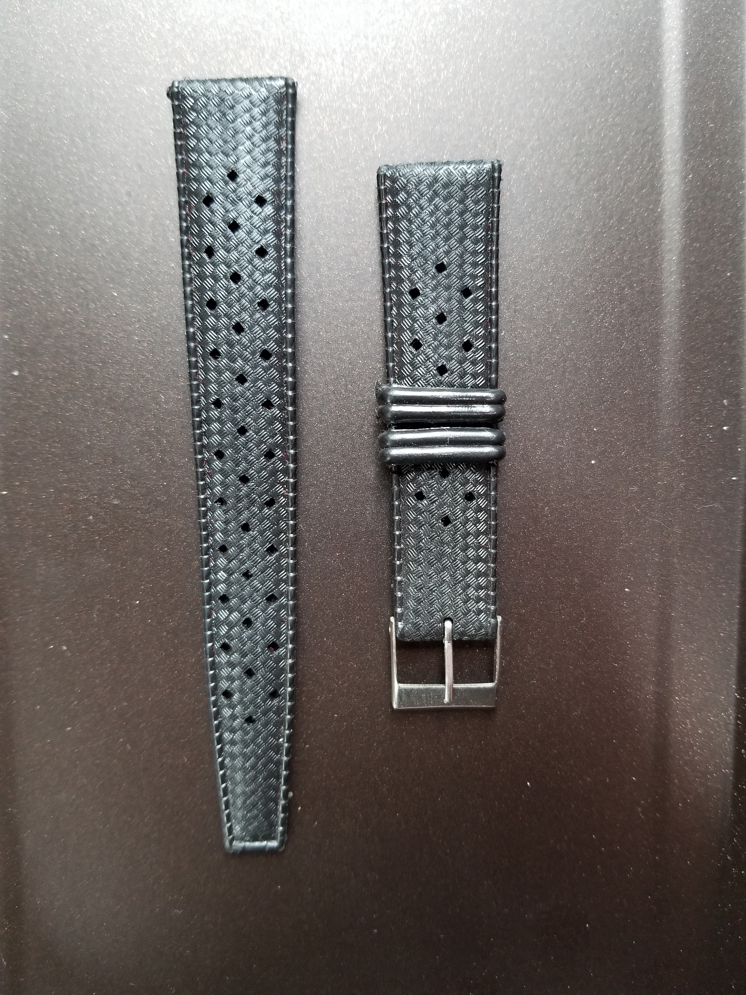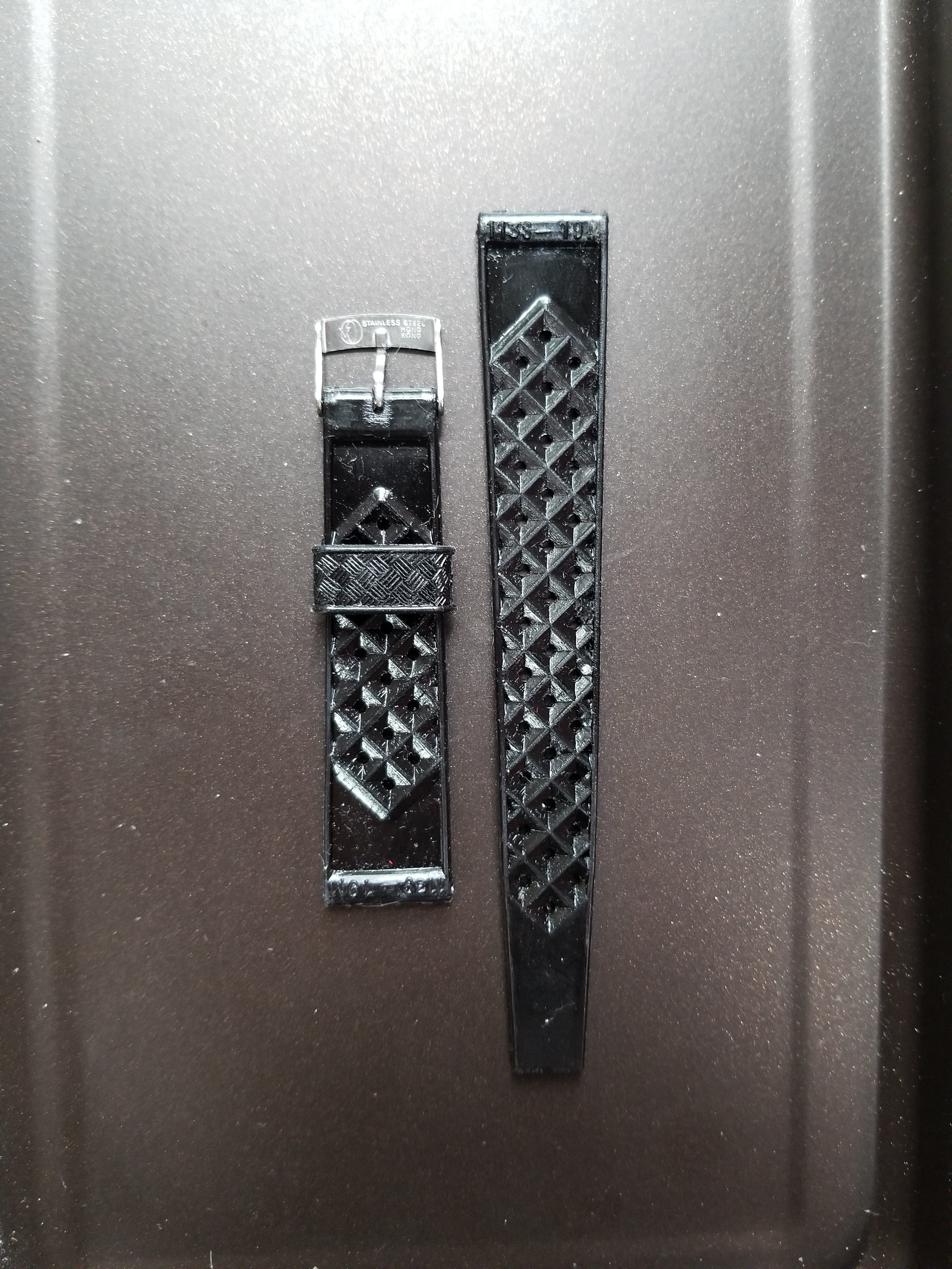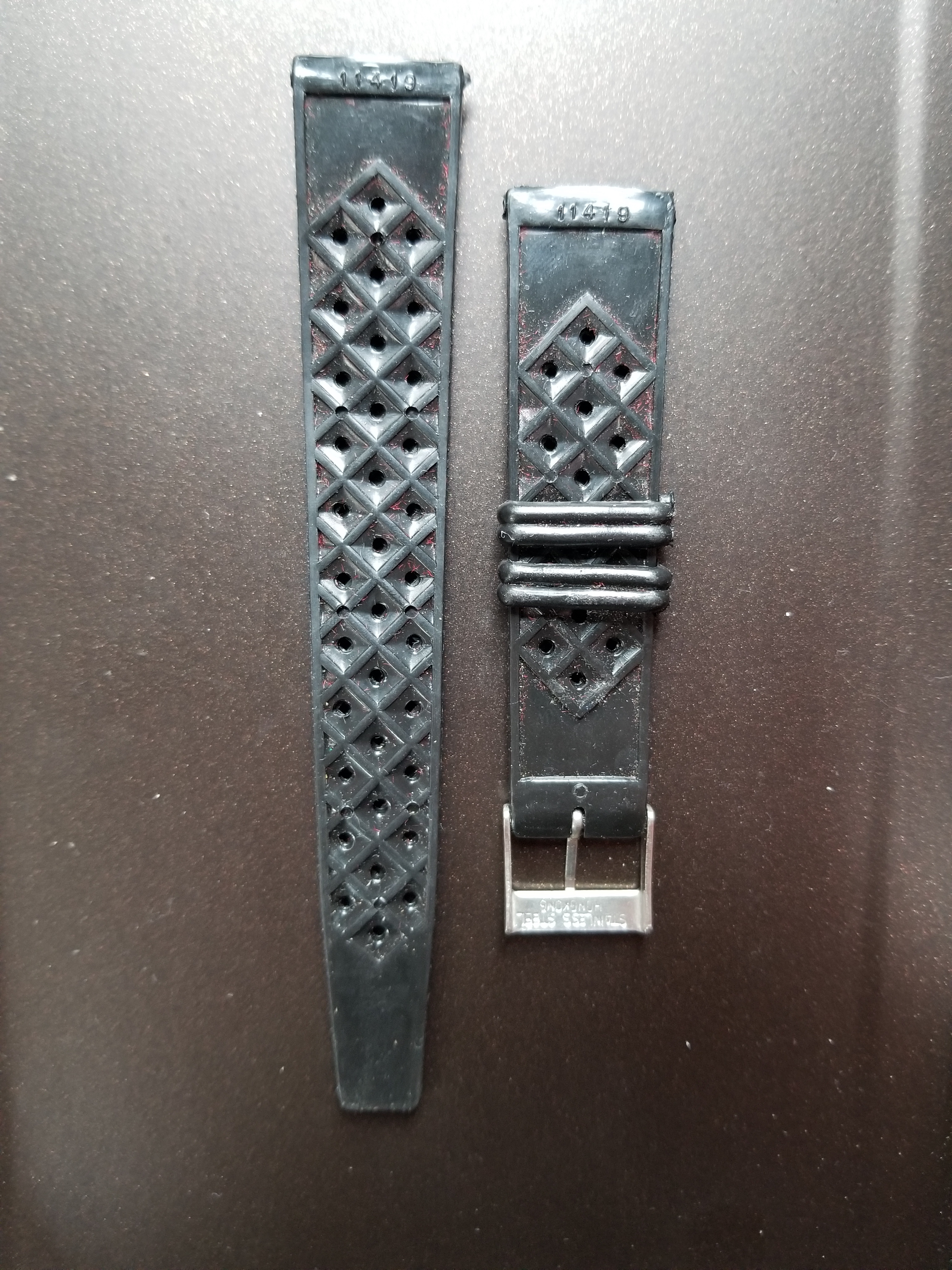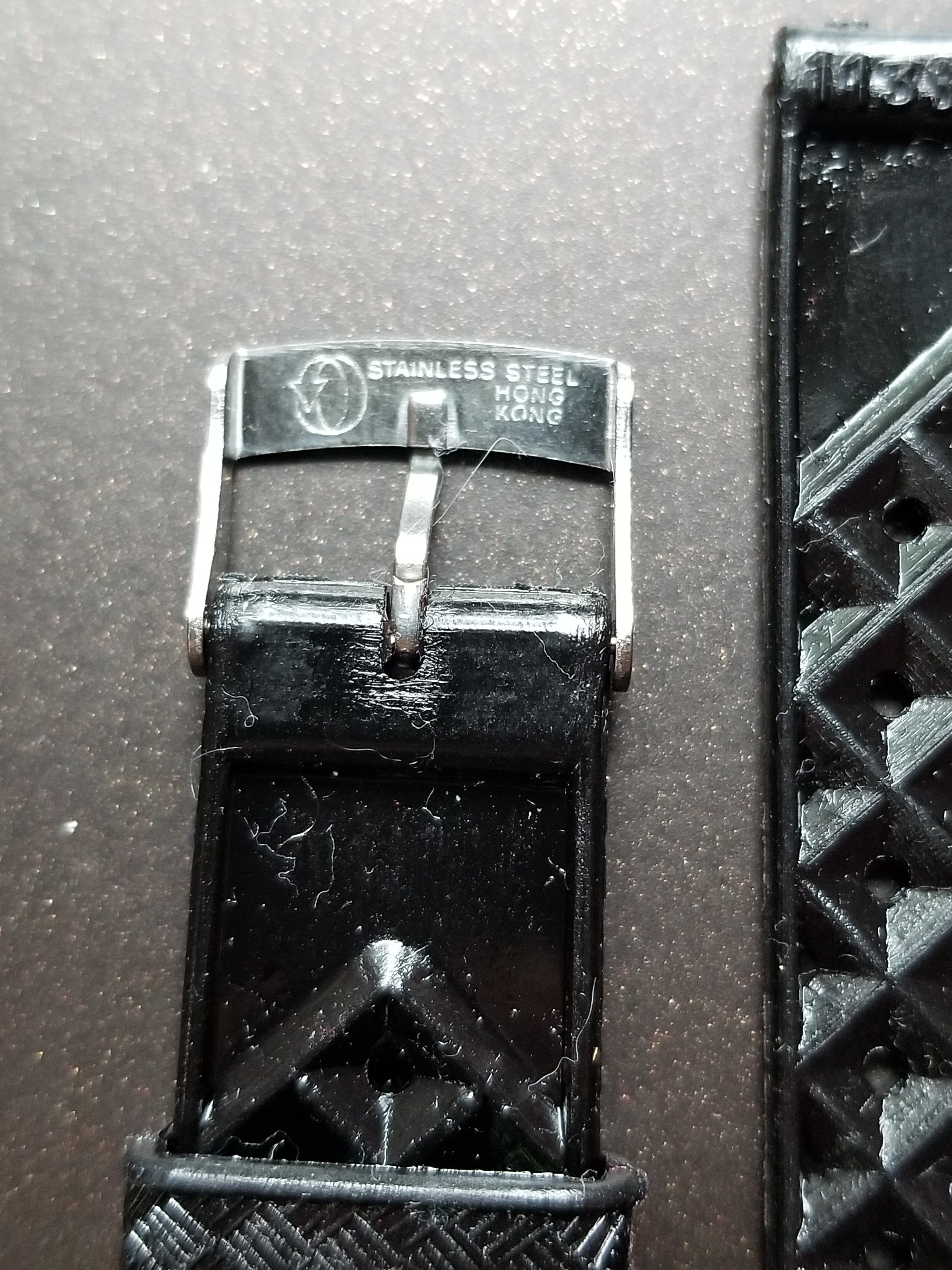 1. Vintage NOS 19mm Tropic style rubber strap. Double strap holders. Buckle signed Stainless Steel Hong Kong insude. $45 SOLD