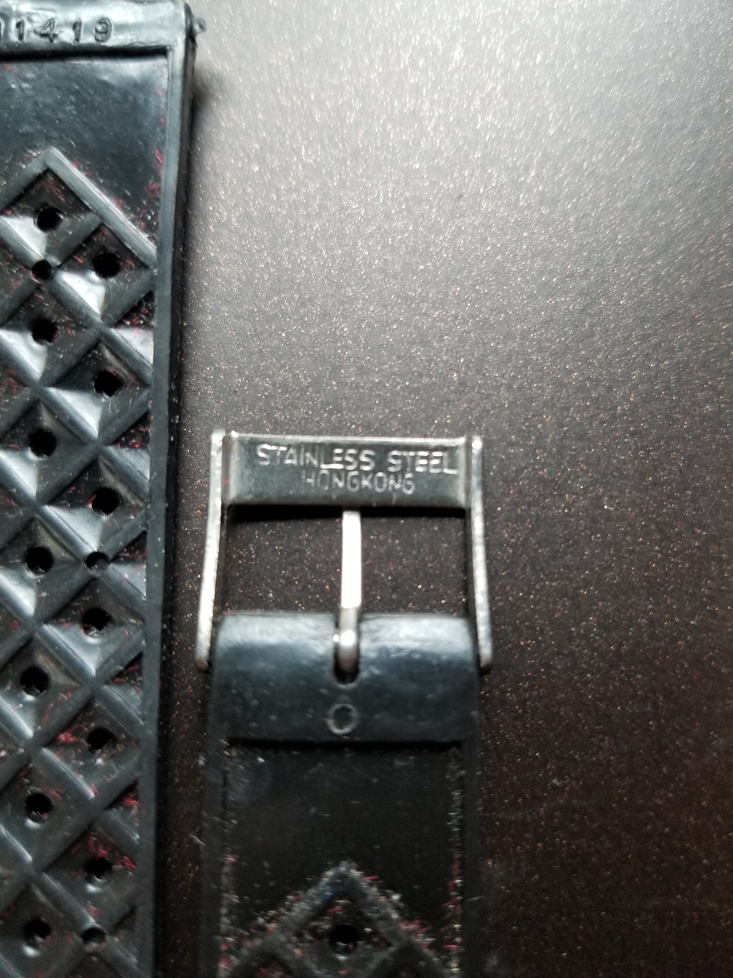 2. Vintage NOS 19mm Tropic style rubber strap. Single strap holder. Buckle signed Stainless Steel Hong Kong with an "O" logo. $45 SOLD