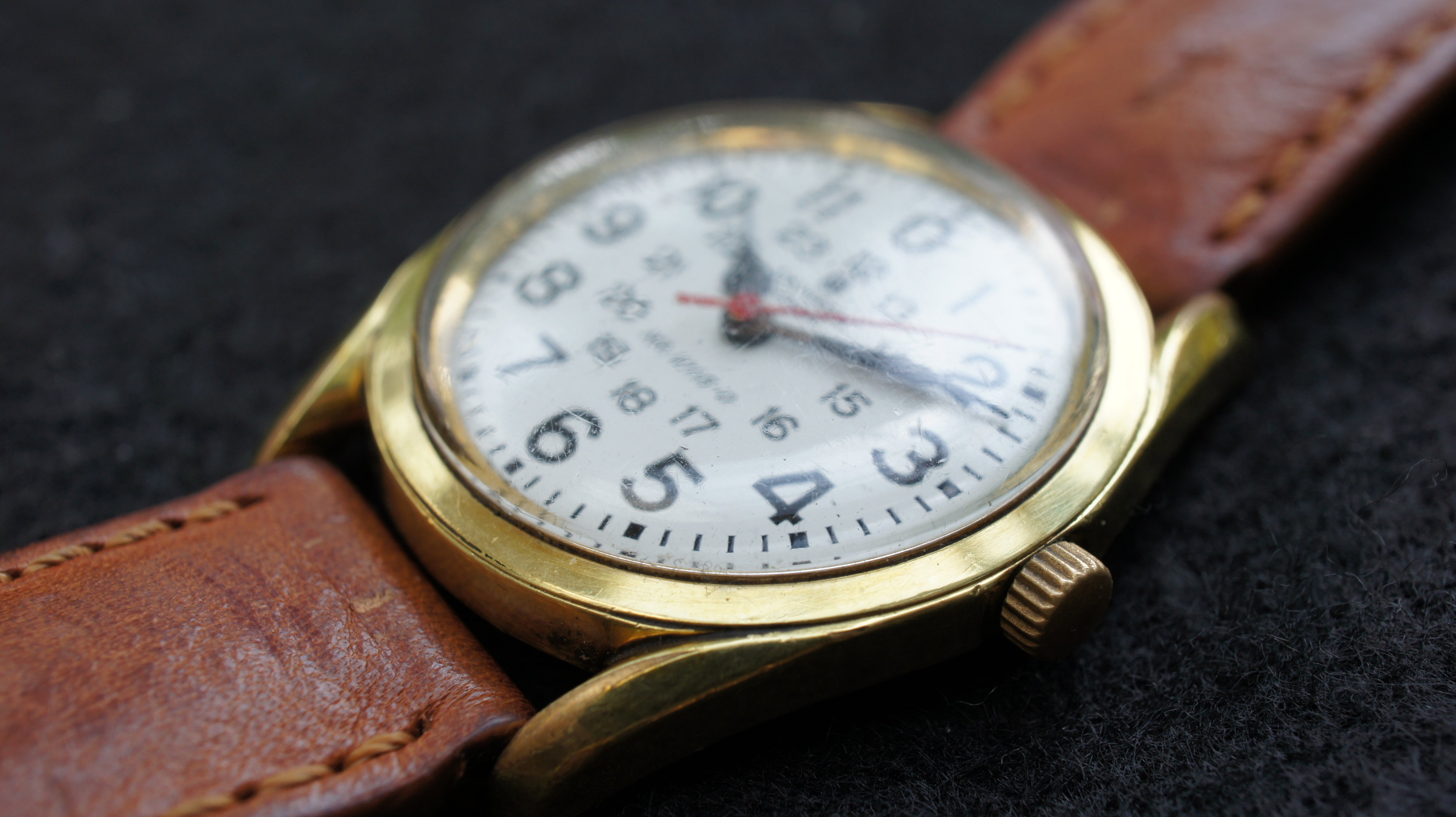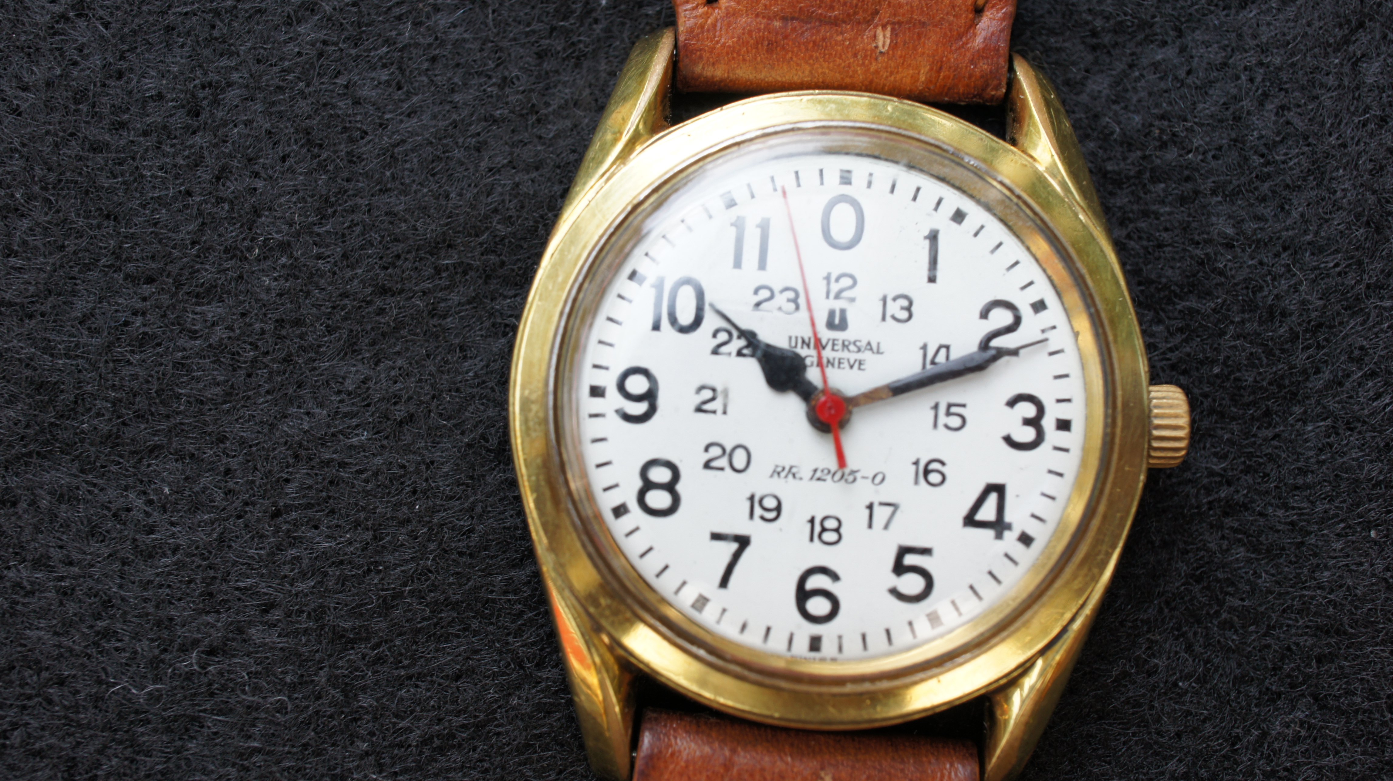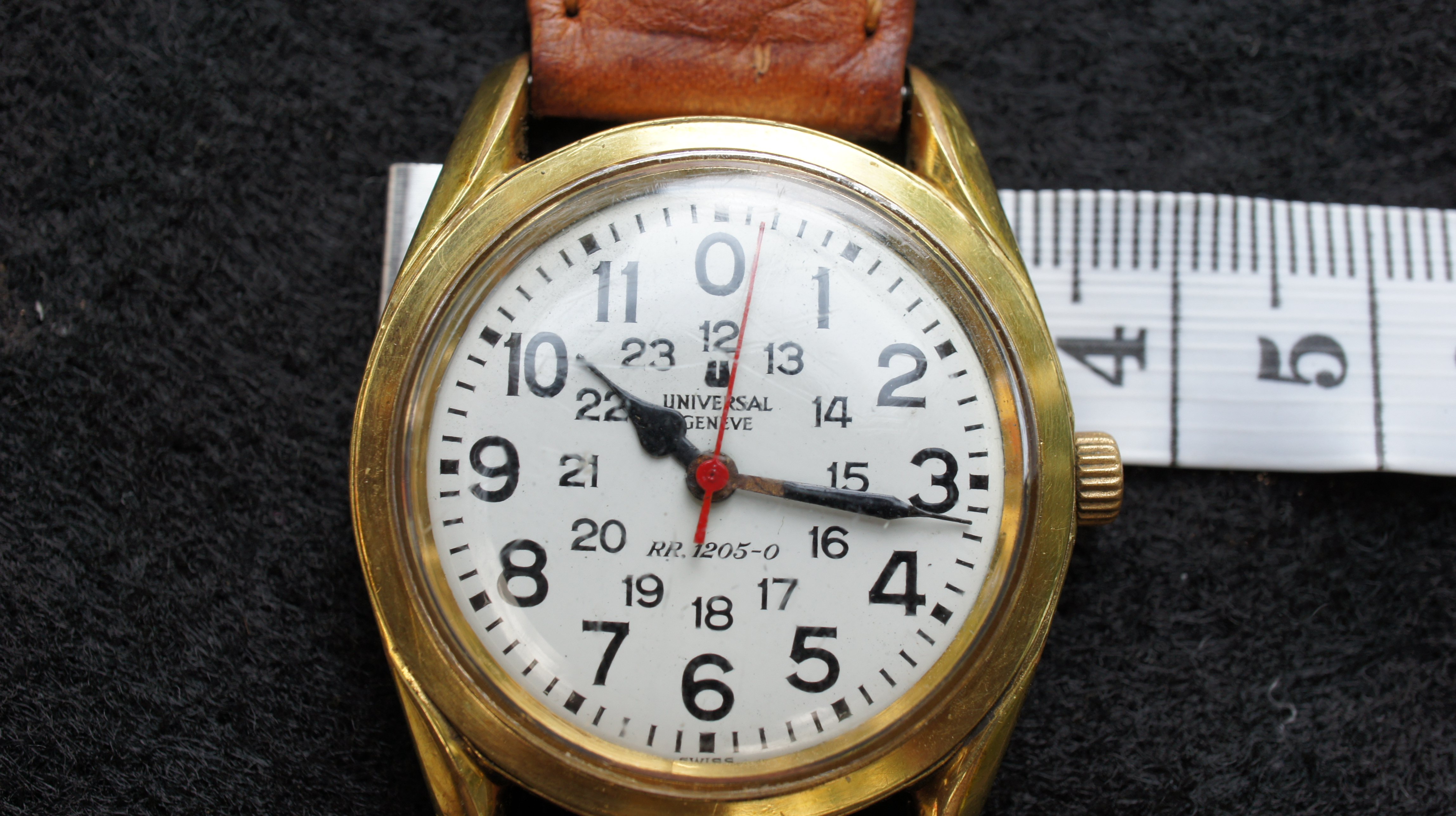 ·This circa 1960's vintage Universal Geneve Railrouter 1205-0 was made for the Canadian National Railways. Universal caliber 65, with hacking. Gold-filled 35mm case excluding crown. Signature dial with "0" at 12 o'clock, as specified by CNR. Watch is running, however service is recommended as it's running slow a few minutes per day when I last checked. Watch is all original with some lacquer loss on the minute hand and some wear on the gold lugs. Dial is excellent. This is the same Polerouter case, but much rarer Railrouter dial. These CNR-issued watches are rare and were produced in small batches. REDUCED US$625, includes paypal and shipping Canada/US.
