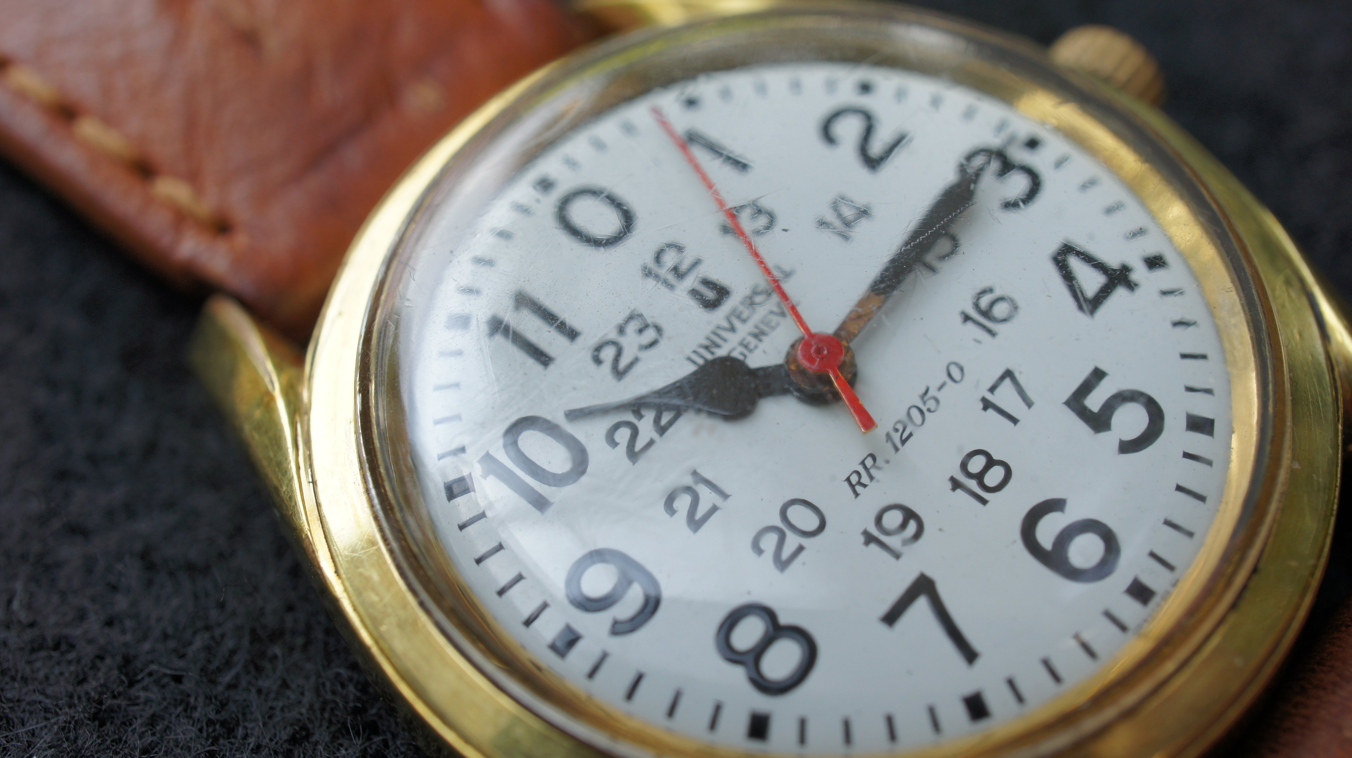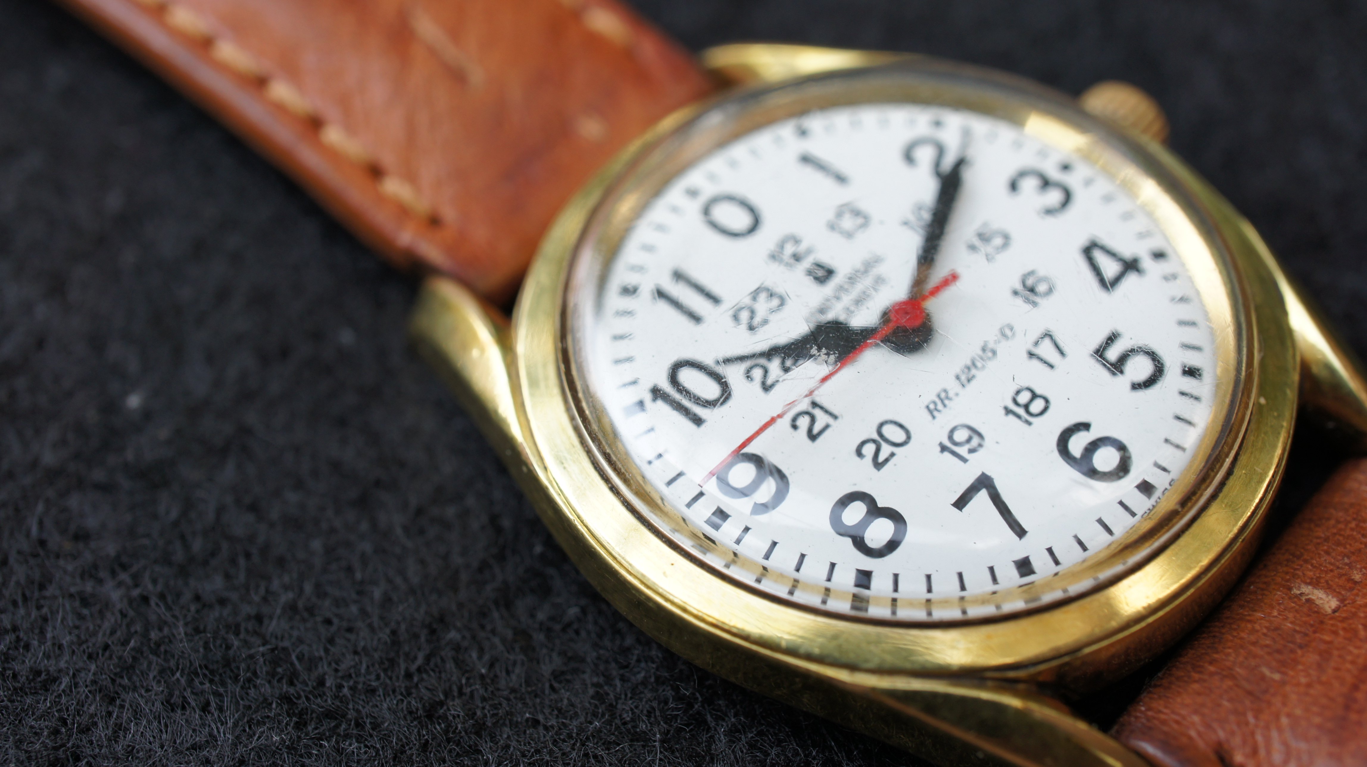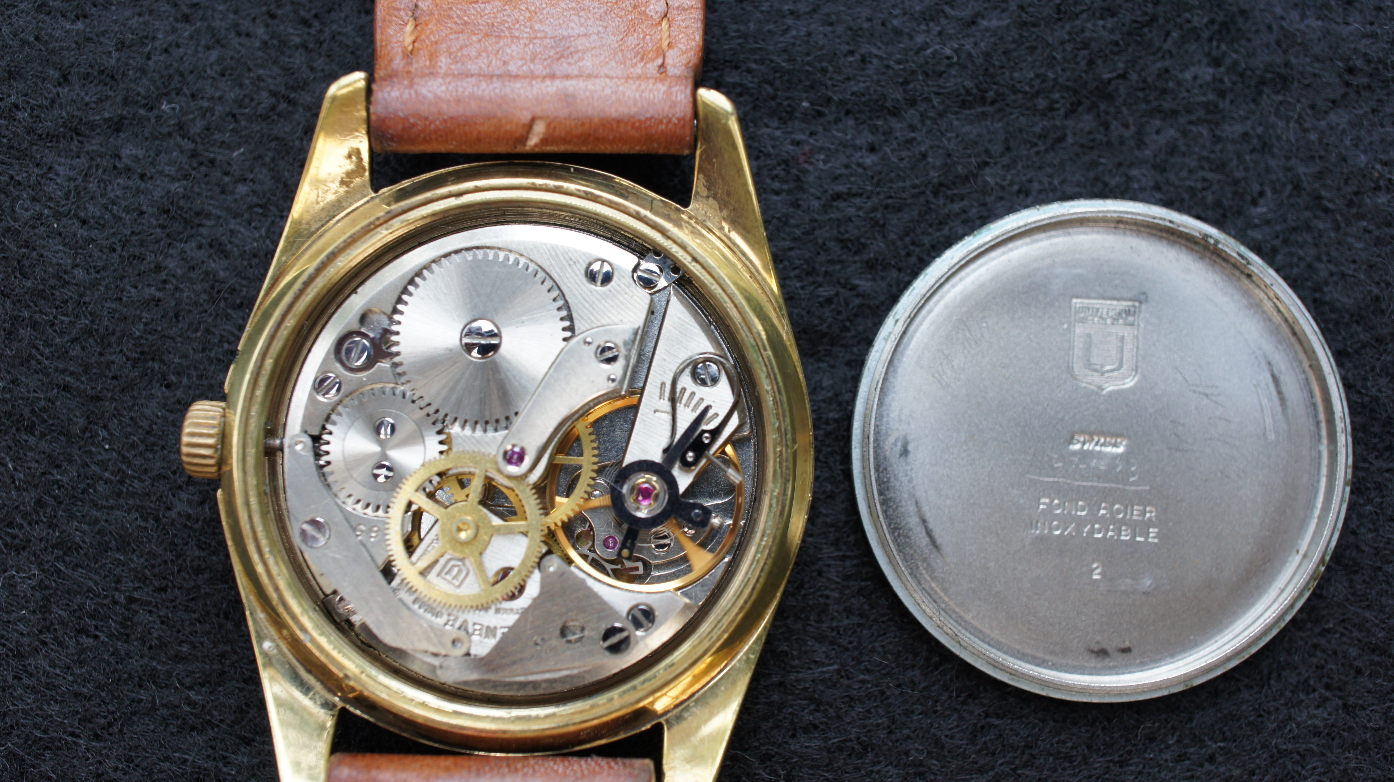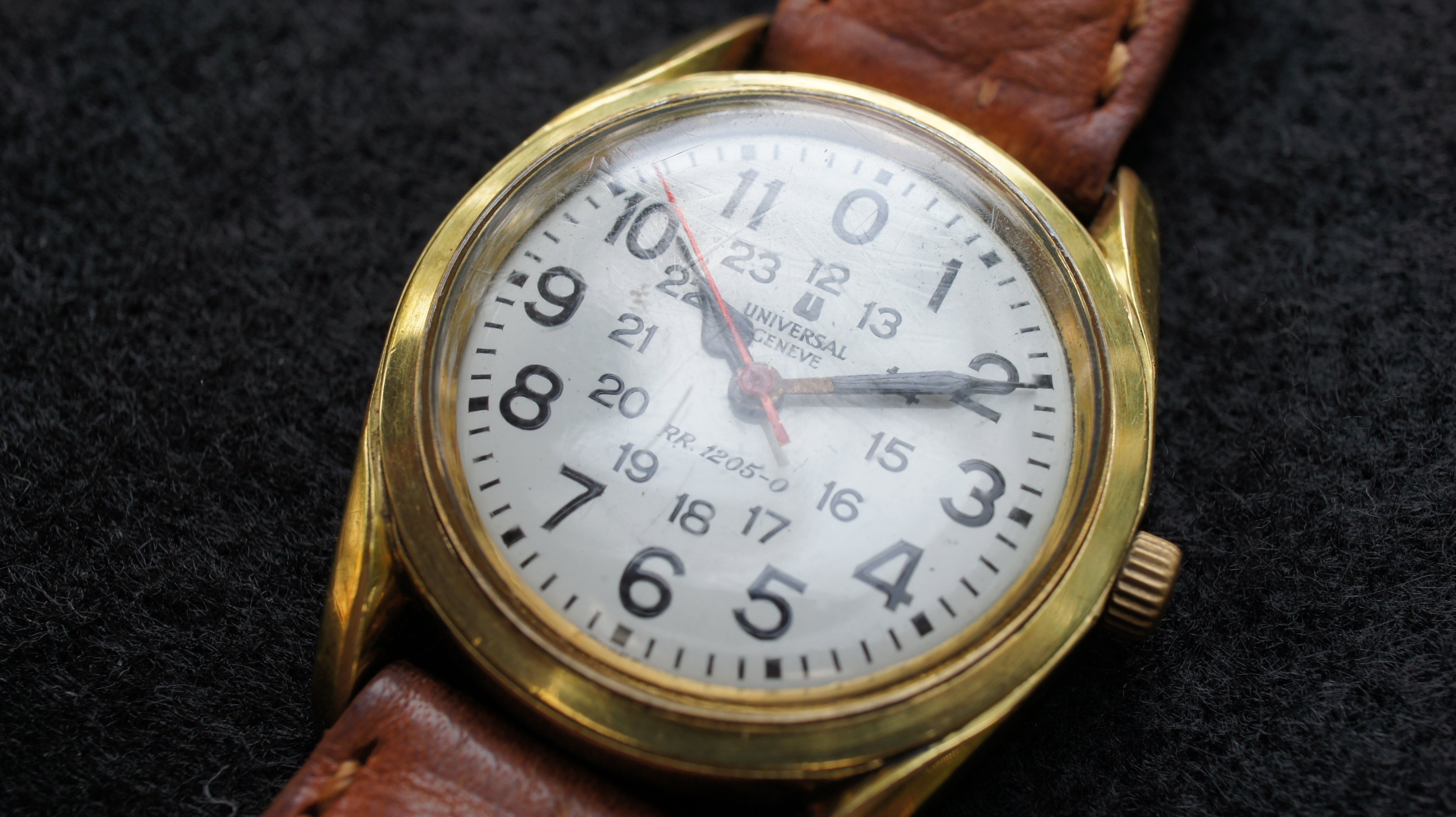 ·This circa 1960's vintage Universal Geneve Railrouter 1205-0 was made for the Canadian National Railways. Universal caliber 65, with hacking. Gold-filled 35mm case excluding crown. Signature dial with "0" at 12 o'clock, as specified by CNR. Watch is running, however service is recommended as it's running slow a few minutes per day when I last checked. Watch is all original with some lacquer loss on the minute hand and some wear on the gold lugs. Dial is excellent. This is the same Polerouter case, but much rarer Railrouter dial. These CNR-issued watches are rare and were produced in small batches. REDUCED US$625, includes paypal and shipping Canada/US.