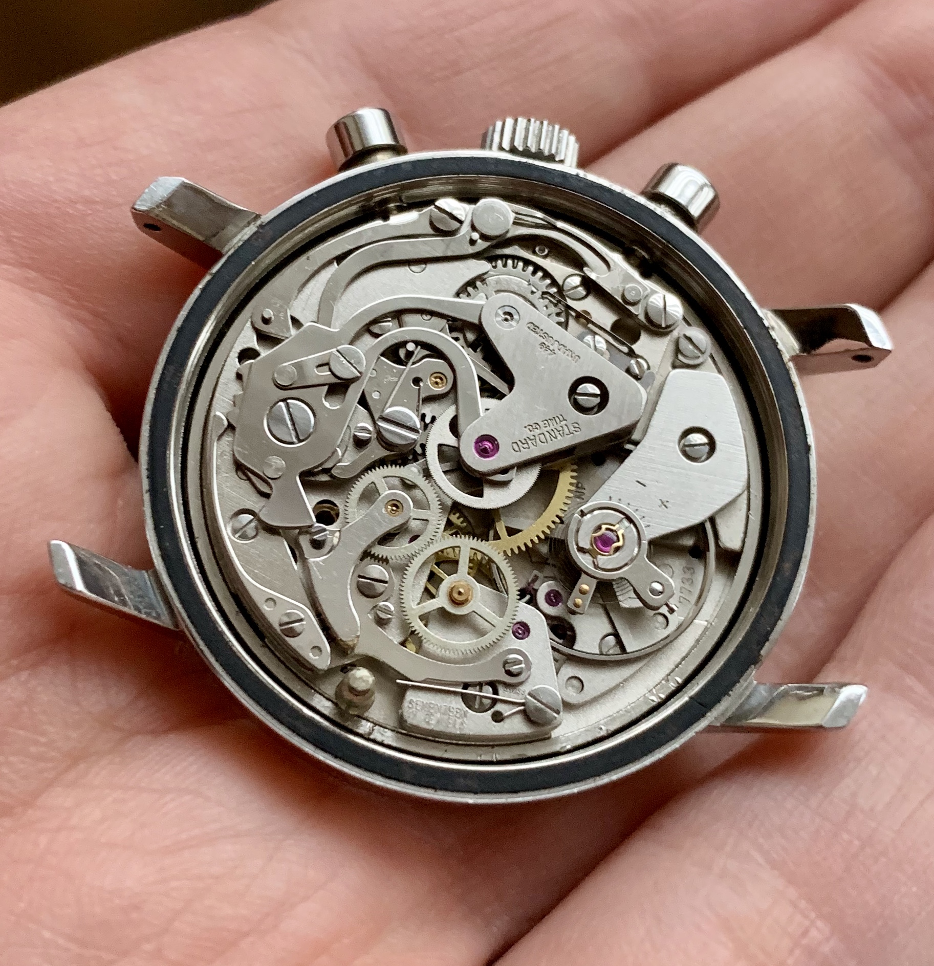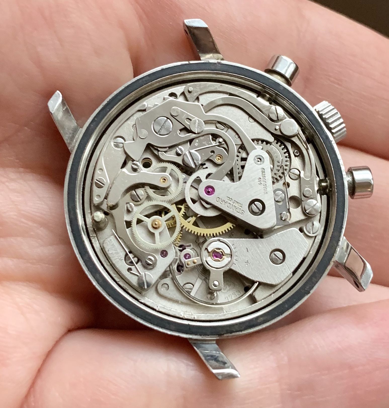 Inside is a manually wound valjoux 7733 movement, which was serviced by the previous owner in 2018 (service receipt will be provided with the sale).
