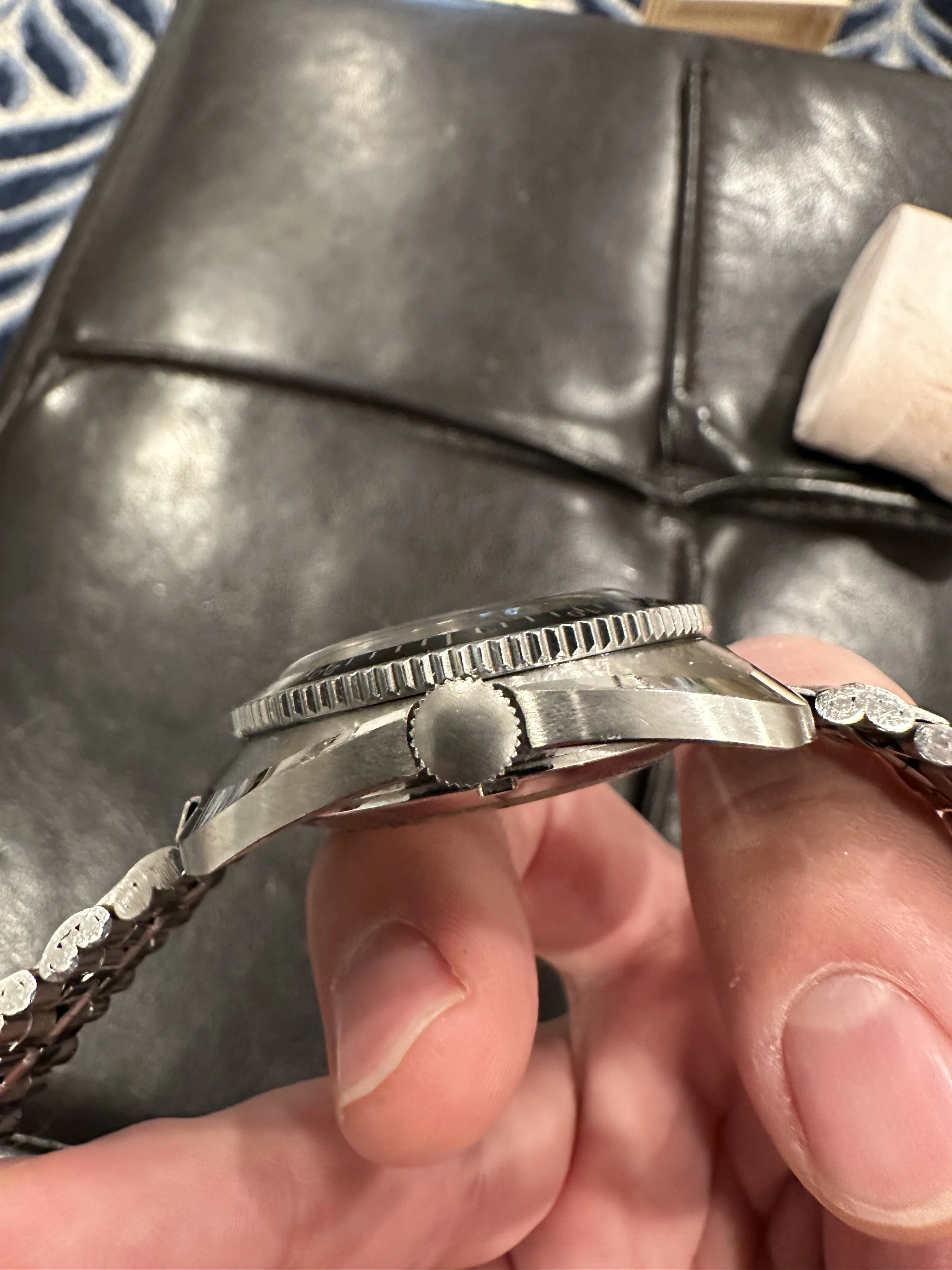Case is about 36mm in unpolished condition with clear and crisp brushing/polished areas. Caseback sticker is still intact. Bezel is fixed in place.