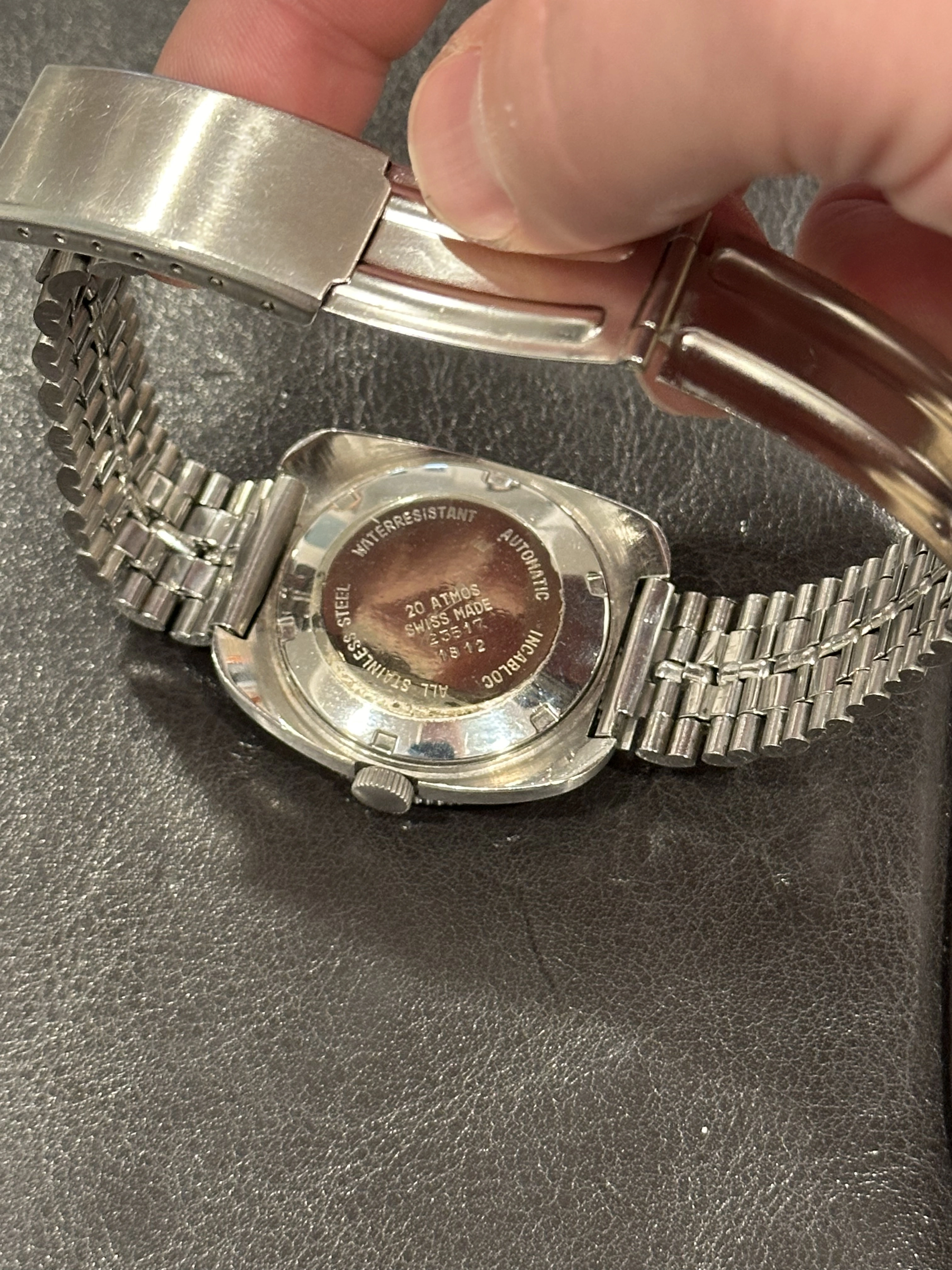 Obviously the sunburst blue dial is the star of the show. Hands and tritium markers have an even, pleasing patina. Double quickset day/date functions without issue.
