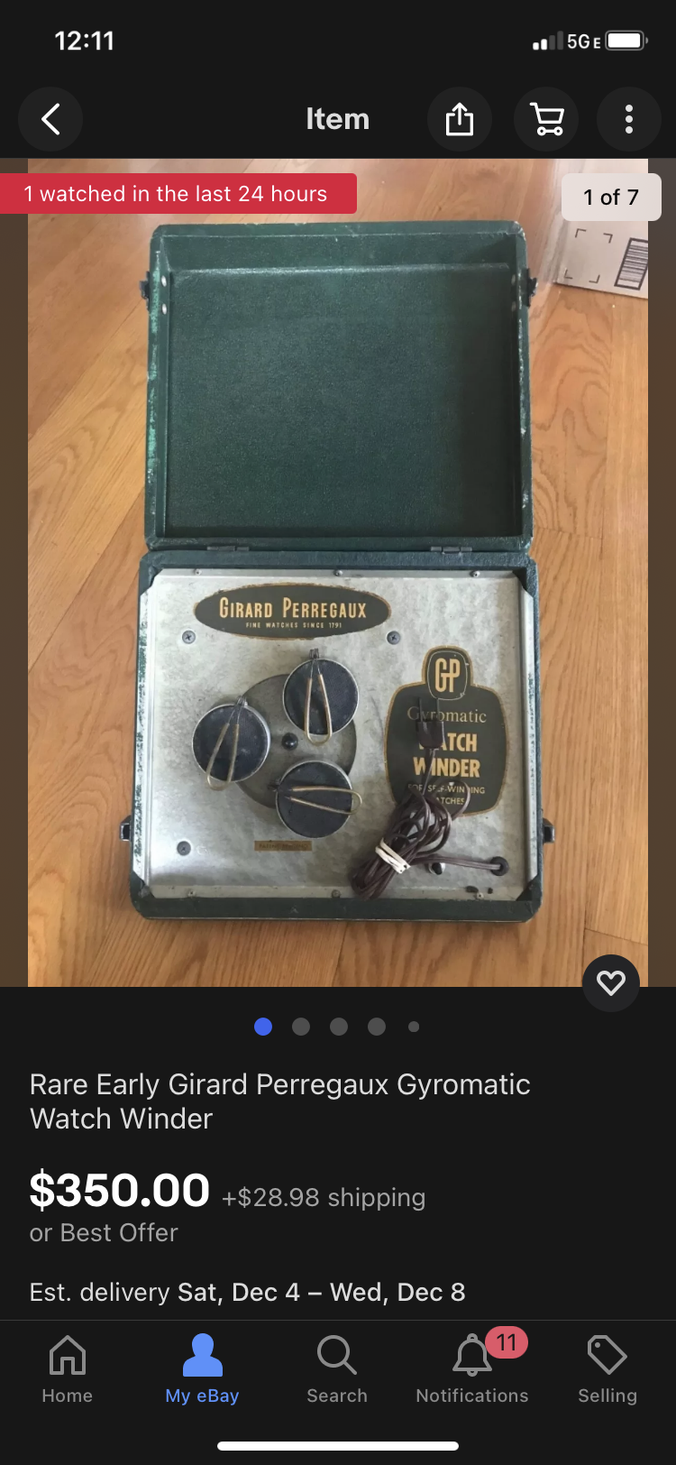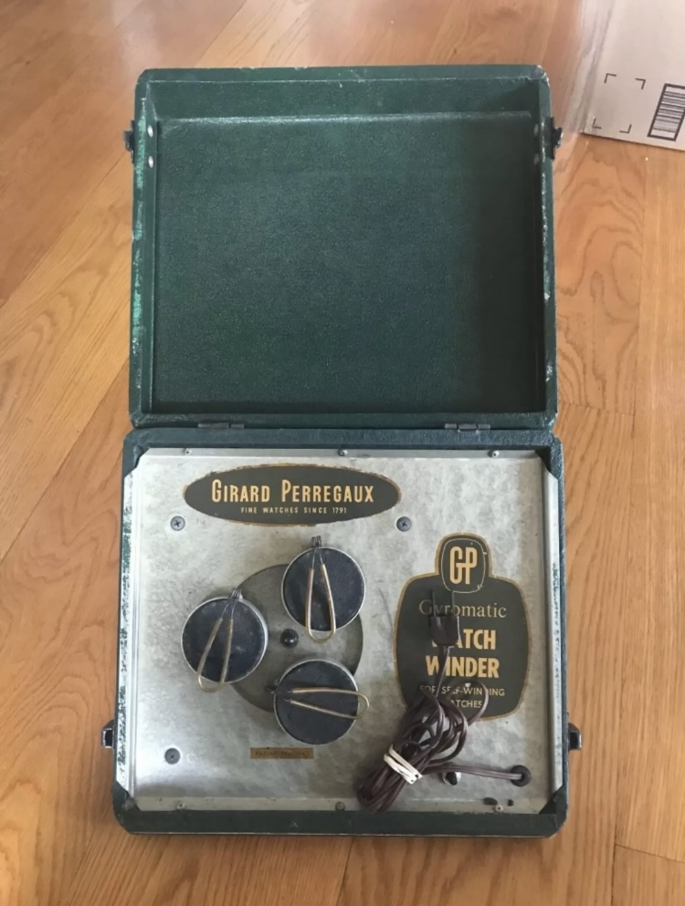 Girard Perregaux watch winder. I have never given thought to the history of the automatic watch winder, but this must be fairly early. Judging from the materials and style, I would guess it’s late 40’s/early 50’s. Seller doesn’t say if it’s working or not, and I have no clue on value of such a thing- but it’s cool. And the seller is accepting offers.