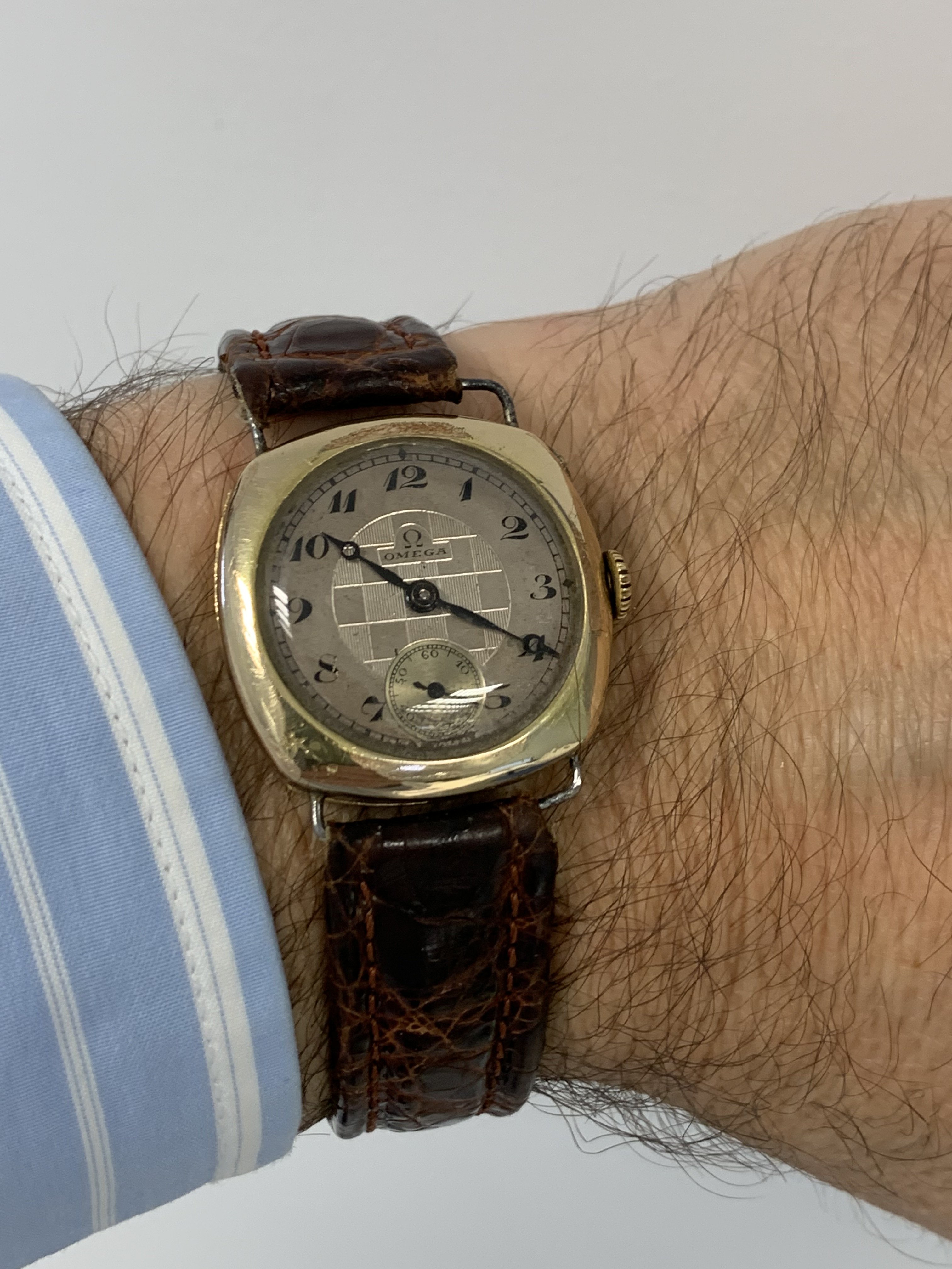 I have a 1920.s cushion case, chess dial gold plated Omega that belonged to my grandfaher. It was given as a engagement present from my grandmother to him around 1930. It was given to me by my father when I started Medical School back in 1981, and have had it all this years but have never used it on a regular basis until now. It seems to be working OK after having it serviced at my local Watchmaker and a few fiddles that maybe I shouldn´t have done with the speed regulator