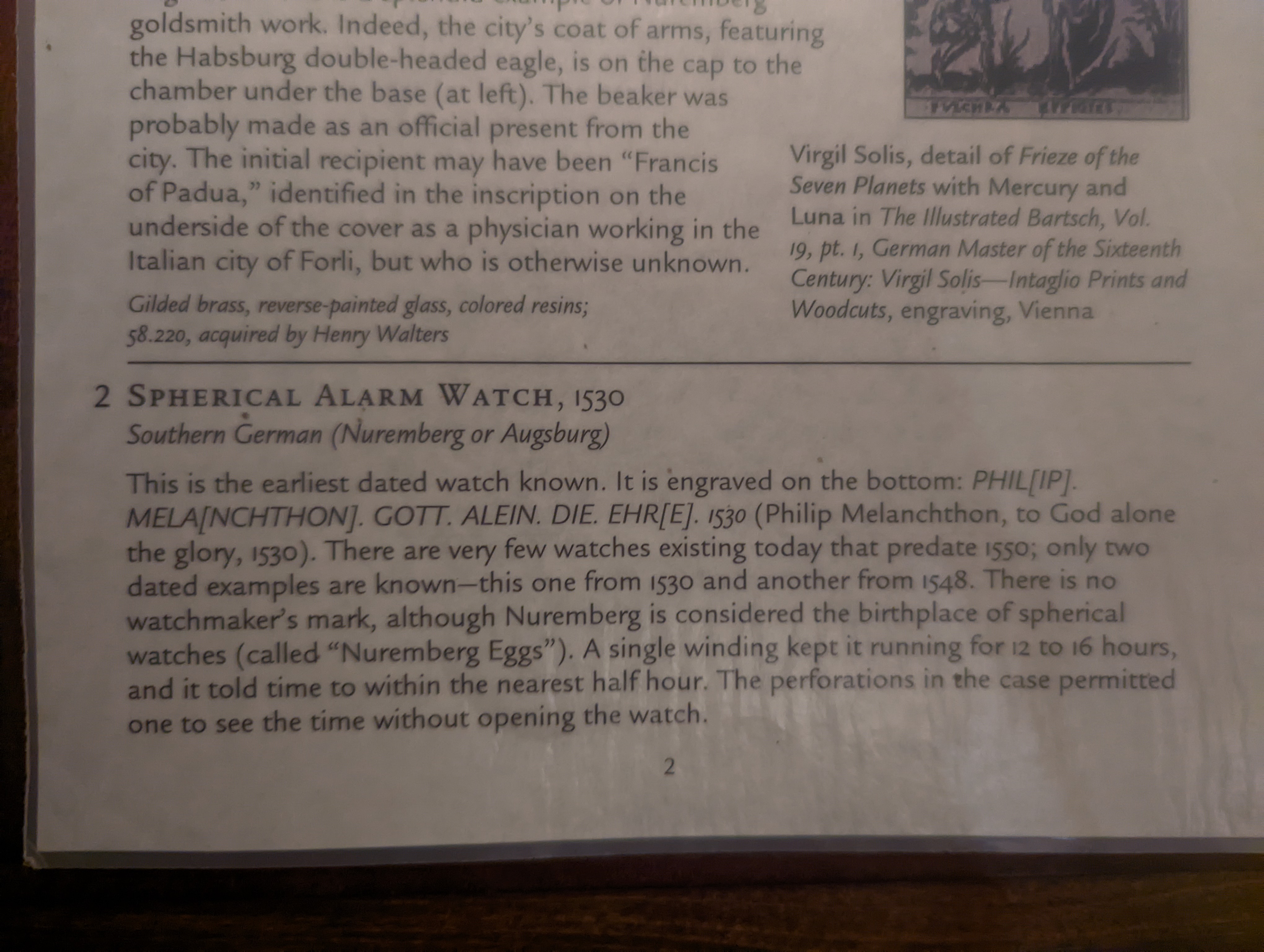 Posts 3,617 Likes 24,373 Dsloan ·Mar 19, 2023 Does this count? Hanging around the Walters Art Museum in Baltimore today. I've noticed this watch a few times but actually stopped to read the info today, and it seems they claim this is the earliest known dated 'watch'.