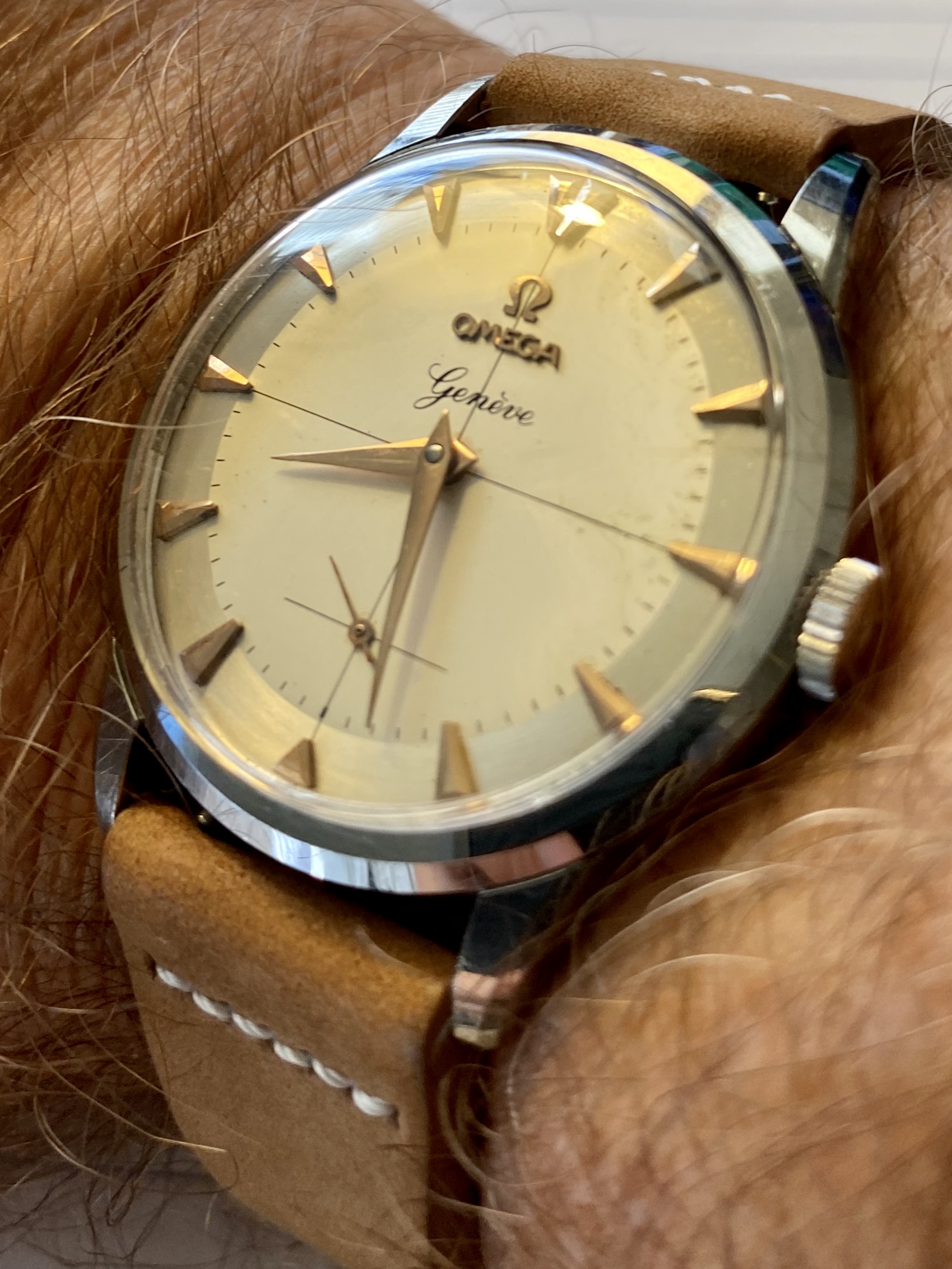 Posts 9,741 Likes 54,500 gbesq 路Aug 12, 2020 1959 Omega Geneve Ref. 2903, caliber 268, crosshair dial with Dauphine hands and rose gold applied indices.