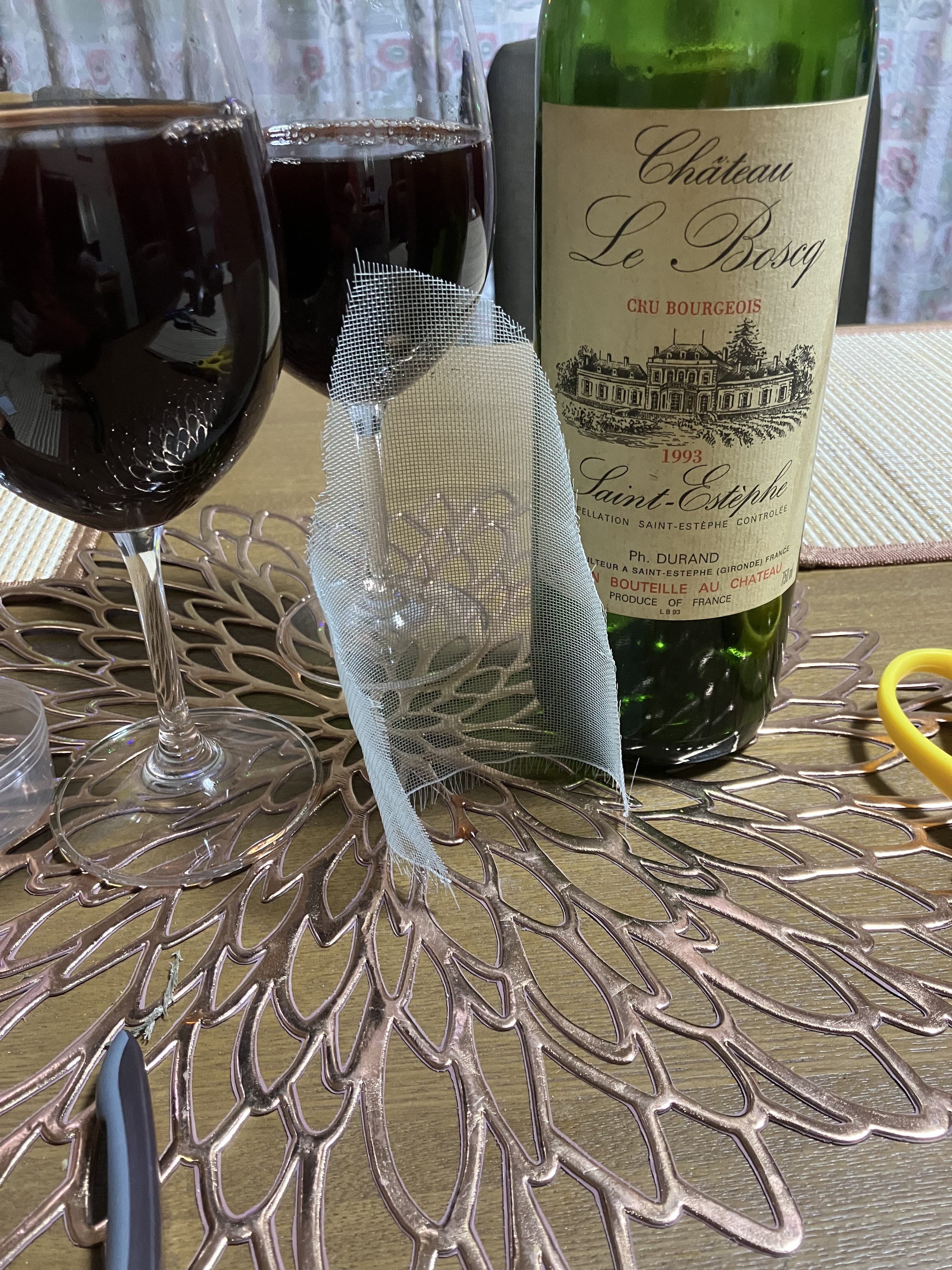 Sadly the cork completely disintegrated and I didn’t have my fancy old-cork remover with me. Nor any strainers or coffee filters, but I remembered that there was some window screen material left over from a repair.