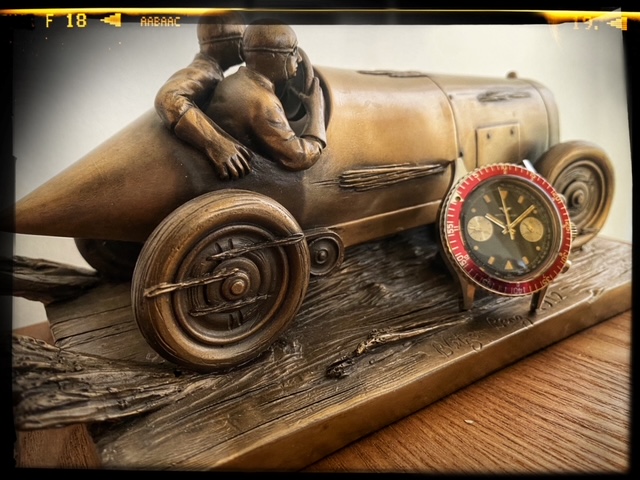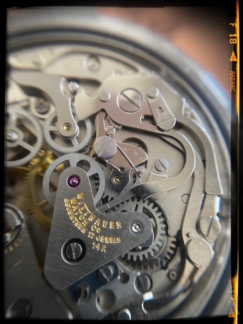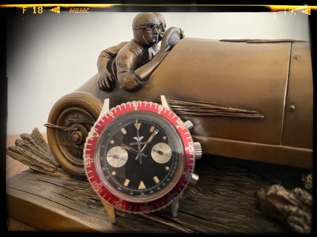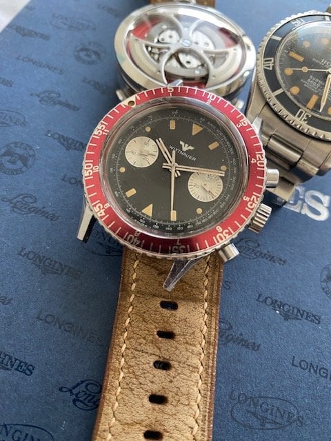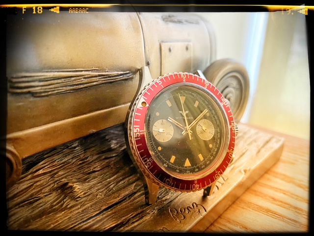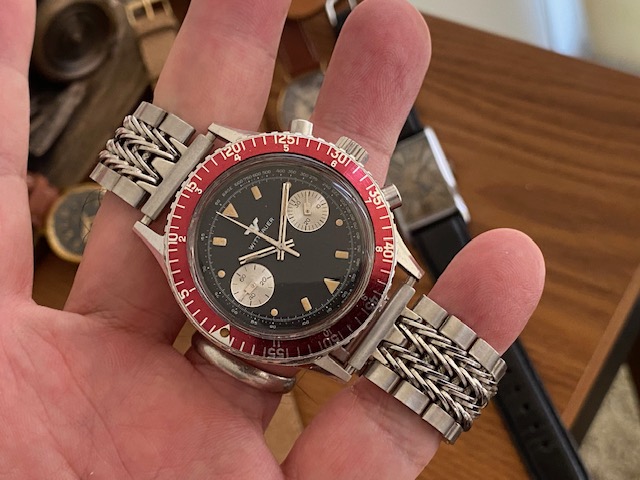 This watch's design sets itself apart with its details. Visually, the first things that stand out are the unusual burgundy-colored bezel. The 40mm stainless steel case houses the Valjoux 7733 movement. The dial has a pair of fairly small chronograph registers with concentric rings and chunky geometric hands, a style very much recognized with the 1970s. Another eye-catching element is the multiple geometric shapes used for the hour markers: You'll find circles, rectangles, and triangles, all beautifully aged.