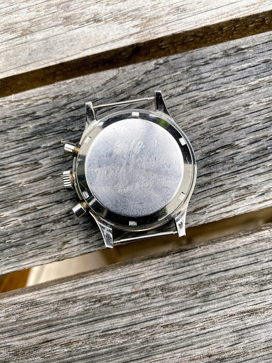 Case: stainless steel, 40mm, 20mm lugs. Case back has an engraving, "Fritz With Love Carol"