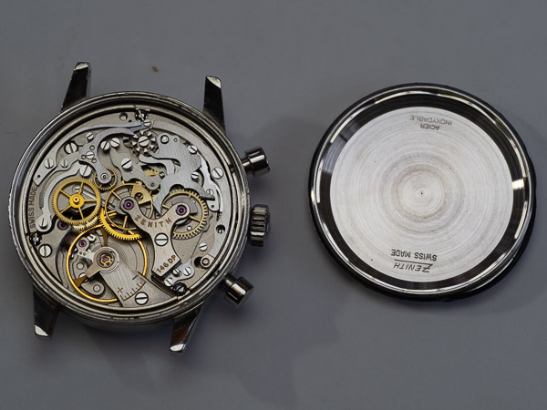 The case is steel and 37mm wide. It has a Zenith 146 DP manual movement
