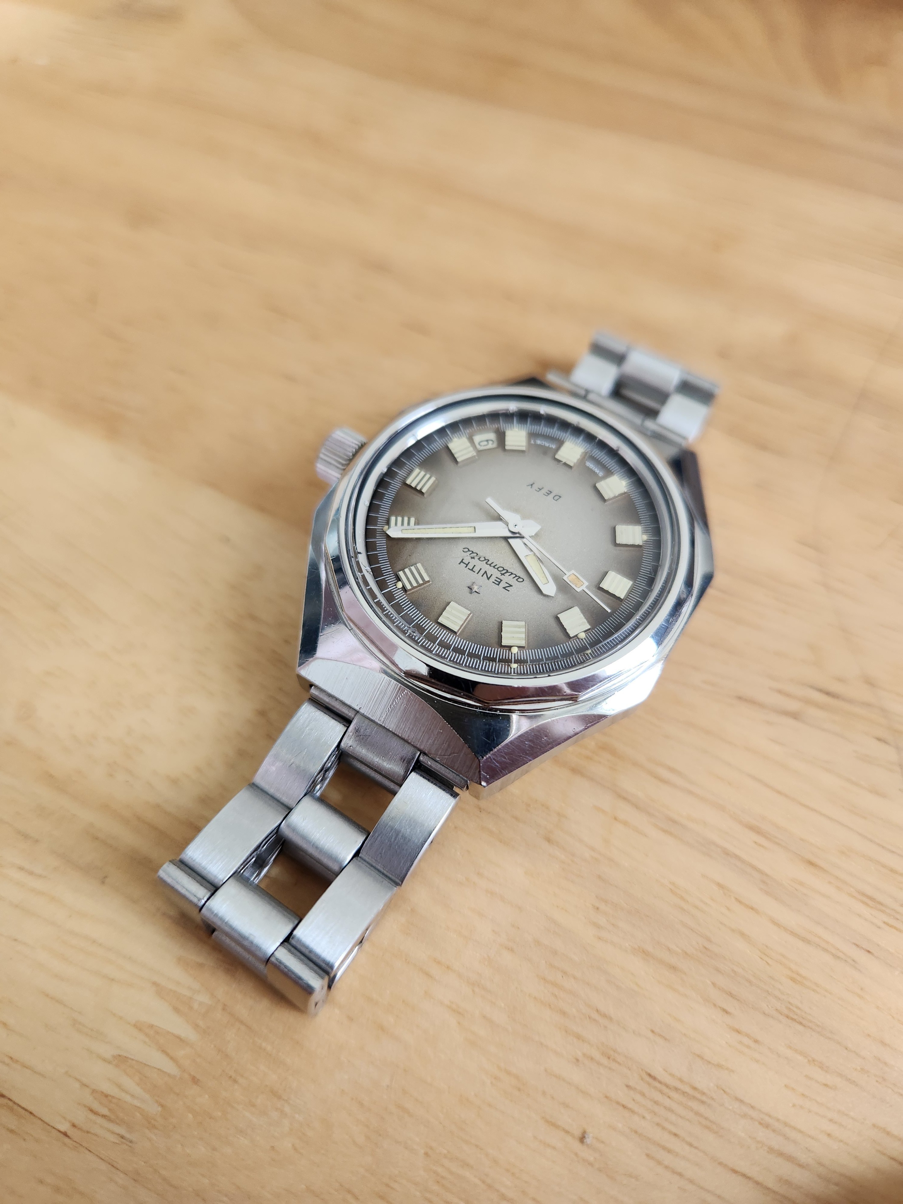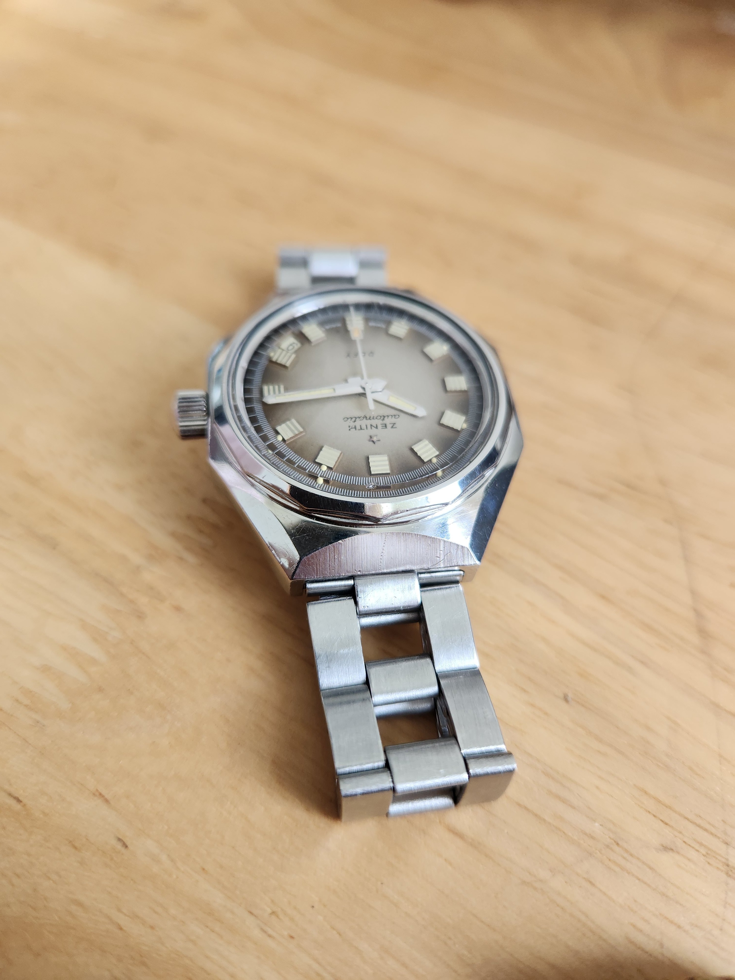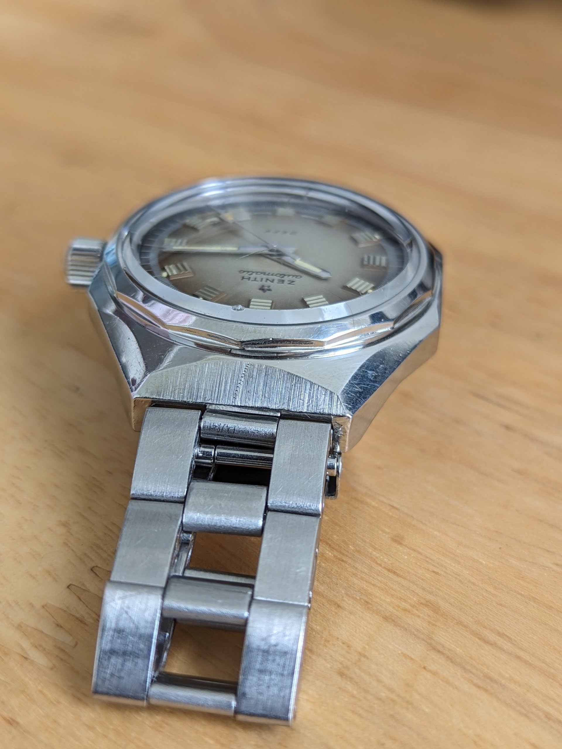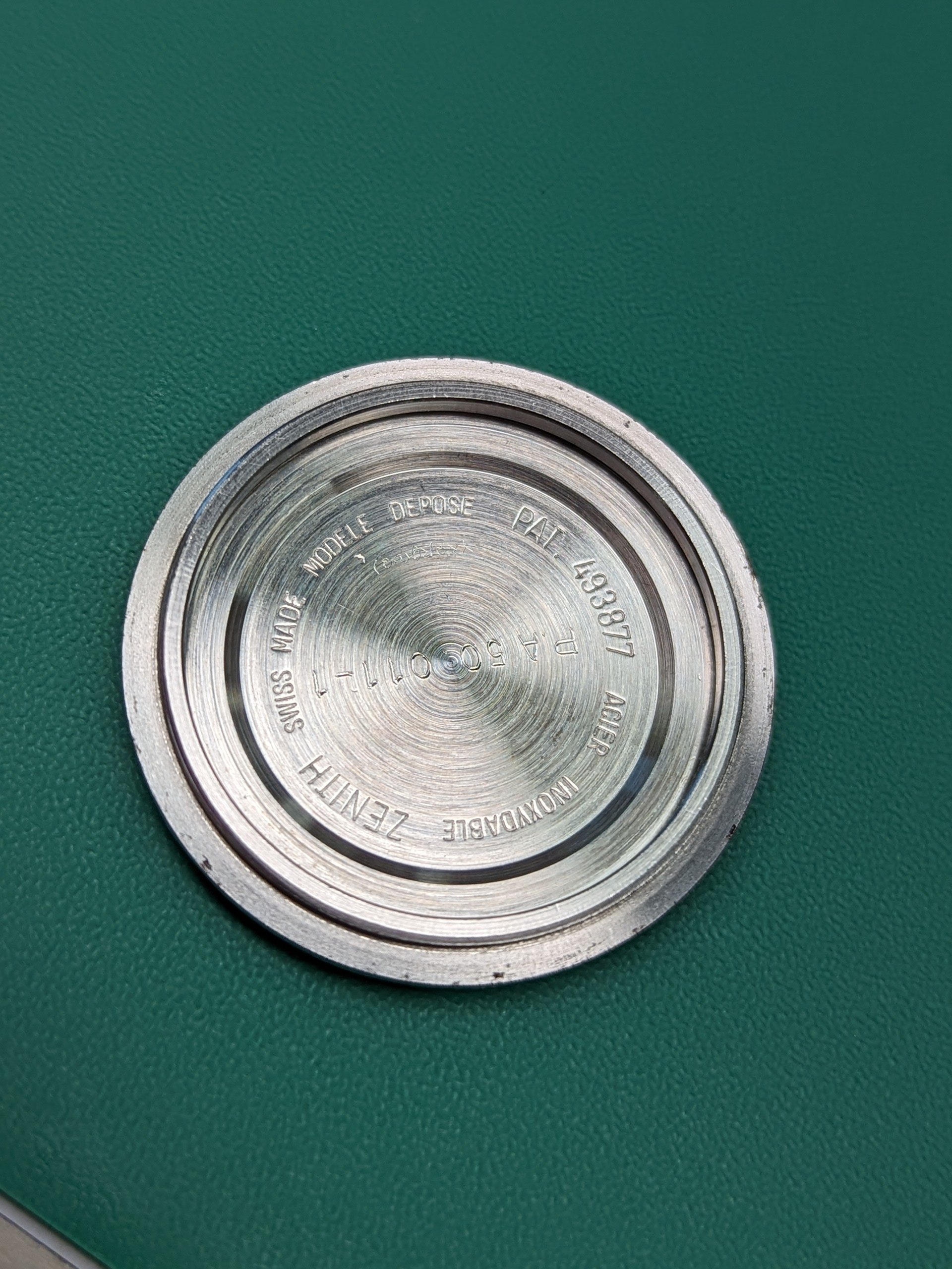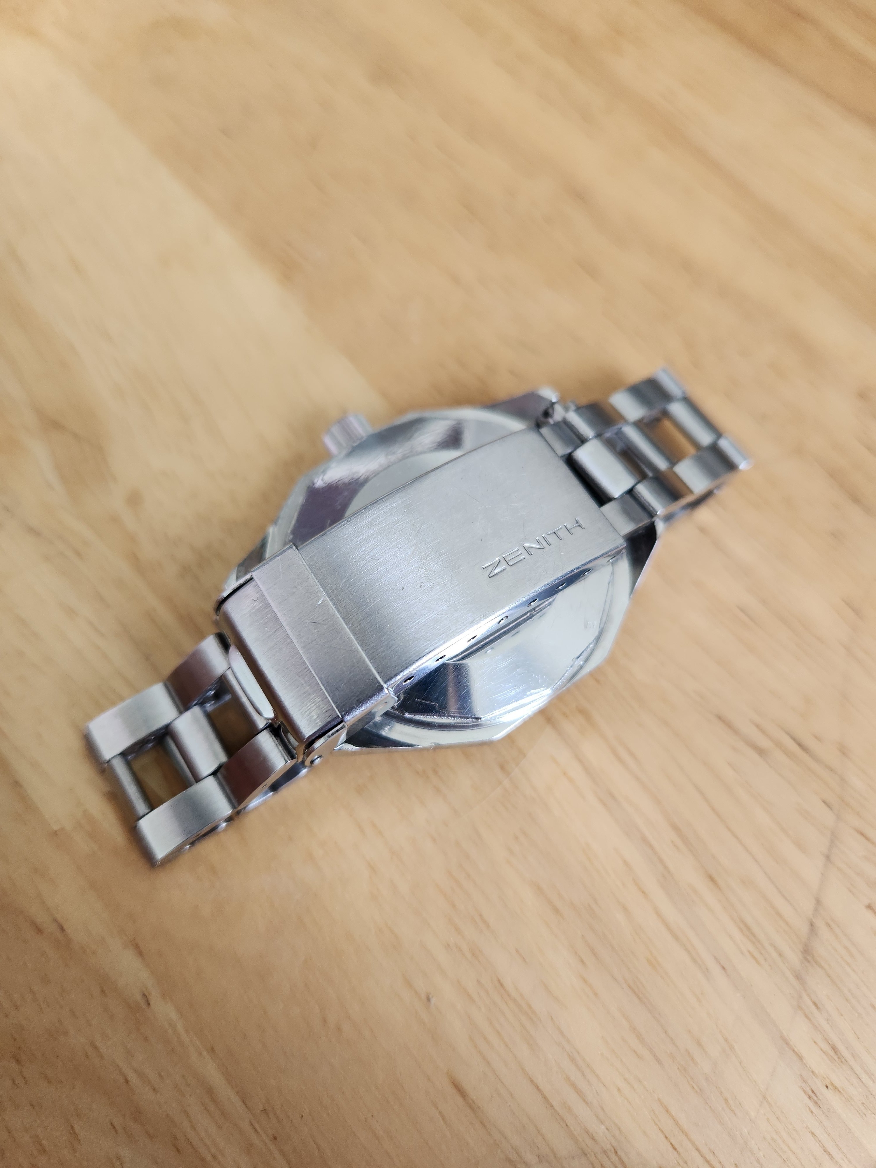 Dial and hands: the dial is in excellent condition. The most noticeable blemish is a dark round spot between the 5 and 6 o'clock marker. All the lume on the dial and the hands is original. The lume on the hands has been stabilized to reduce the risk of it falling out. The condition of the dial and hands are one of the best I've seen on these Zenith models.