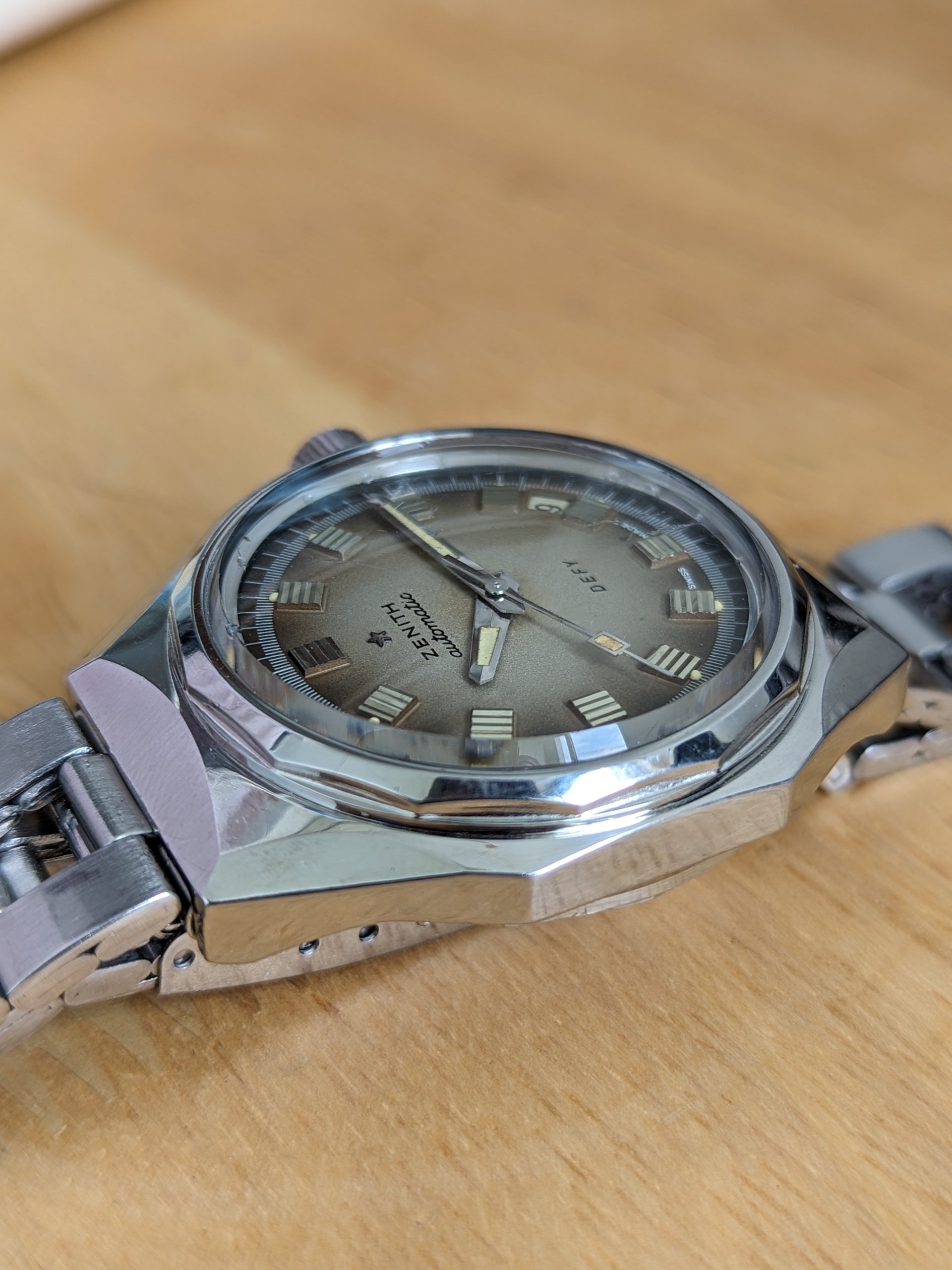 Movement: Zenith Movement 2562PC. This is a non-quickset date automatic movement. Movement is freshly serviced and running very well. The mainspring was changed during the service. I can provide before and after pictures if desired.