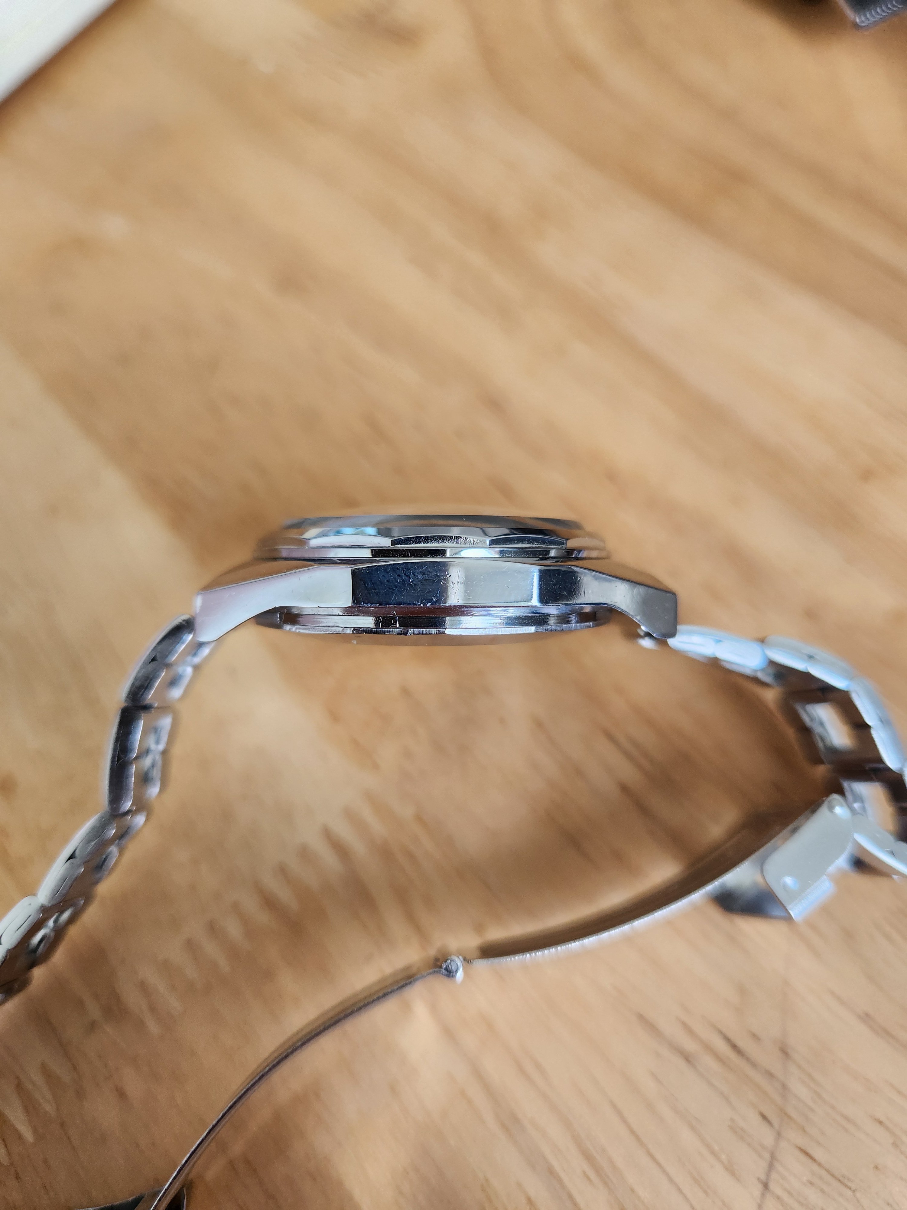 Case: 37mm in well used but good condition. Dents and scratches all over, but the original facets that define this model are clearly there. The original brushed finish can also be see on the top of the lugs. Crystal has several scratches and one chip. Some pitting can be seen on the steel ring surrounding the dial, which is were the original gasket had disintegrated.