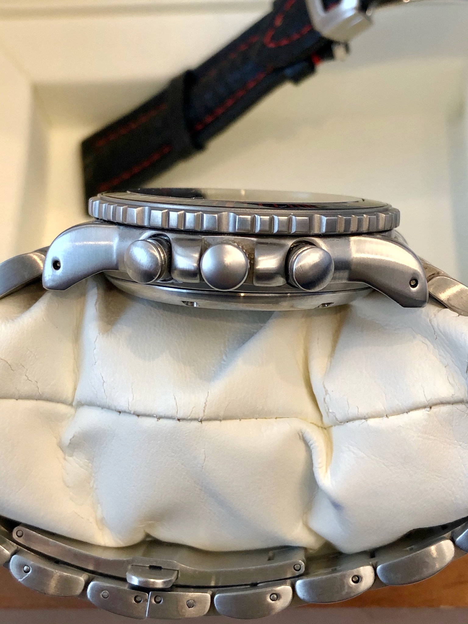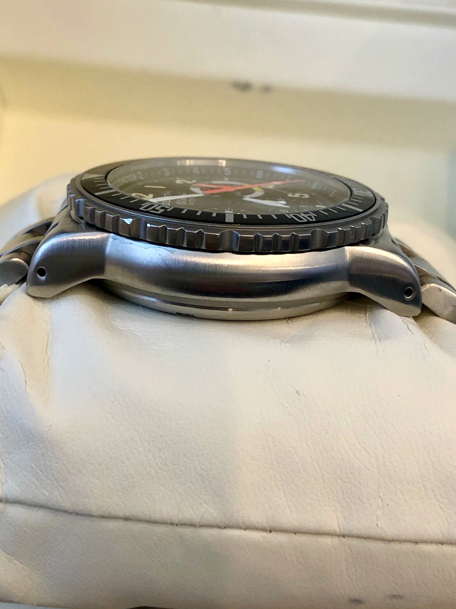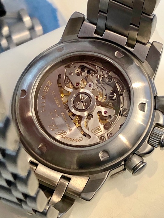 Case & crystal: 40mm brushed stainless steel with screw-down back, bi-directional bezel, and sapphire crystal. Included are both an aftermarket Thomas Priek display case (currently installed) and the original OEM case which still retains a bit of the purplish "goo" that Zenith used to protect new watches from scratches prior to sale. It has obviously been worn sparingly over its life - the case is unpolished and has only minor imperfections from use that are difficult to see without close inspection.